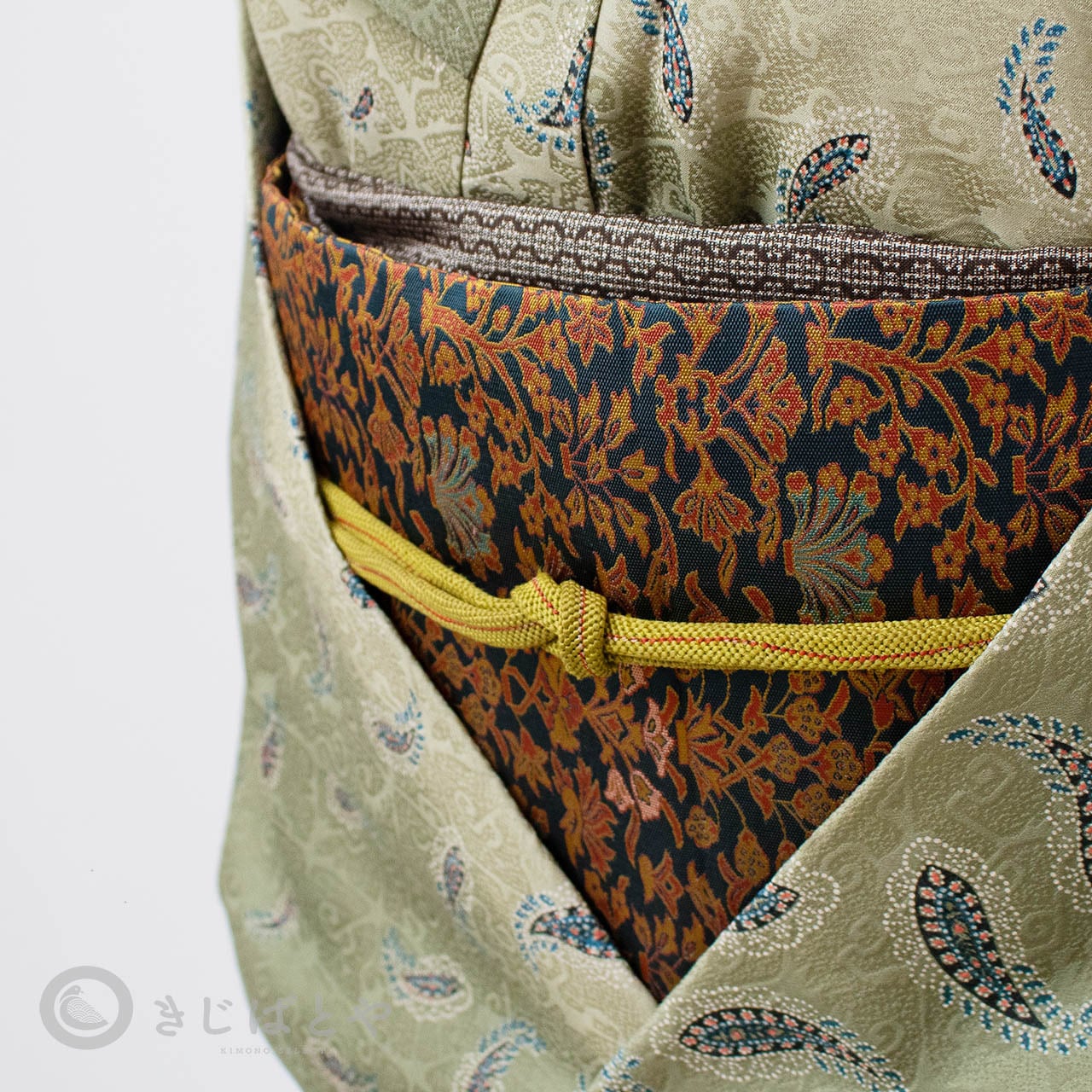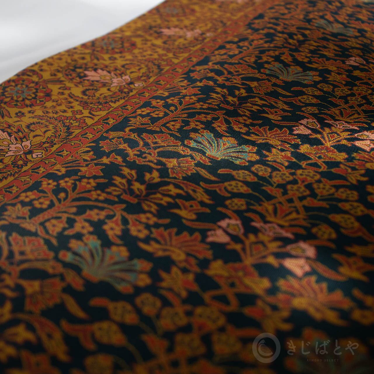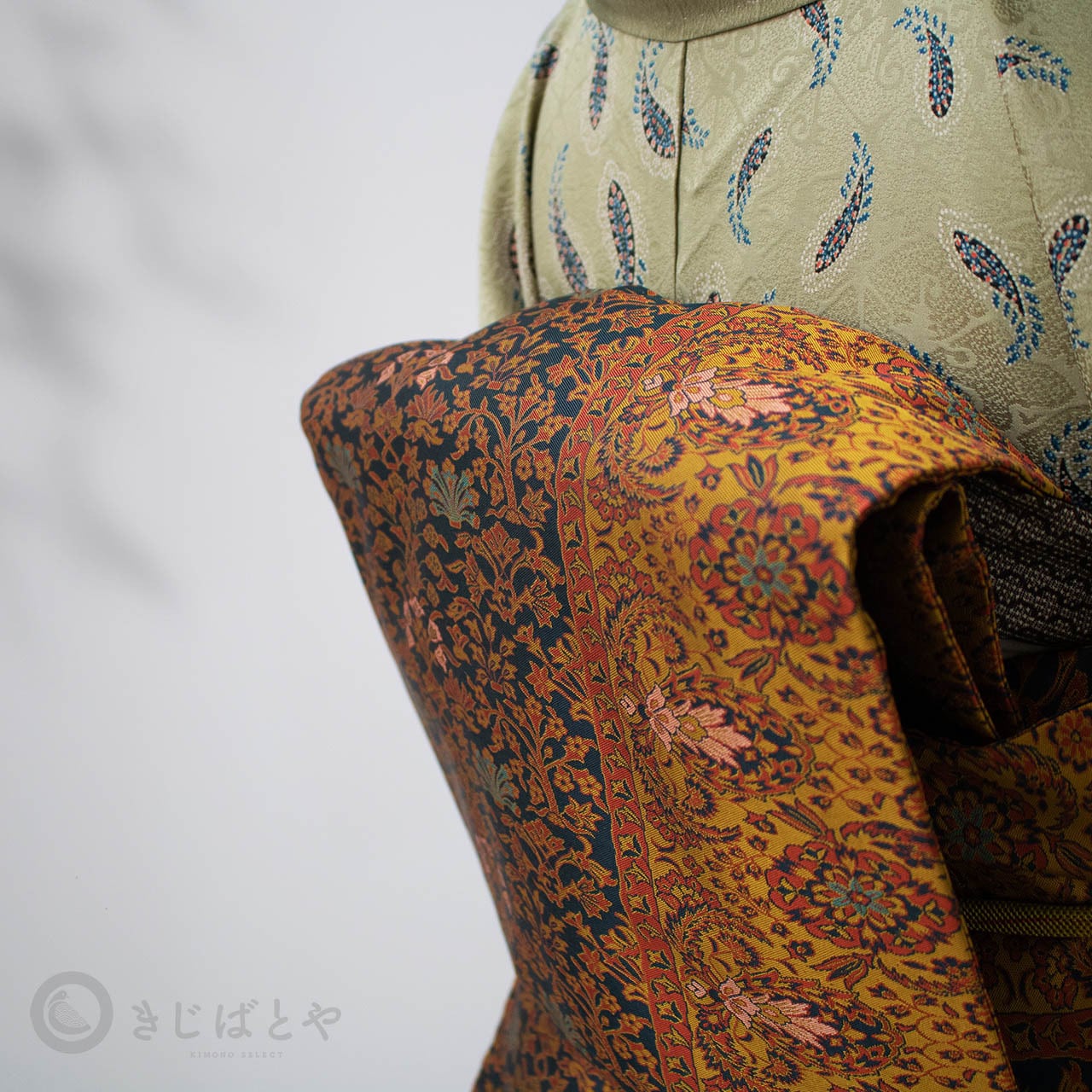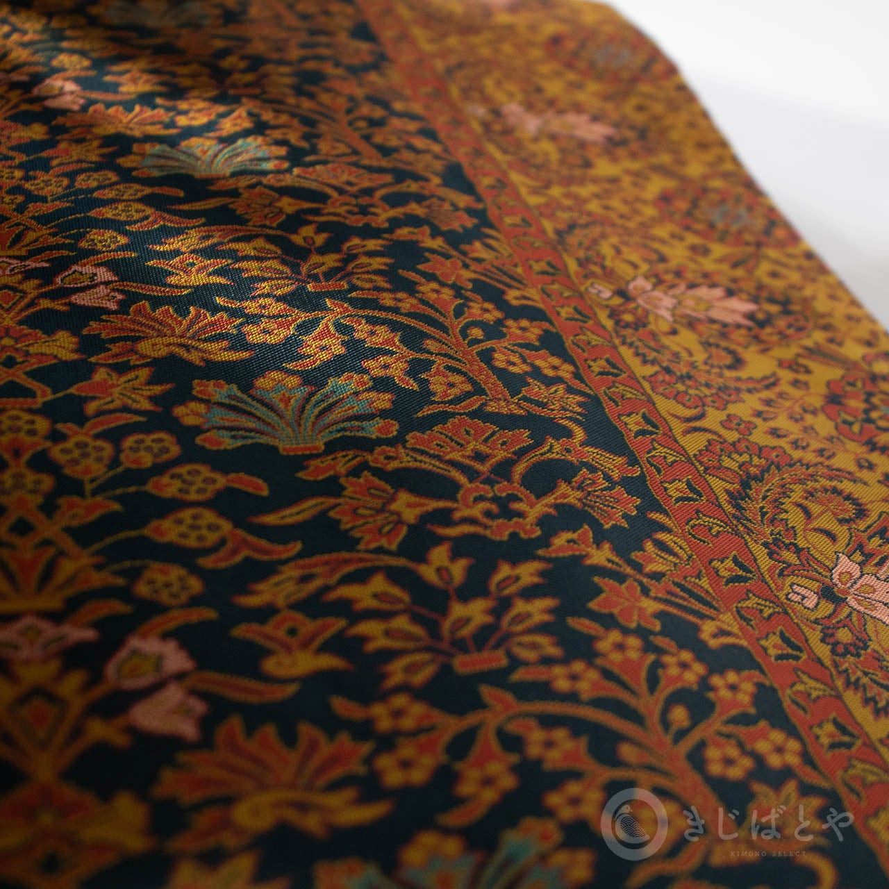 地は海松藍(みるあい:暗い青)と黄櫨色(はじいろ:強い黄)の切り替えになっており、美しい更紗柄が織られています。