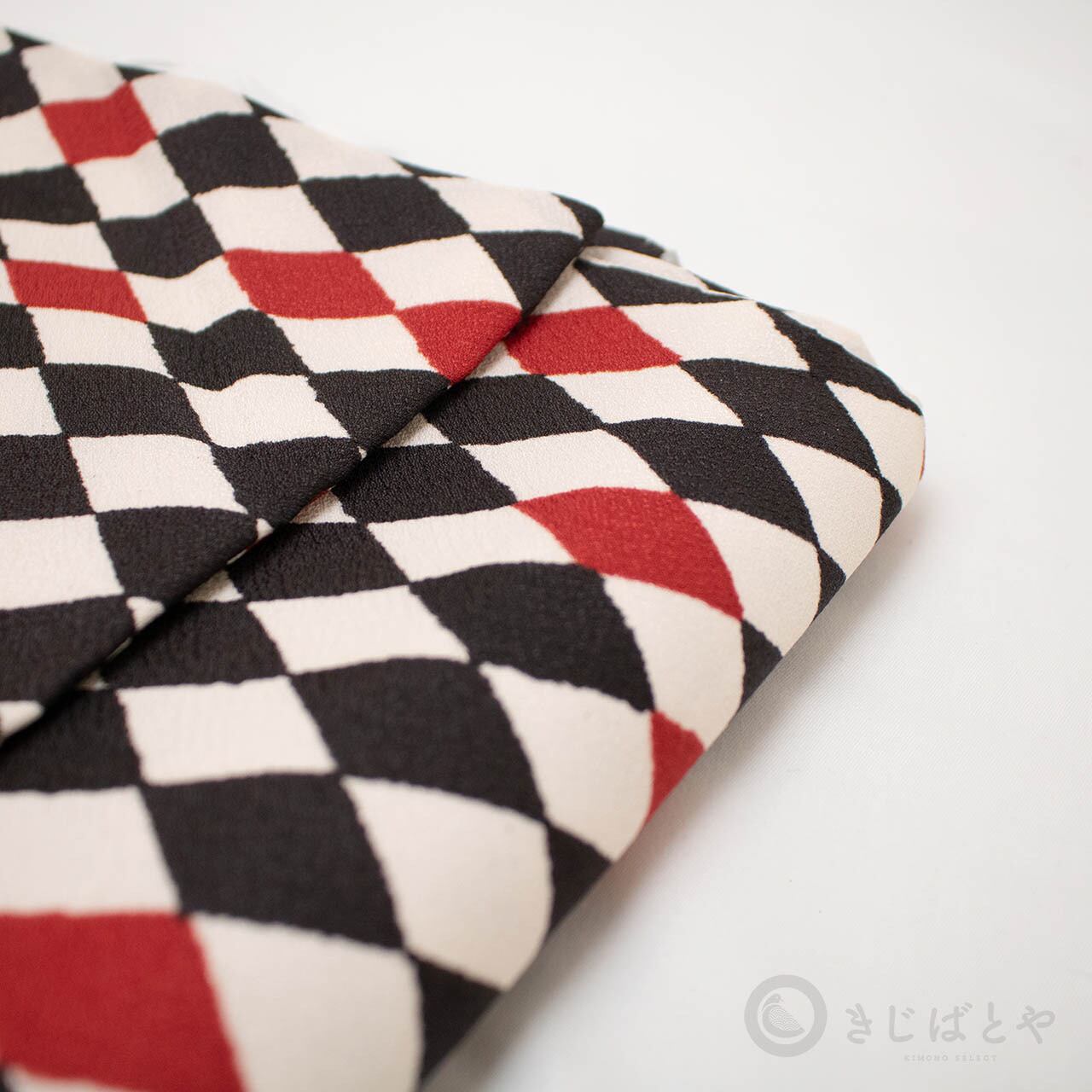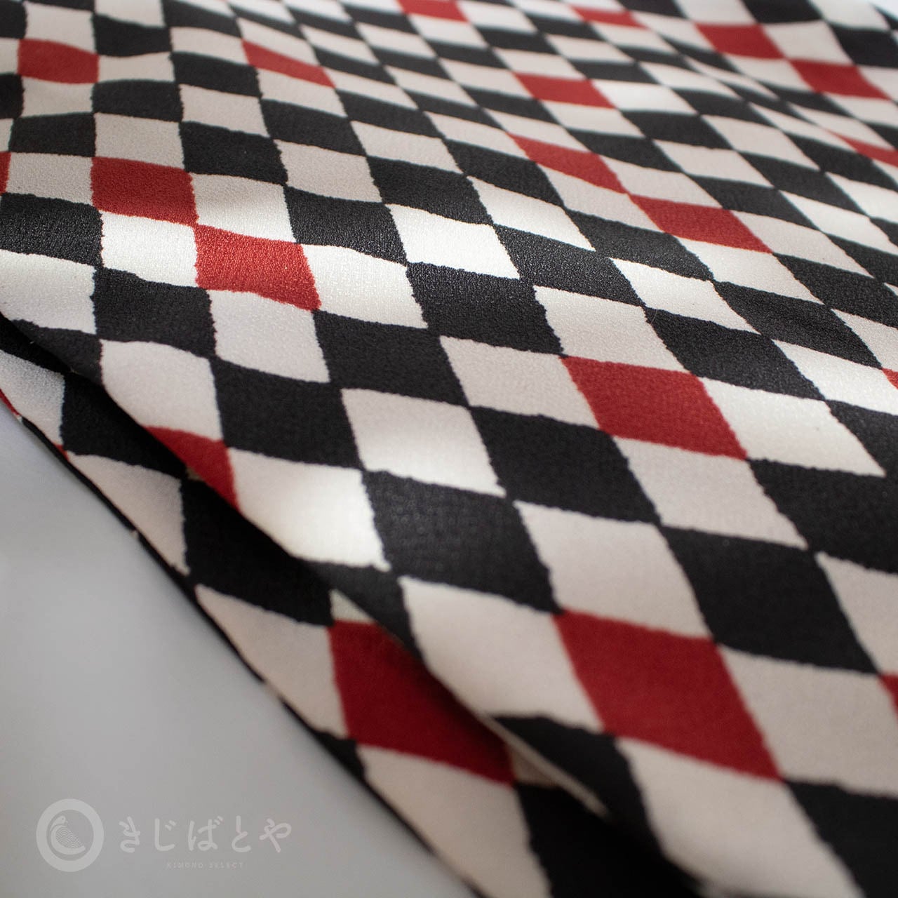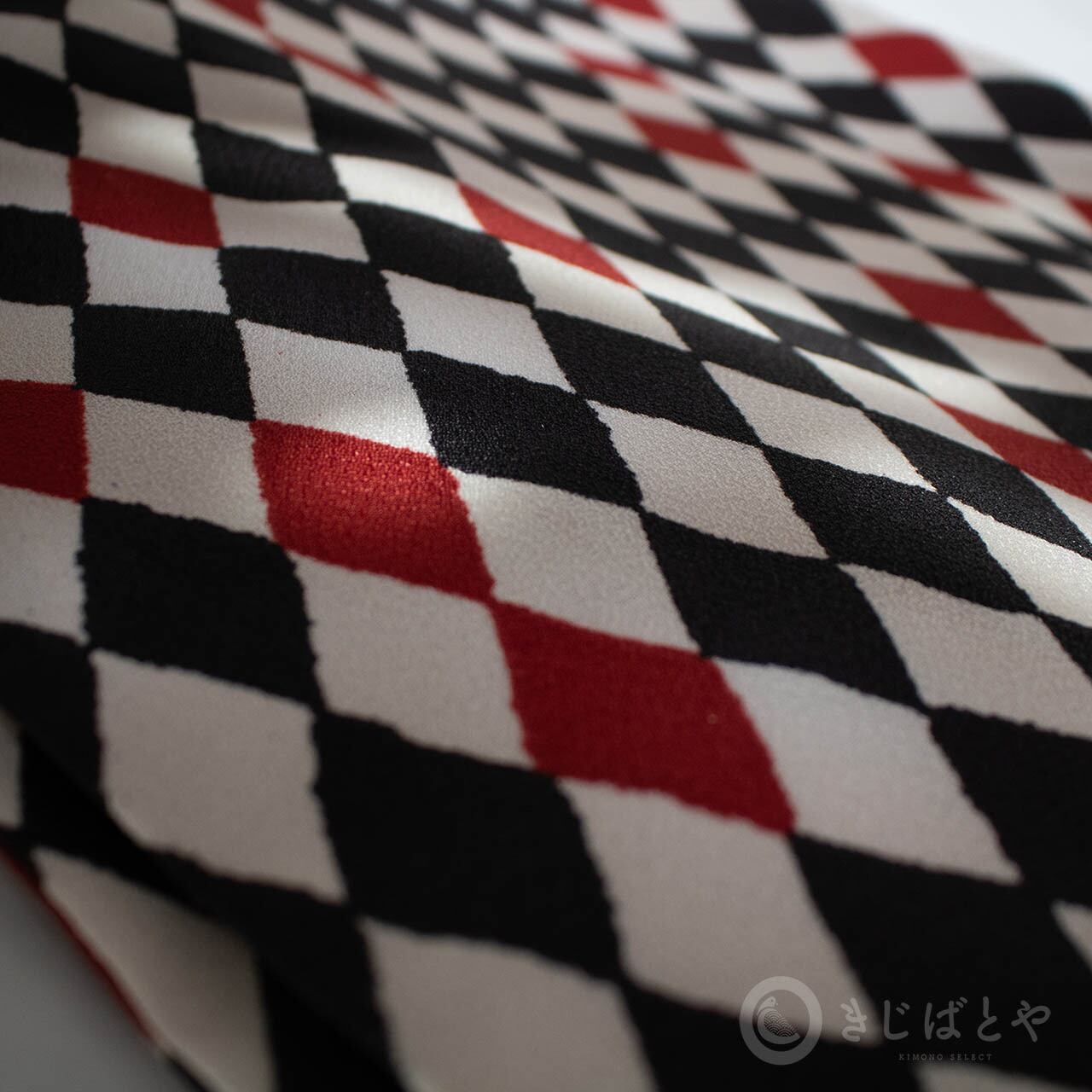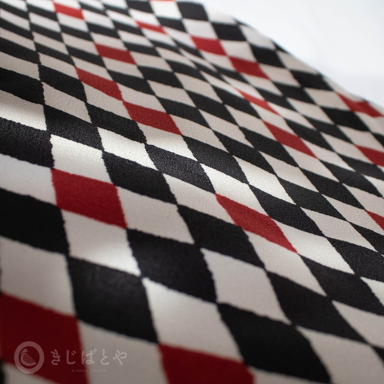 明るい白地に、赤と黒のダイヤ柄が配されています。モダンでありながらかわいらしく、派手なようで意外と馴染む。不思議な総柄小紋です。
