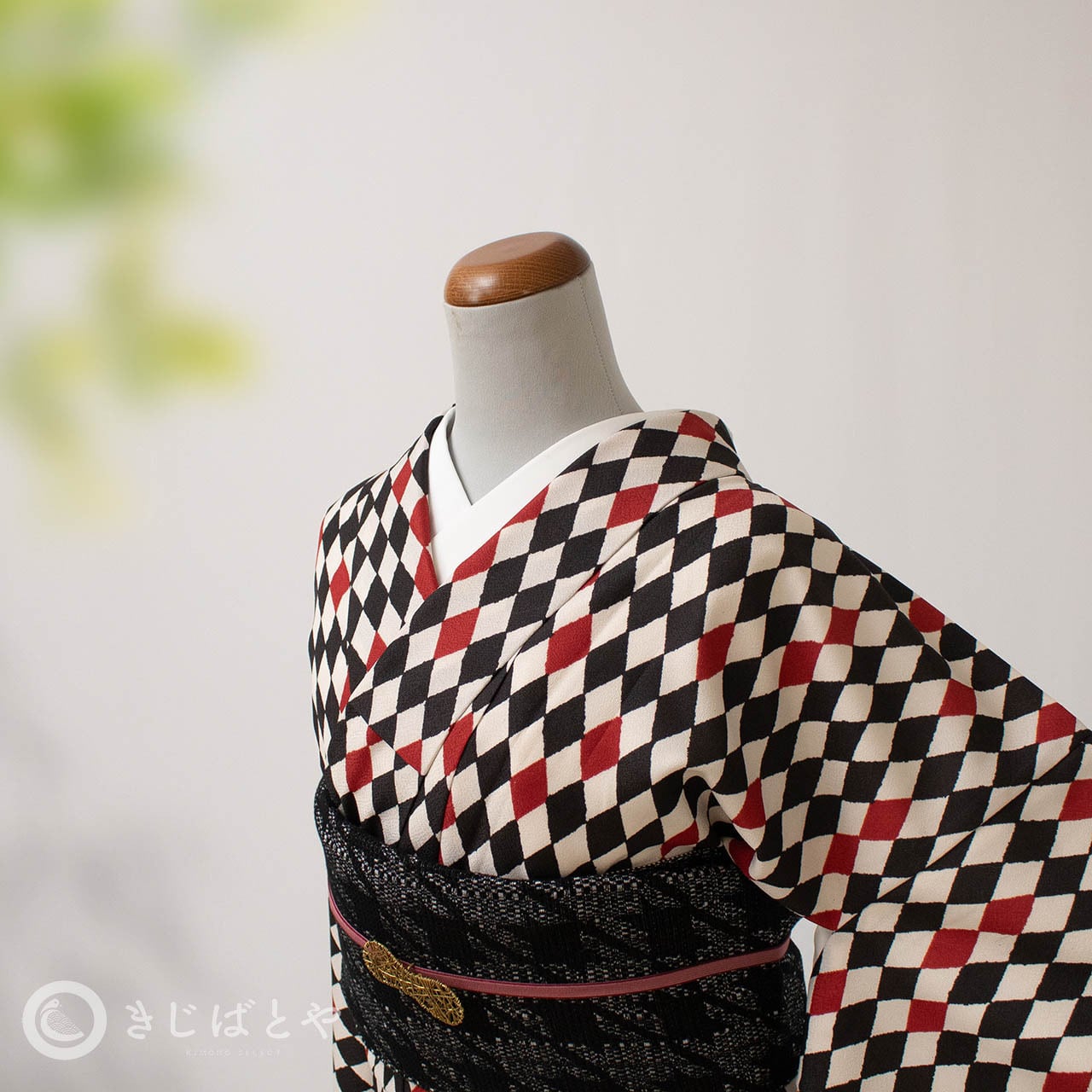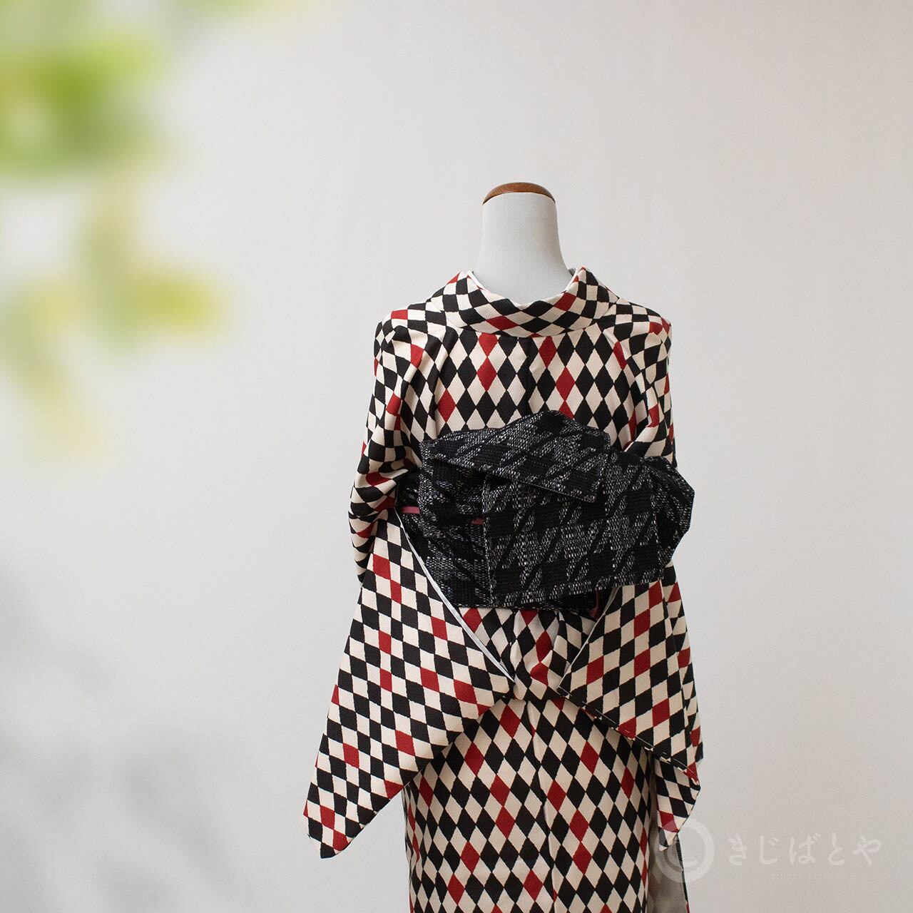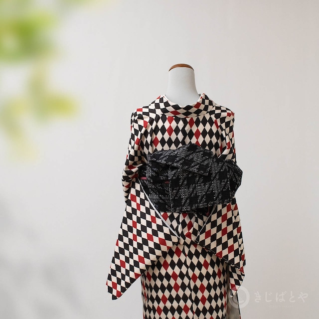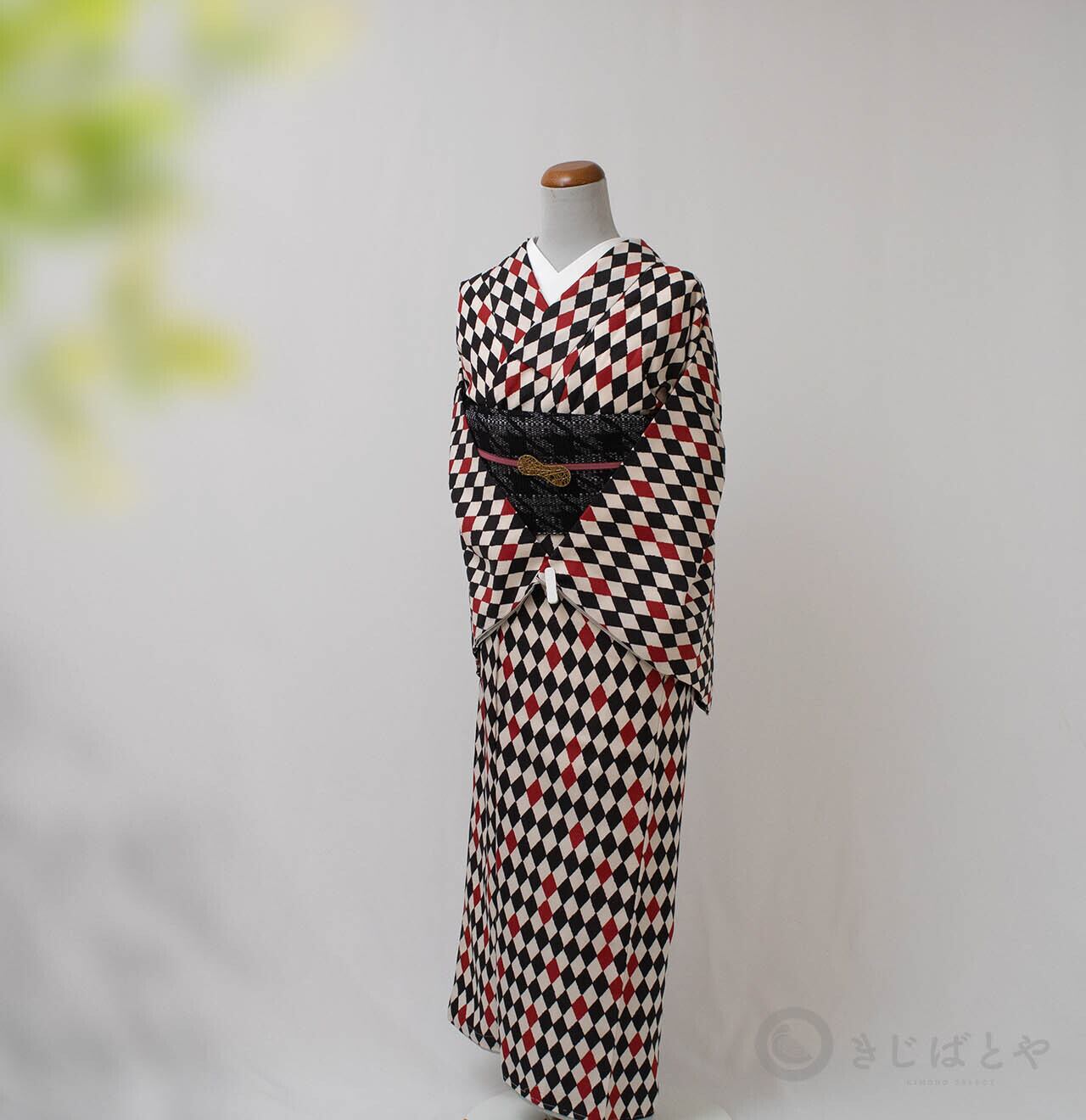 明るい白地に、赤と黒のダイヤ柄が配されています。モダンでありながらかわいらしく、派手なようで意外と馴染む。不思議な総柄小紋です。