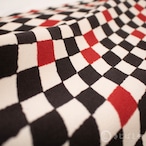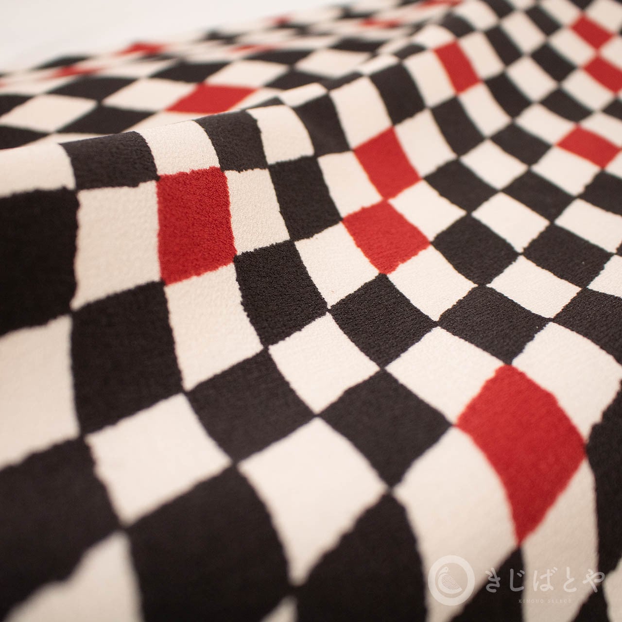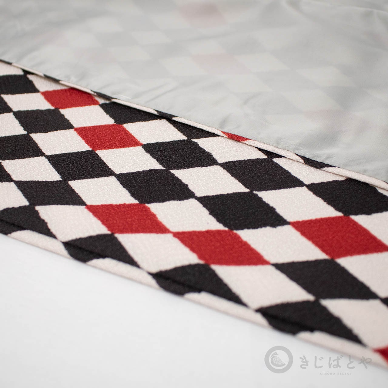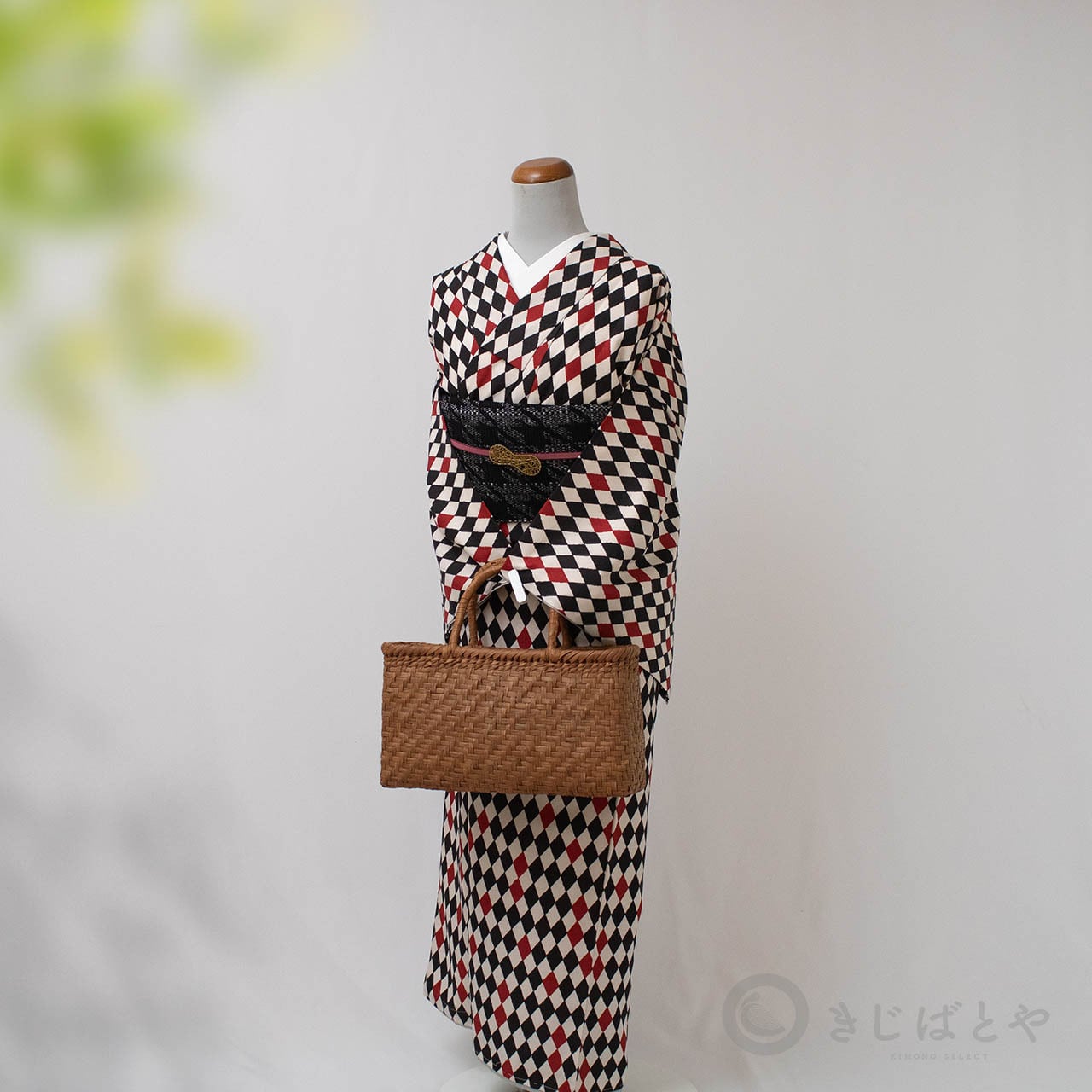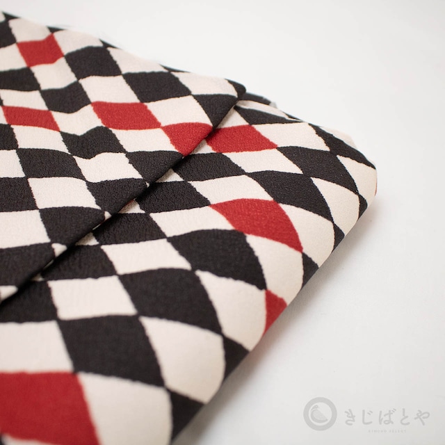 明るい白地に、赤と黒のダイヤ柄が配されています。モダンでありながらかわいらしく、派手なようで意外と馴染む。不思議な総柄小紋です。