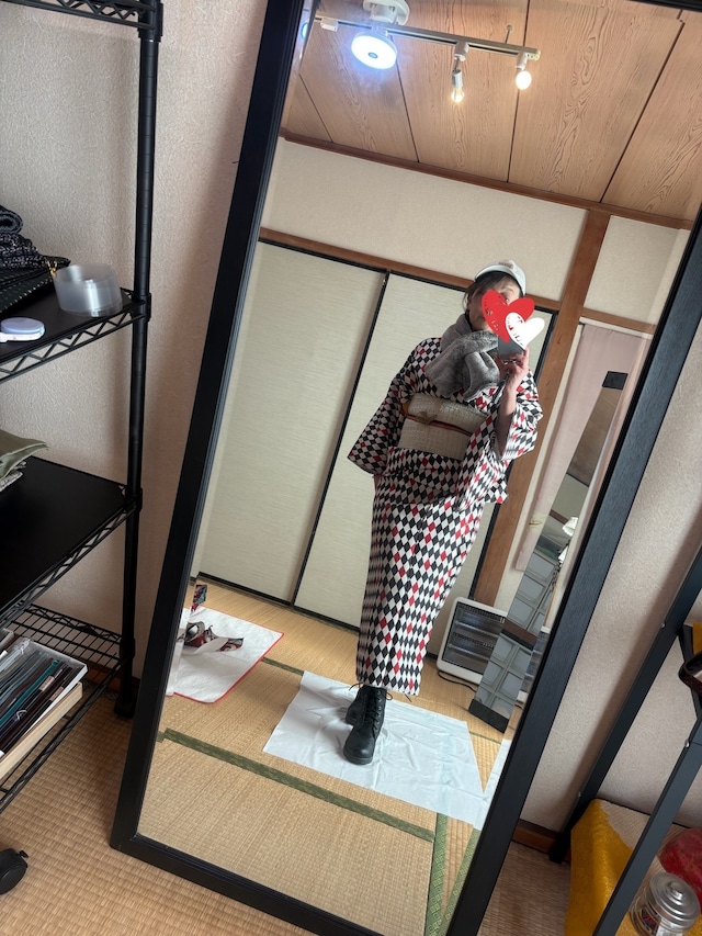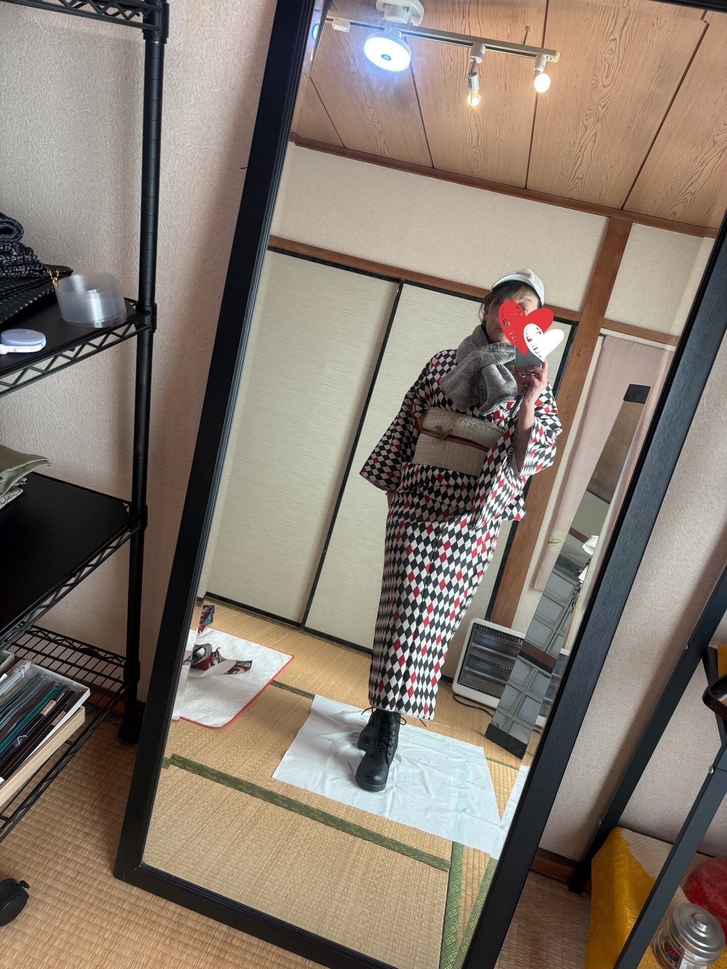 いつもと違う、ちょっとした冒険をするにも、ポリエステルの着物は心軽く挑戦できると思います。(最後にブーツコーデの参考として、私の試着画像を載せています!)