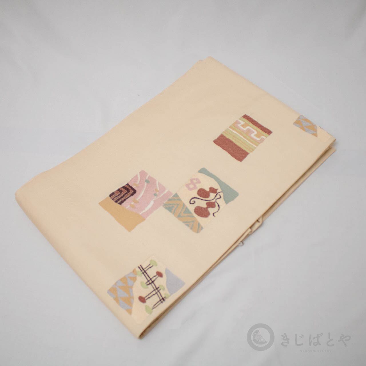 地は尾花色(おばないろ:橙みの白)で、その名のとおり薄の穂を思わせるやわらかで温かみのある色みです。そこにひょうたんや幾何学模様など、意匠化された柄が配されています。
