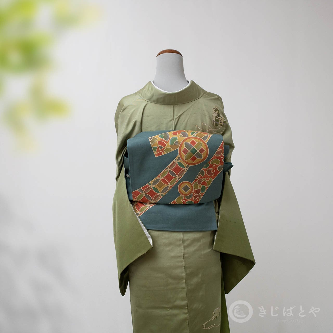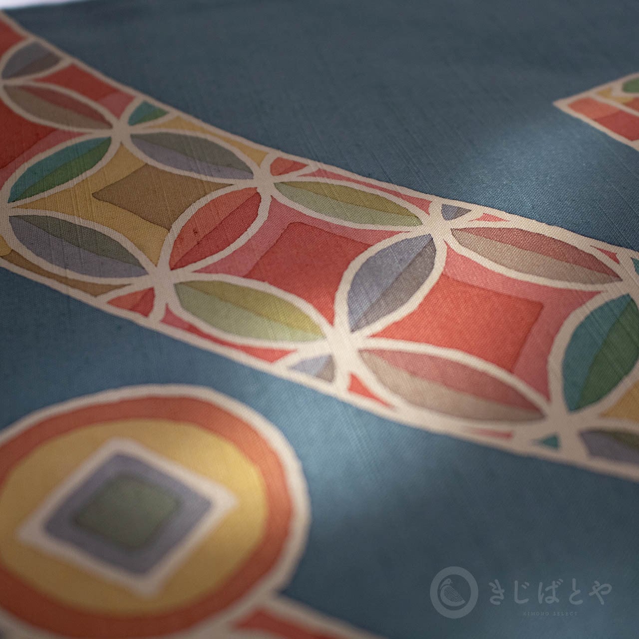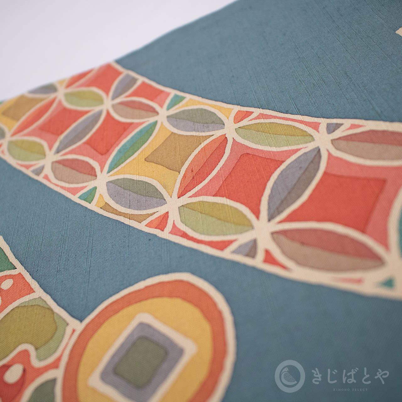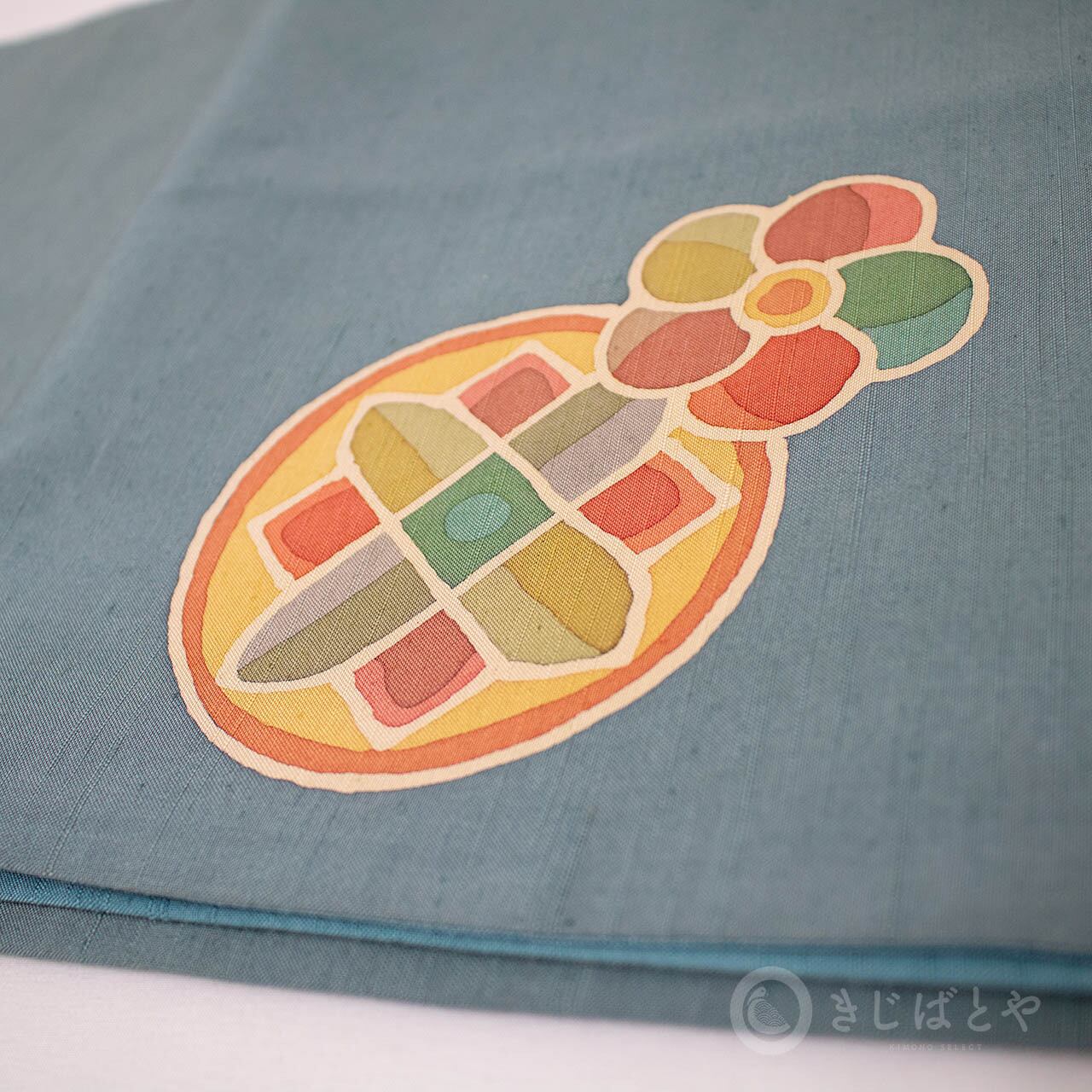地は鉄深川(てつふかがわ:深く渋い青緑)で、そこに美しい色で七宝つなぎ、扇、勾玉などの縁起の良い柄が染められています。