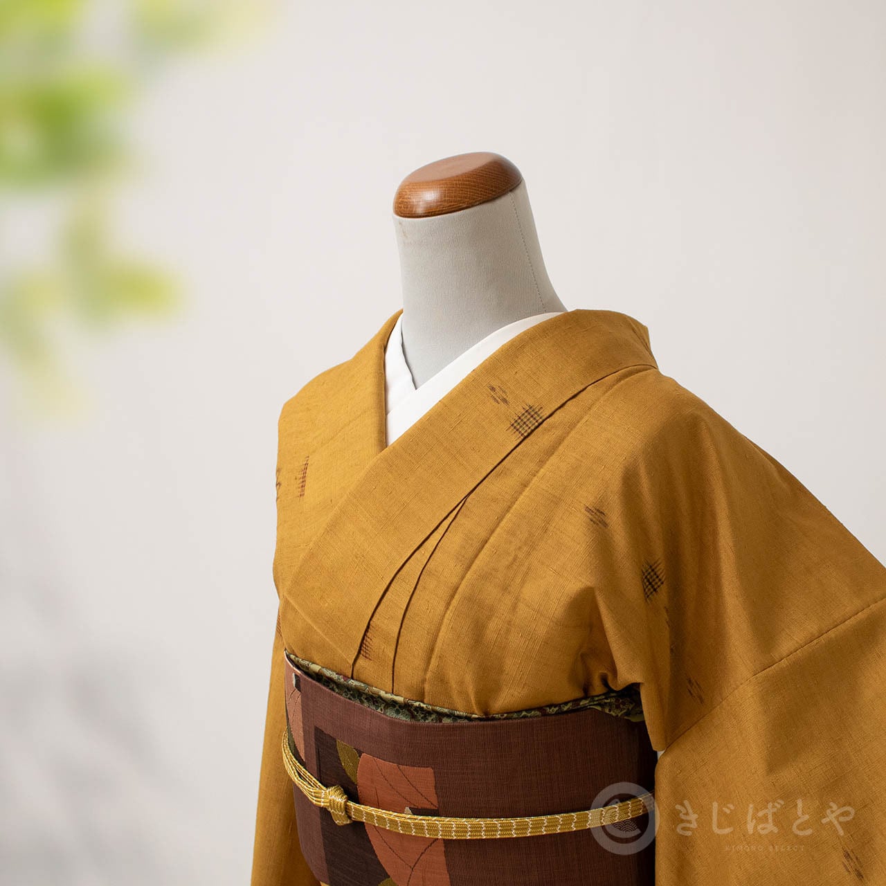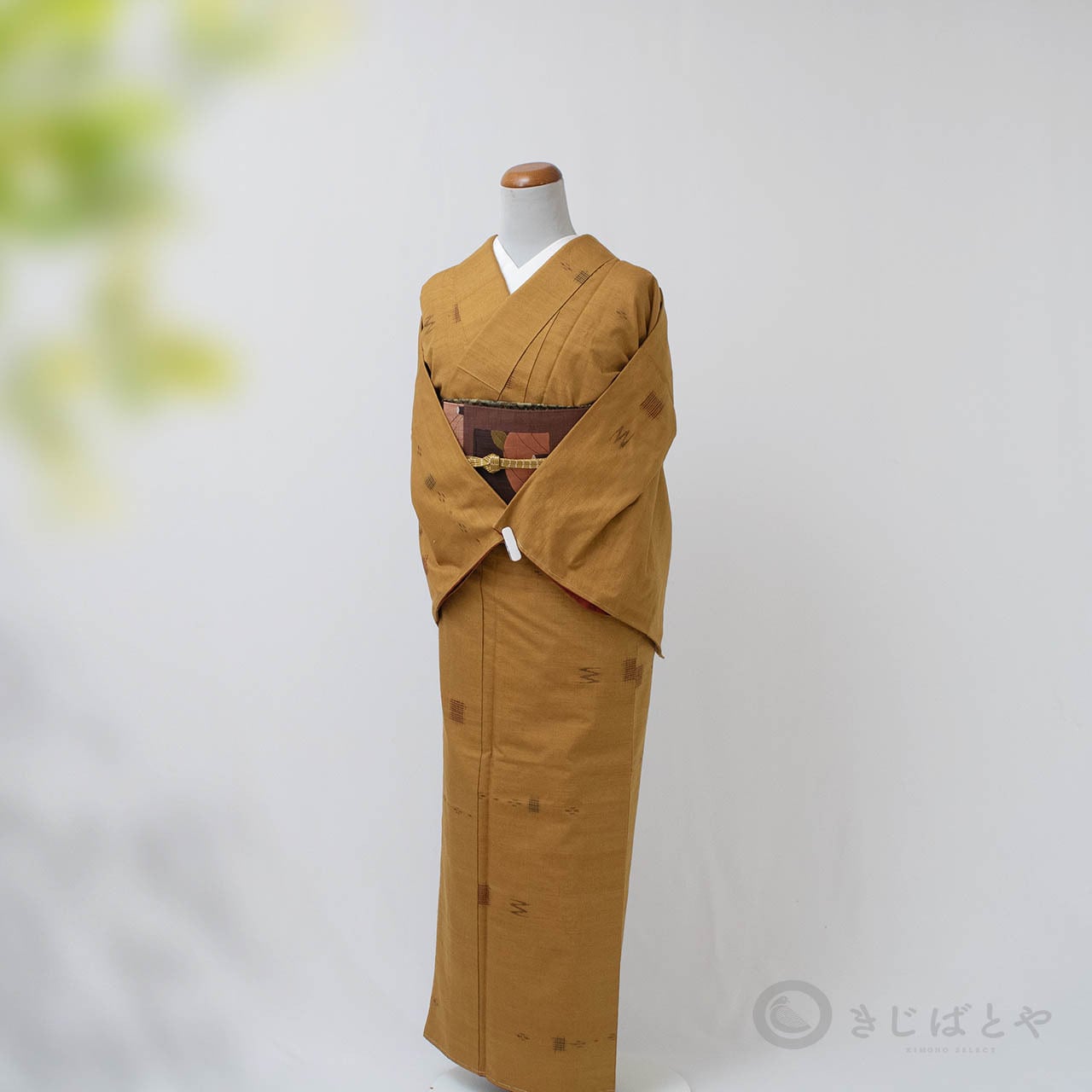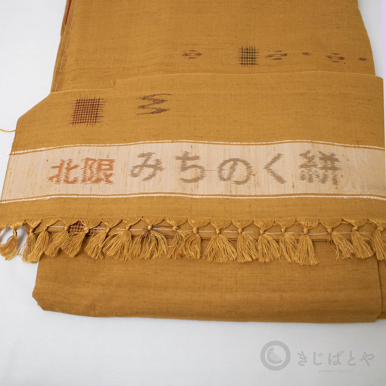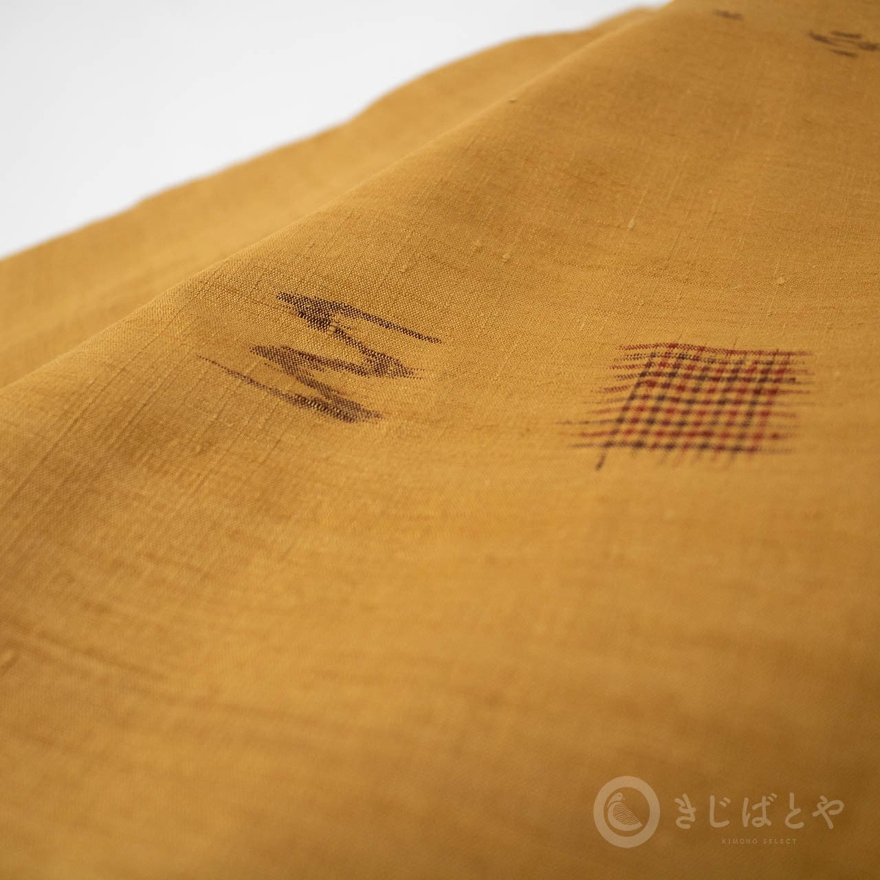 黄色とも違い、ベージュでもなく、橙でもない。なんとも不思議な深く表情のある色なのですが、紬の風合いと絣のおかげでさらに表情豊かになっています。