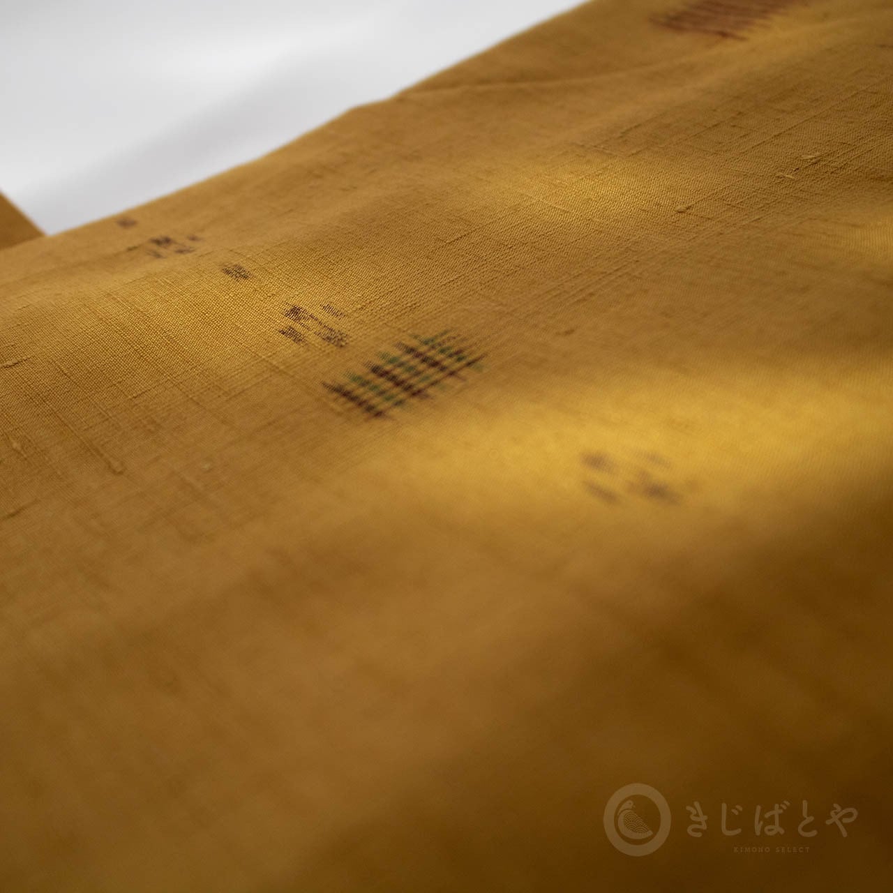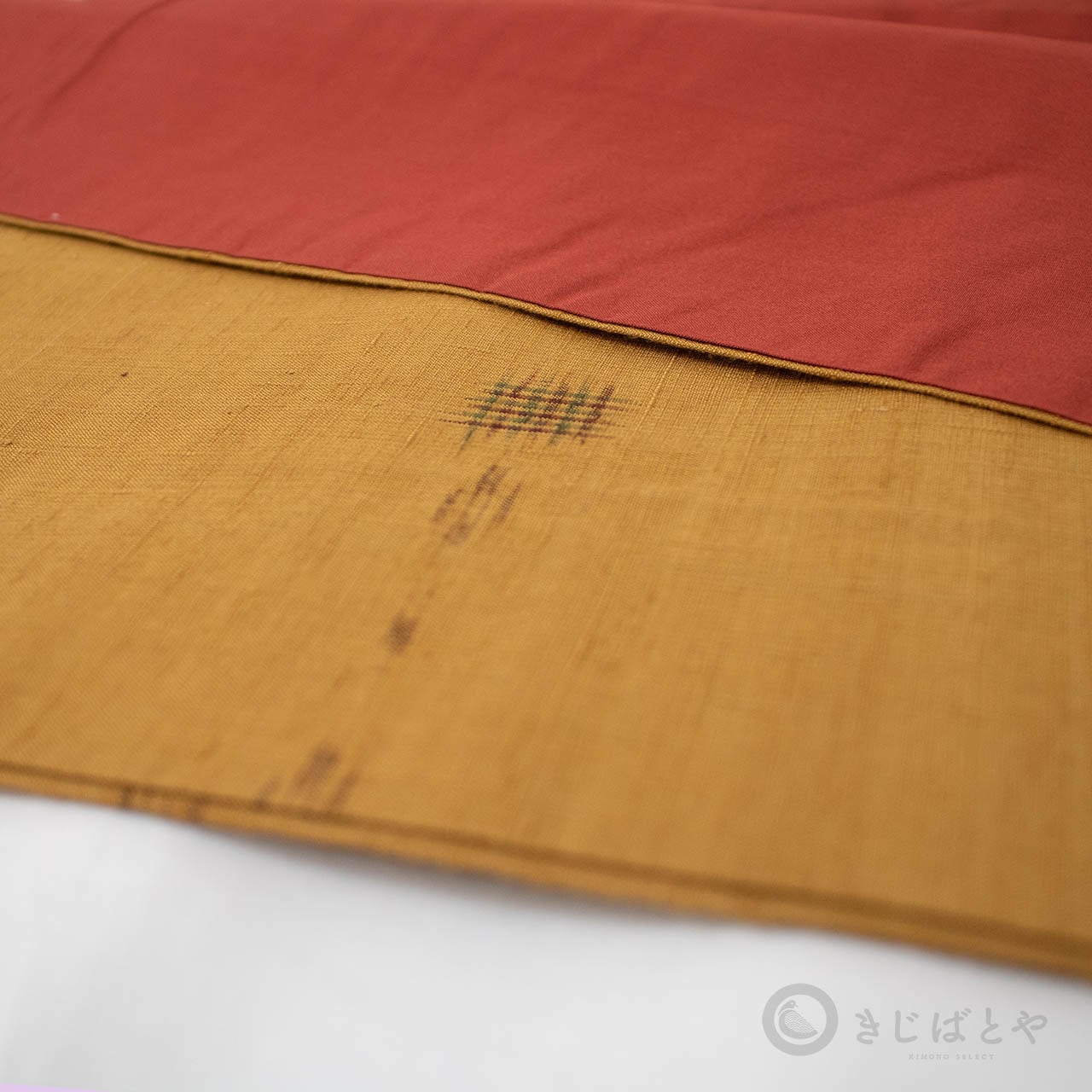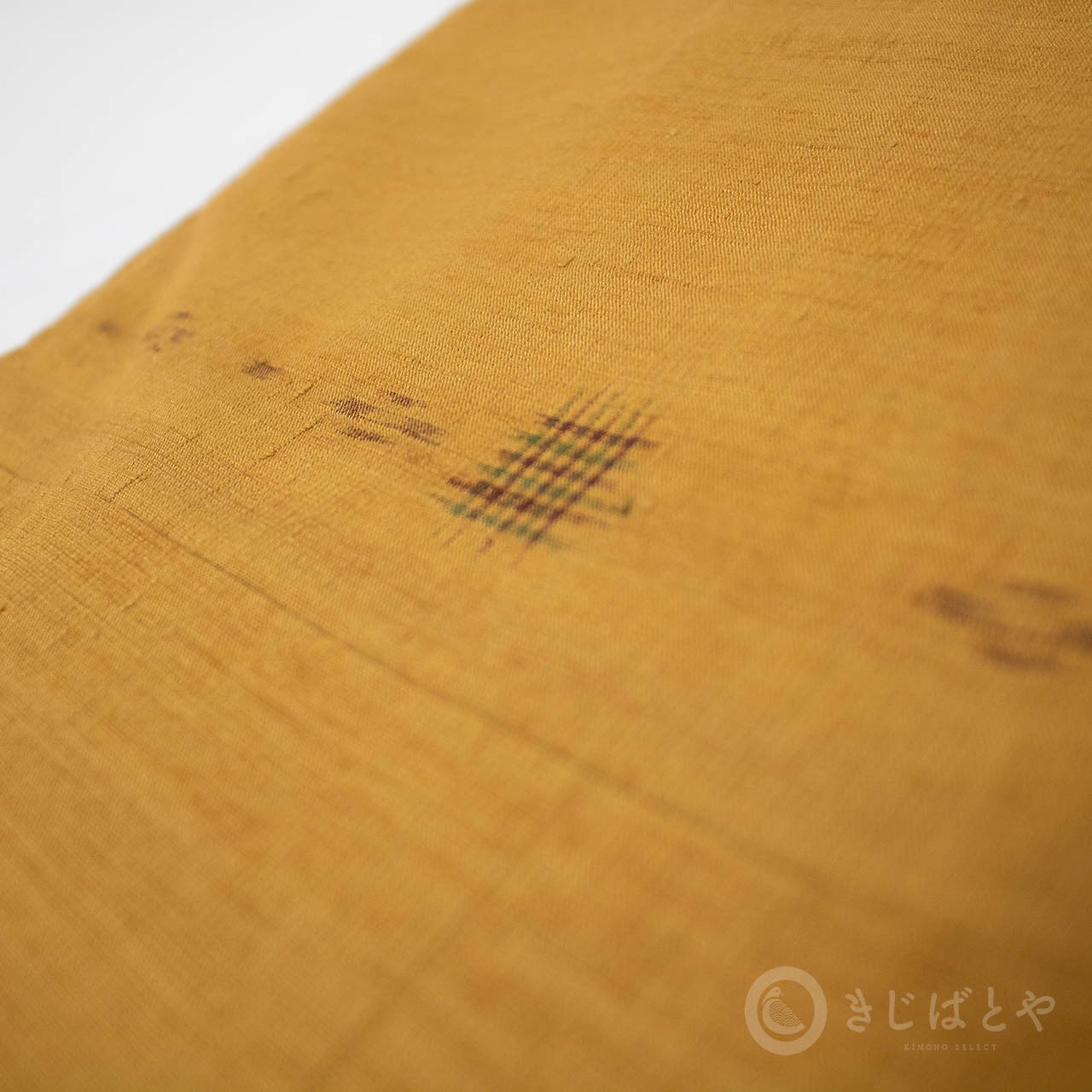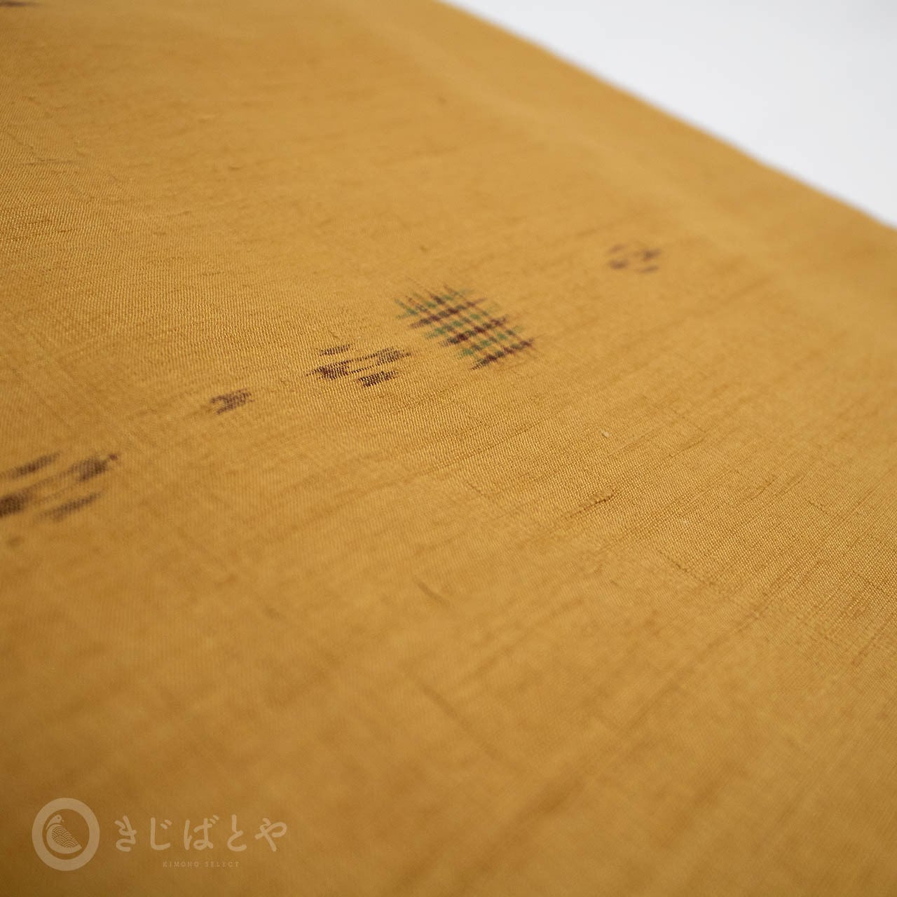 地は狐色(きつねいろ:強い橙)で、こくのある、赤みよりの深い黄色・・・というと近いでしょうか。少し渋みがある深くやわらかな色なので、とても肌うつりが良いです。