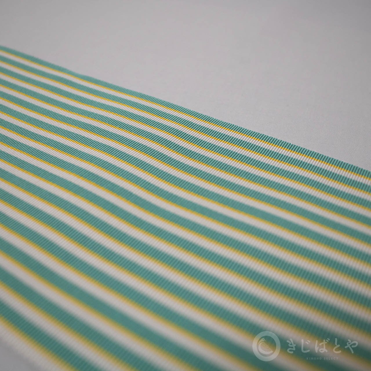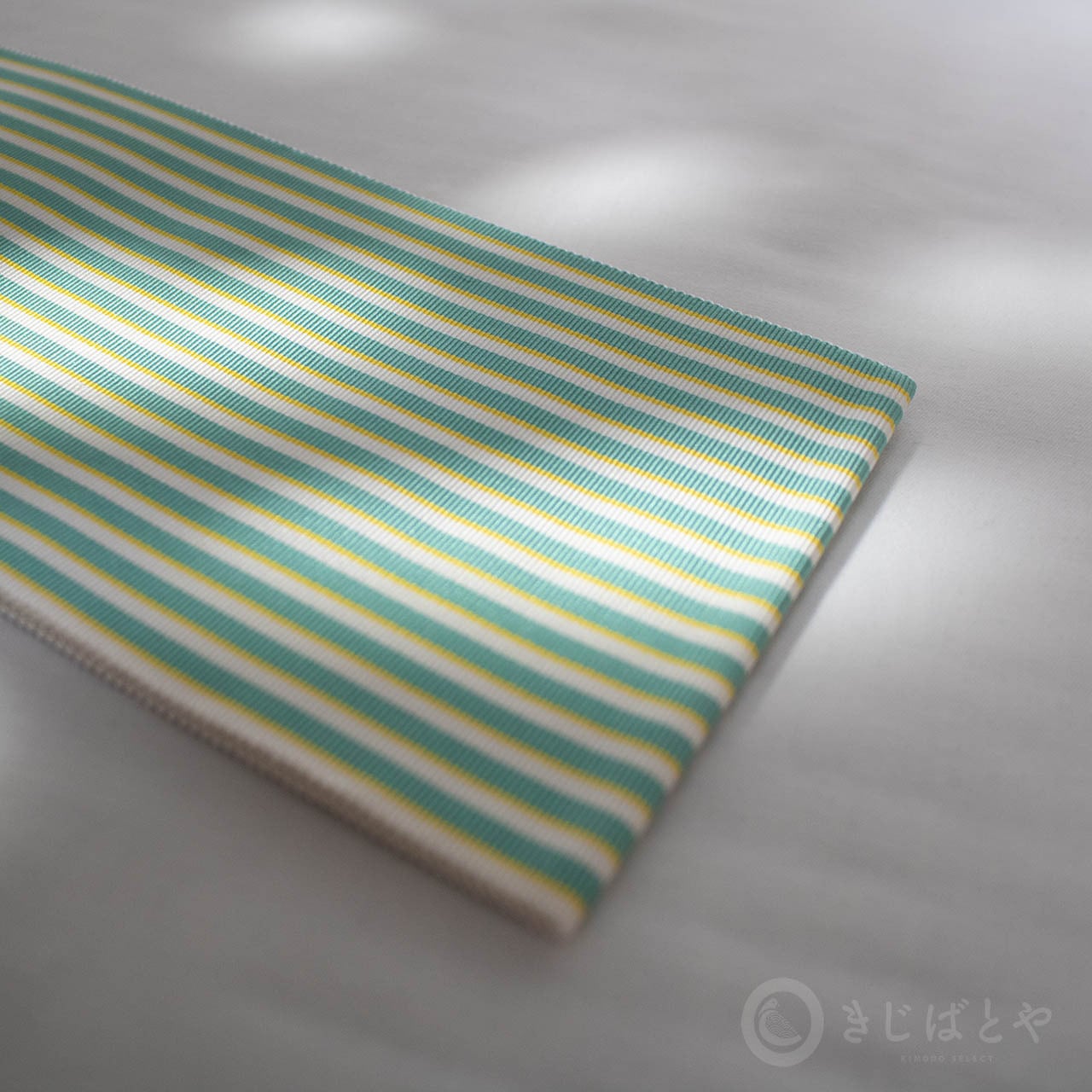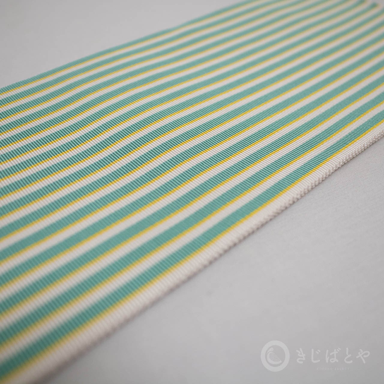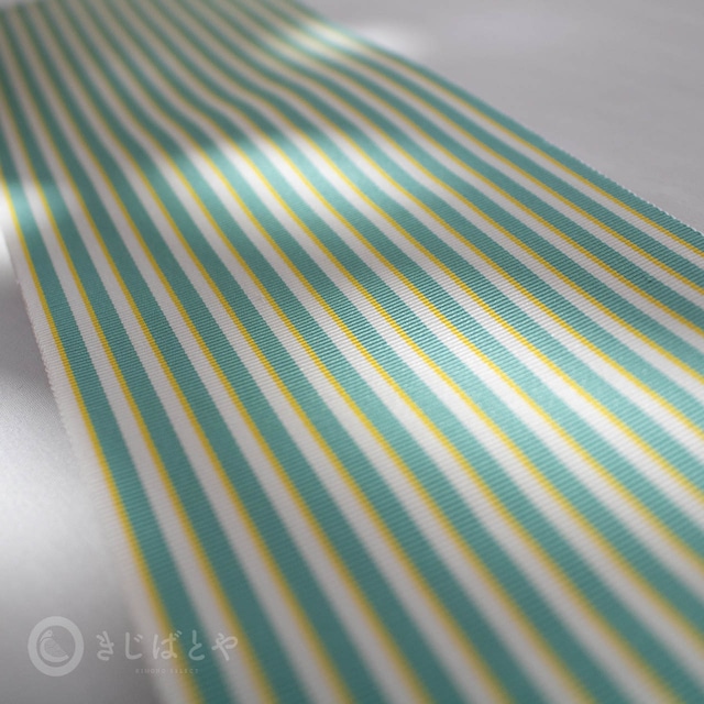 鮮やかなミントグリーンの横には細く淡い黄色の縞が添っていて、白の縞が美しく引き立ちます。