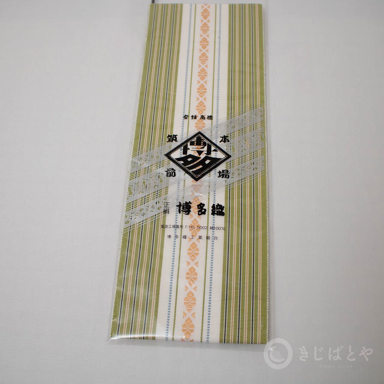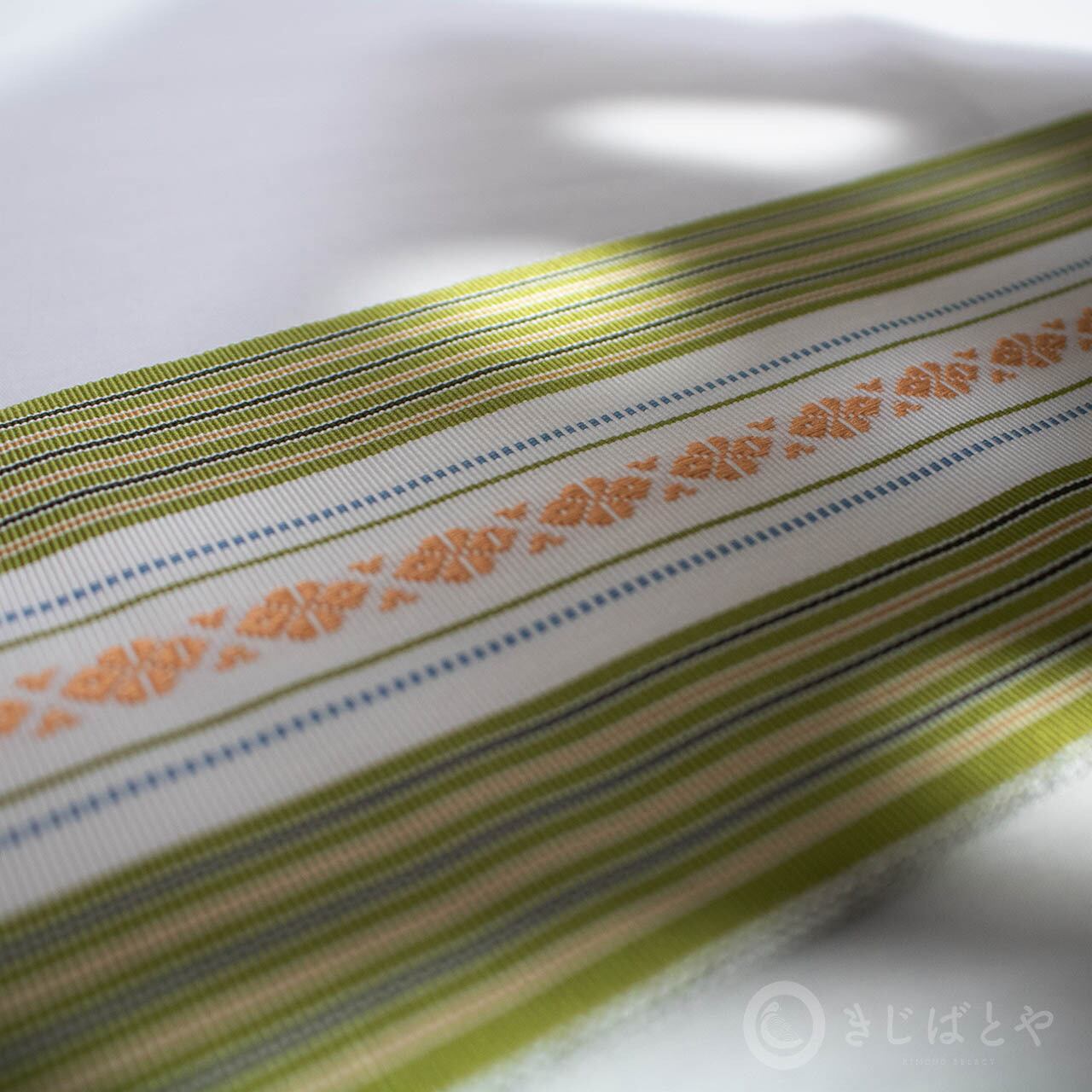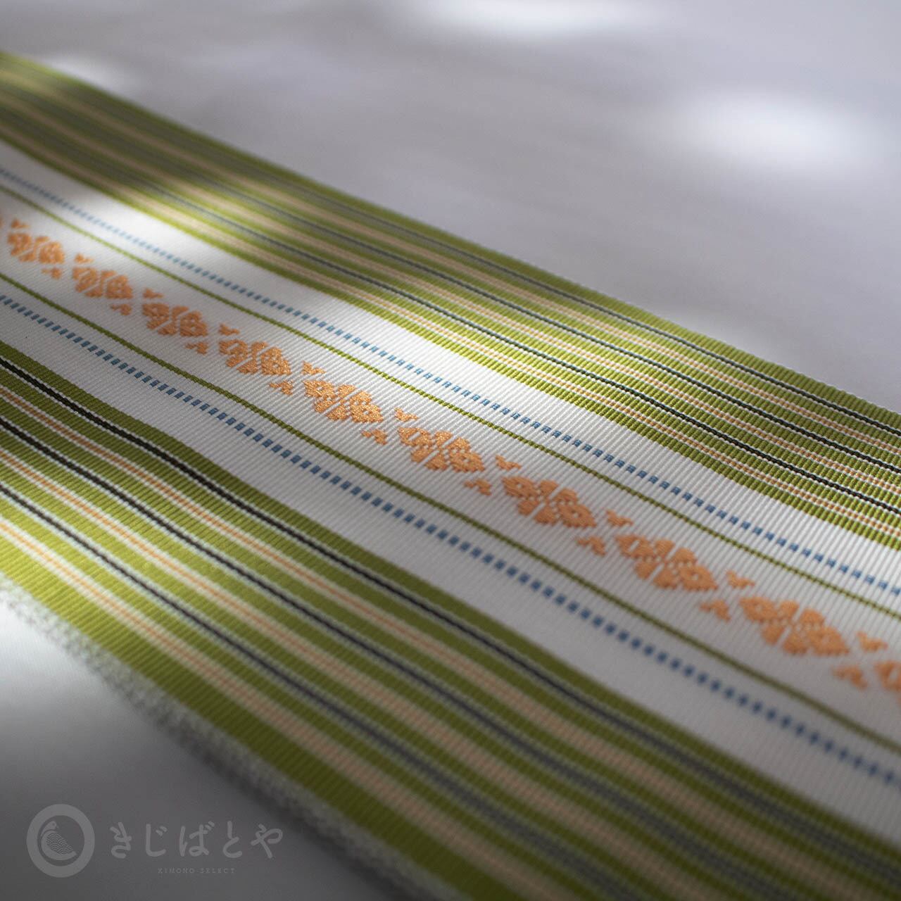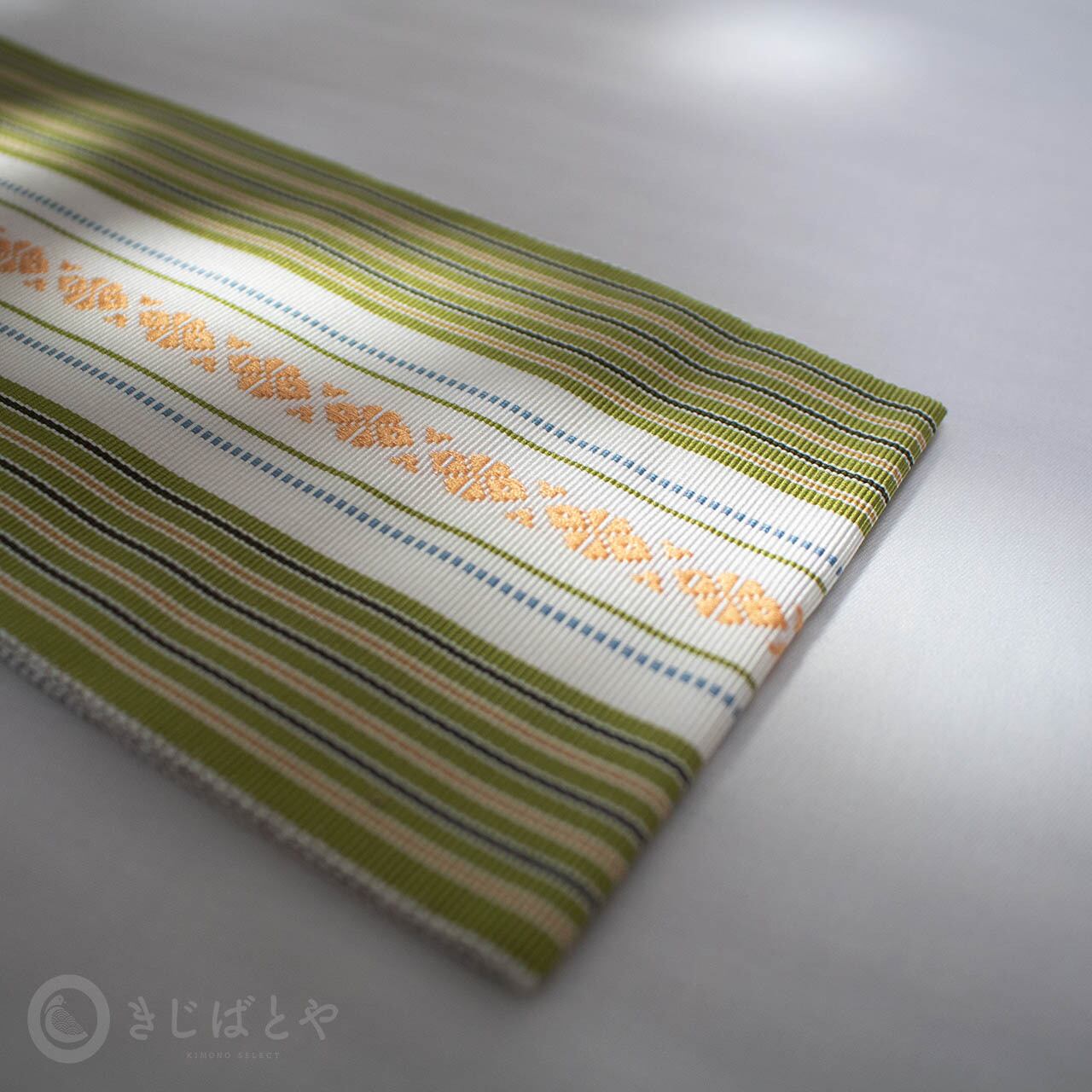 鶯色(うぐいすいろ:暗い黄緑)に白と独鈷殻が美しく映える伊達締めです。