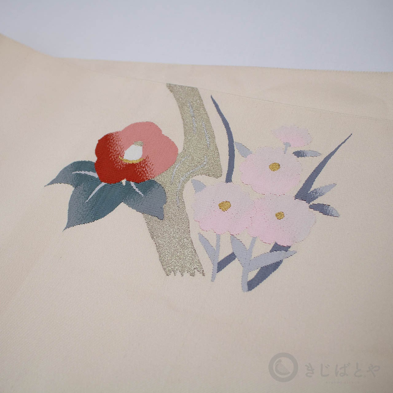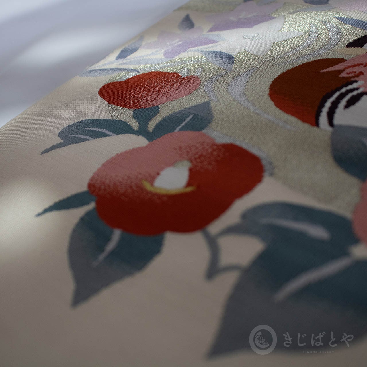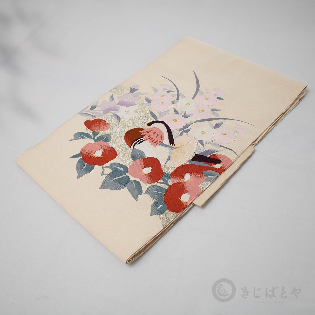 地は練色(ねりいろ:橙みの白)で、椿や桔梗などの季節の花々と鴛鴦が織られています。