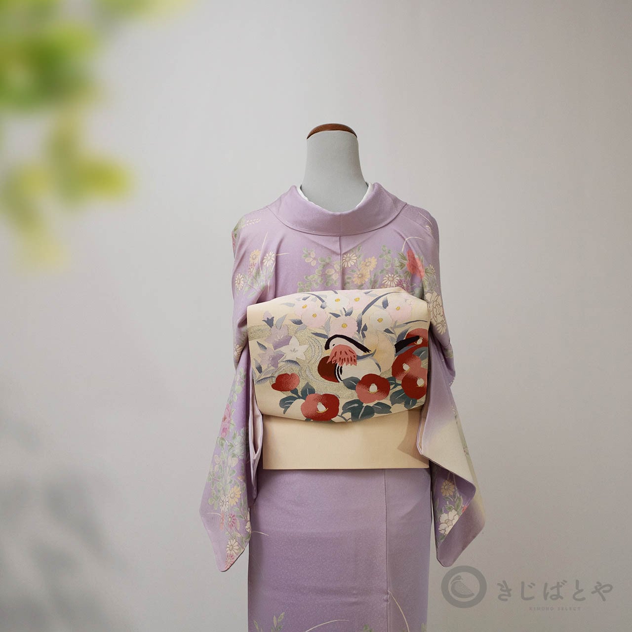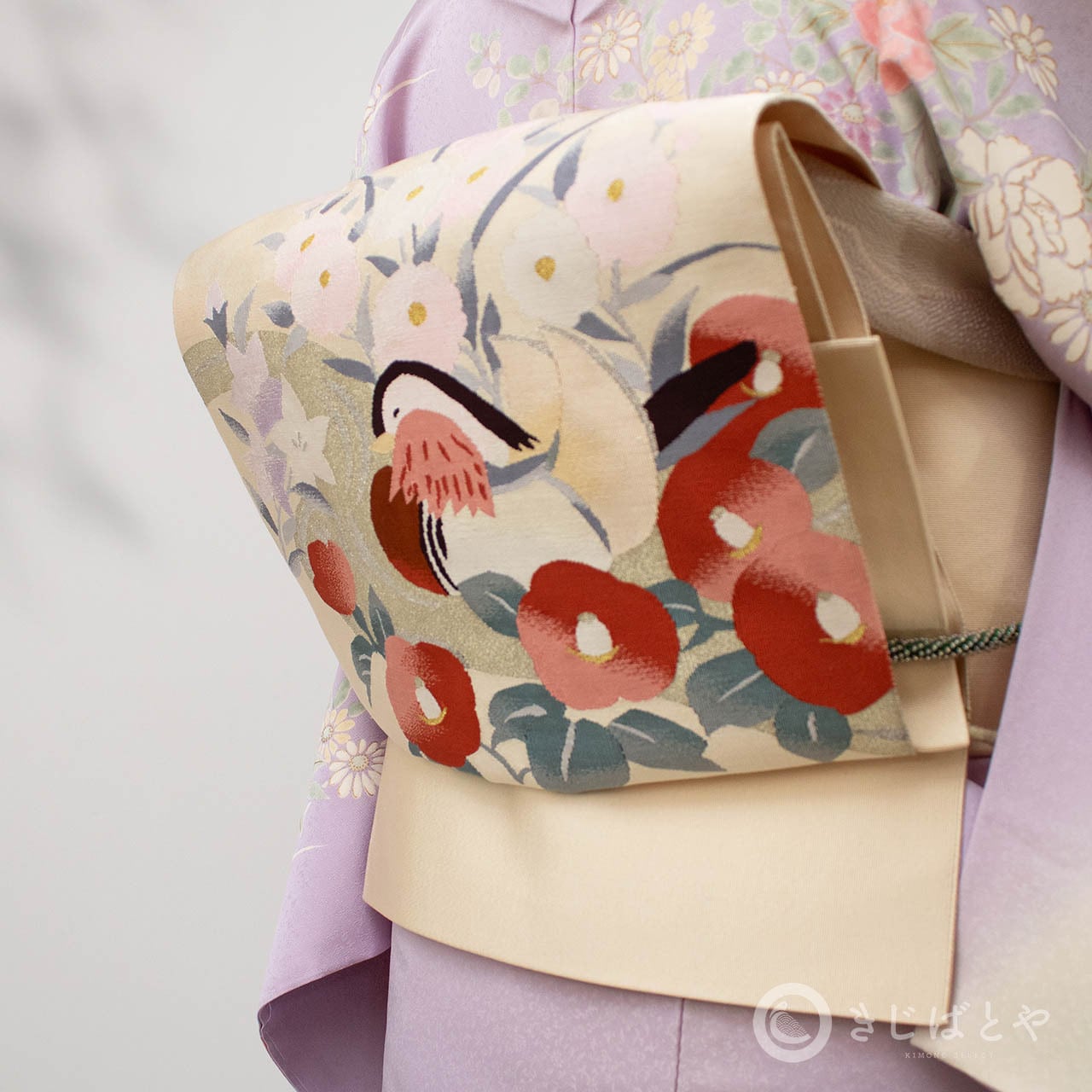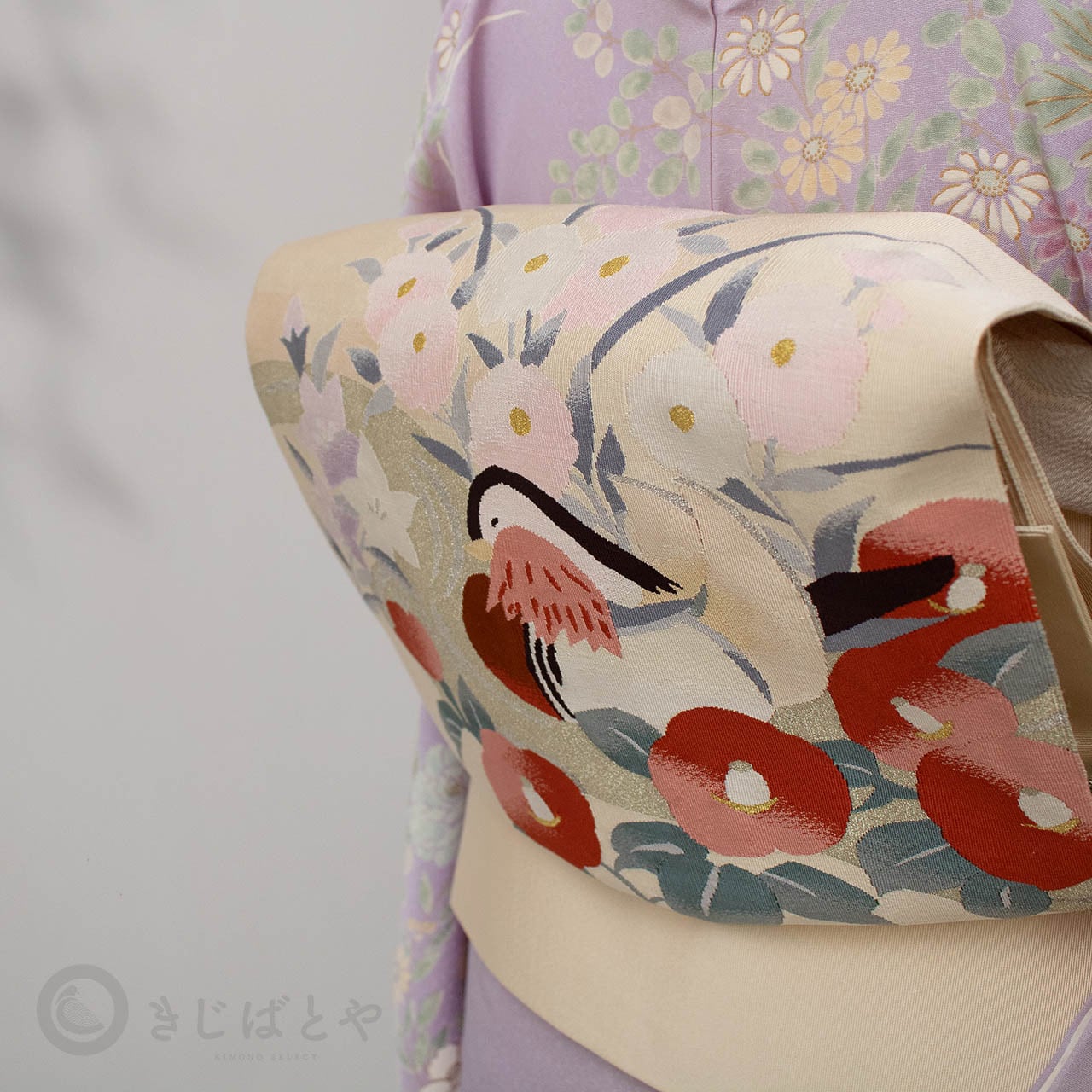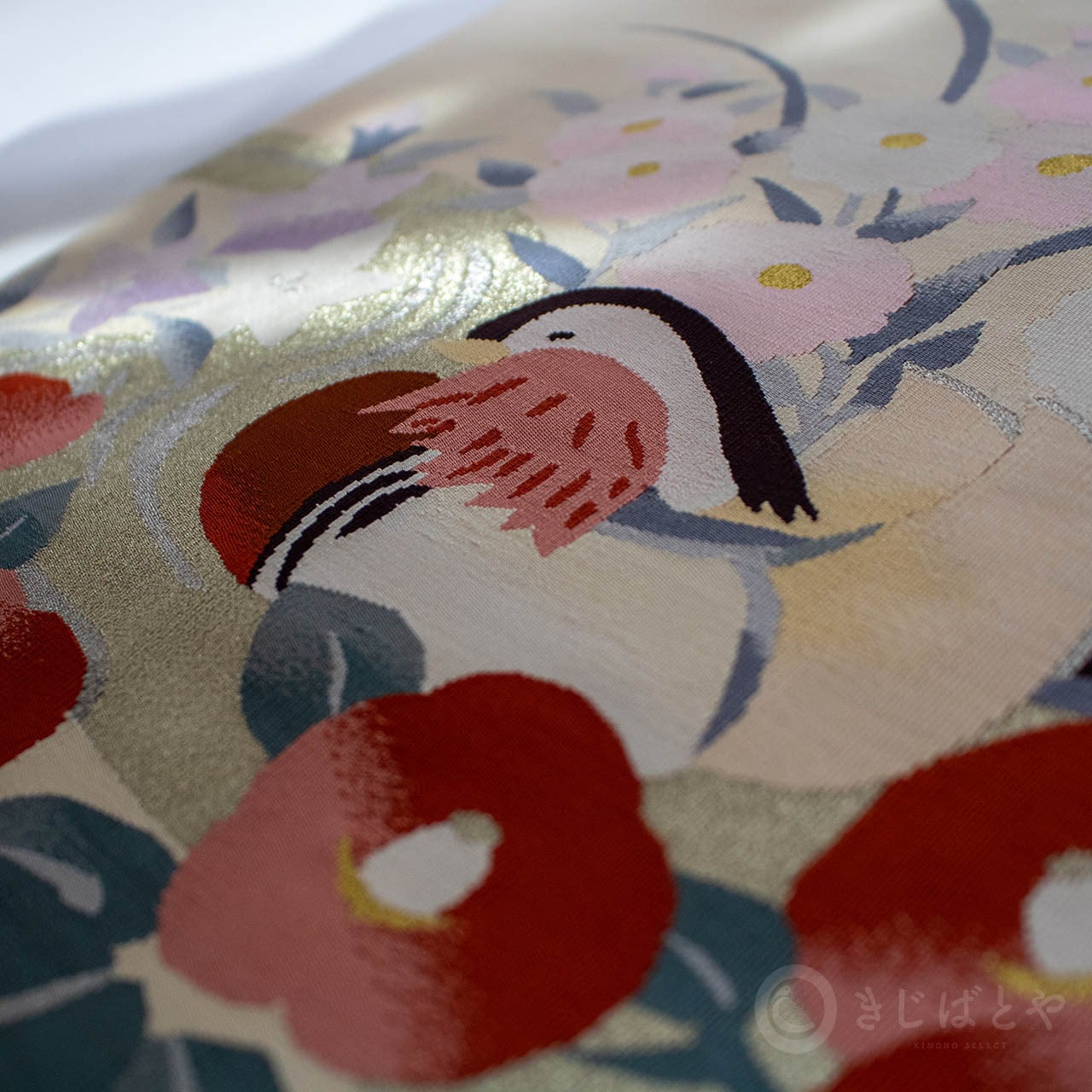 地は練色(ねりいろ:橙みの白)で、椿や桔梗などの季節の花々と鴛鴦が織られています。