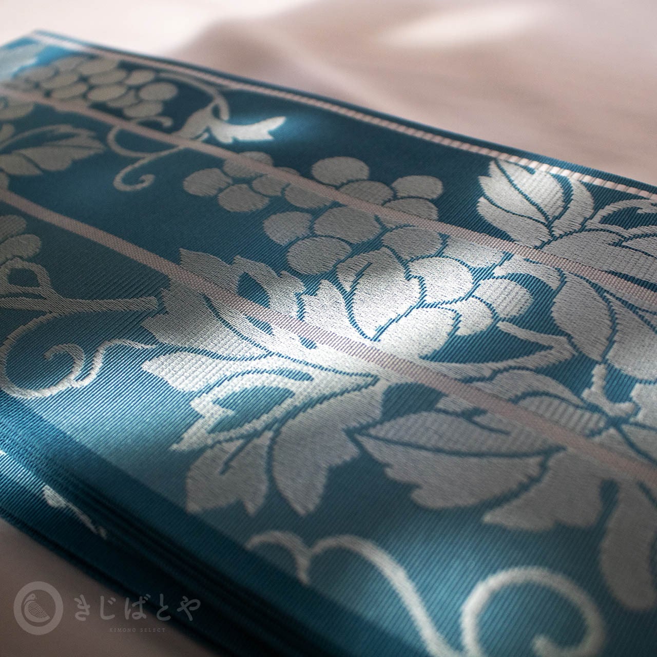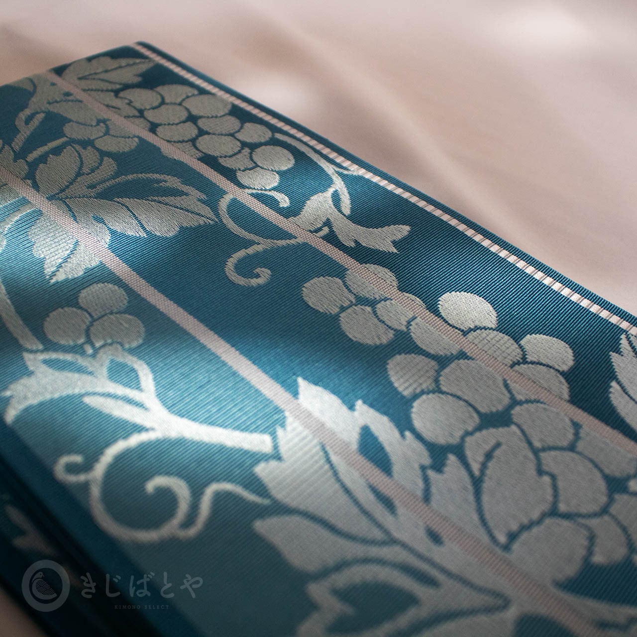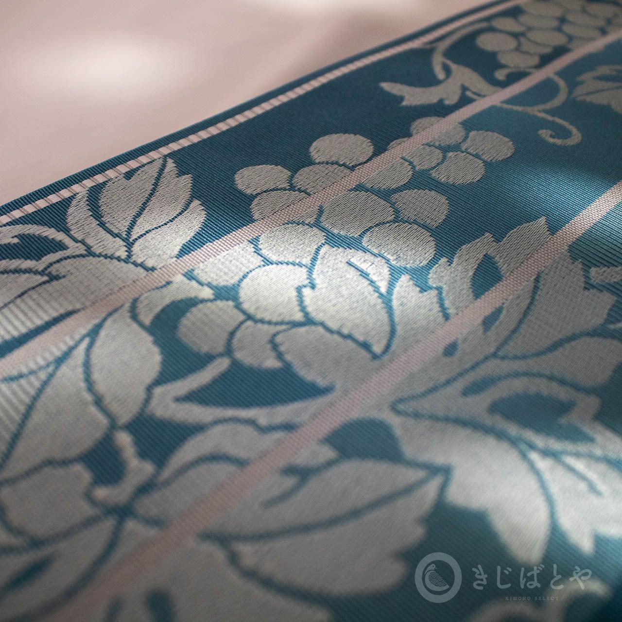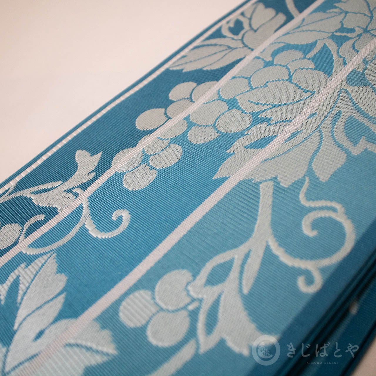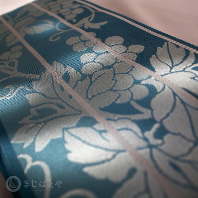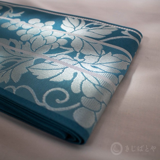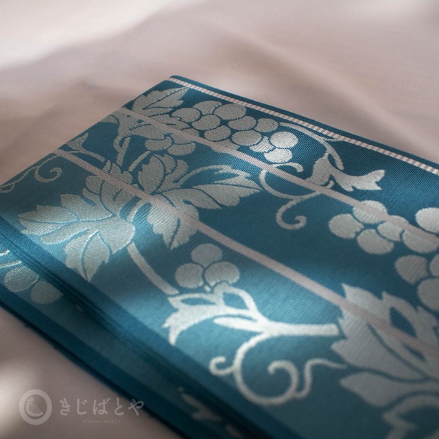 藍砥茶(あいとのちゃ:深く渋い青)から錆浅葱(さびあさぎ:深く渋い青)、へと切り替わる地に白銀で織られた葡萄の柄が美しく浮かび上がり、とても涼しげな柄ゆきです。
