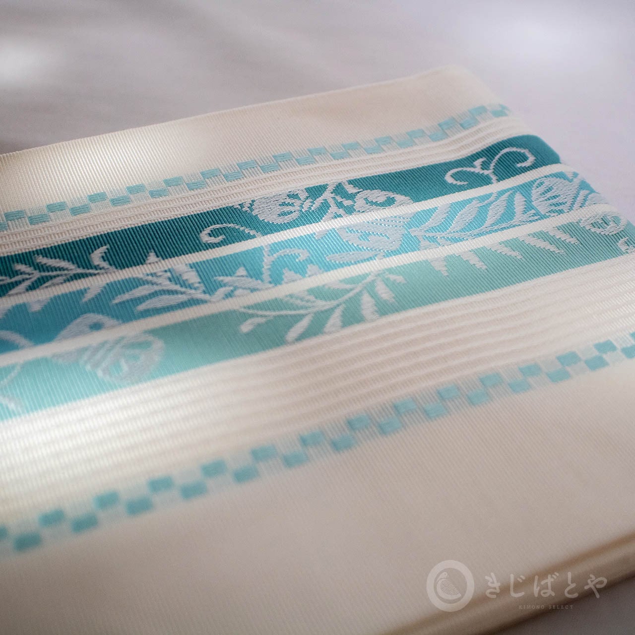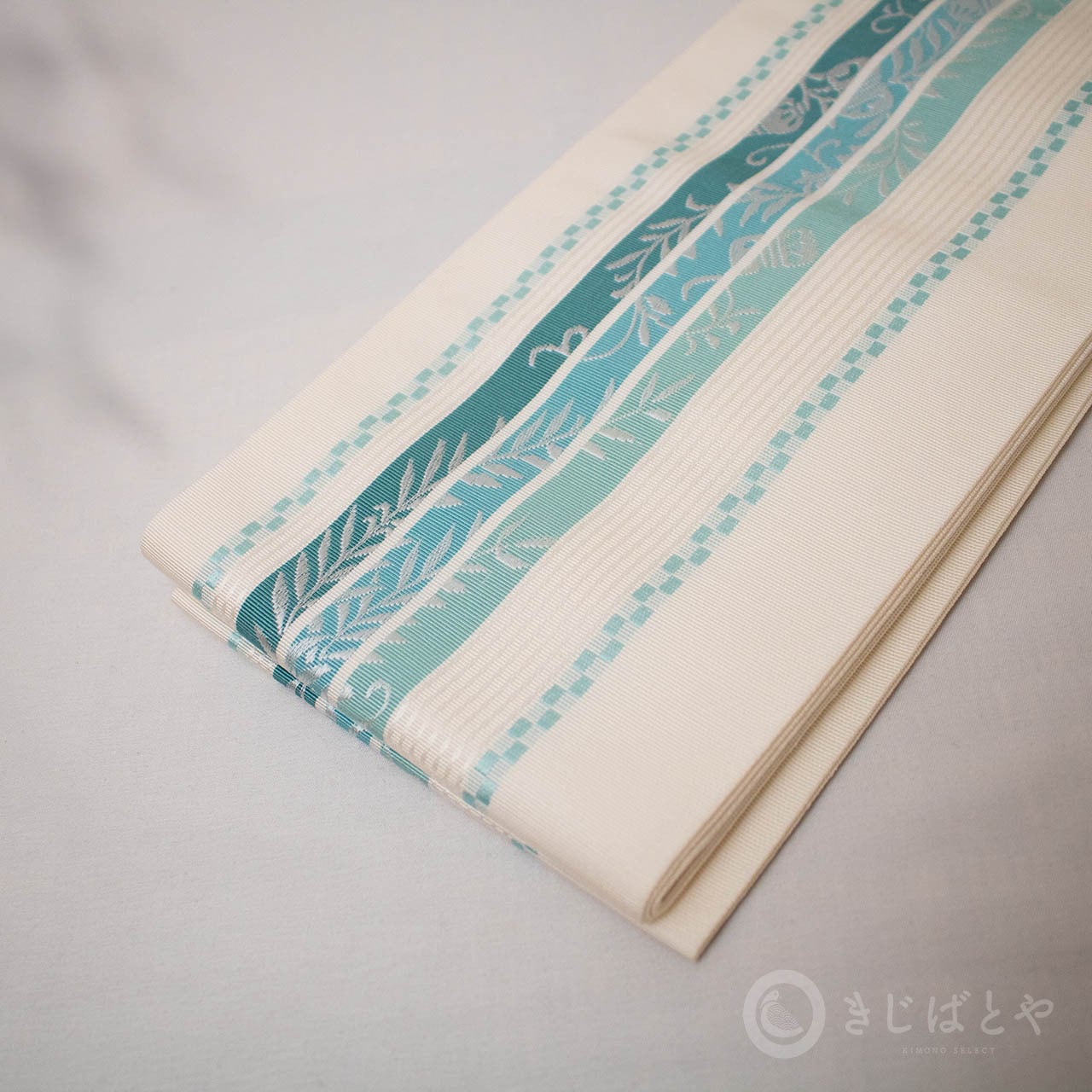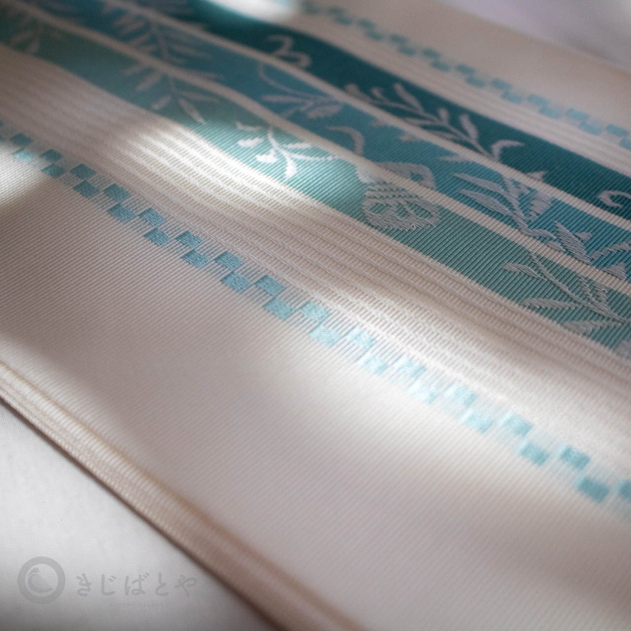 地は明るい白地で、藍砥茶(あいとのちゃ:深く渋い青)から青磁の縞に、白銀で葉影が織られています。