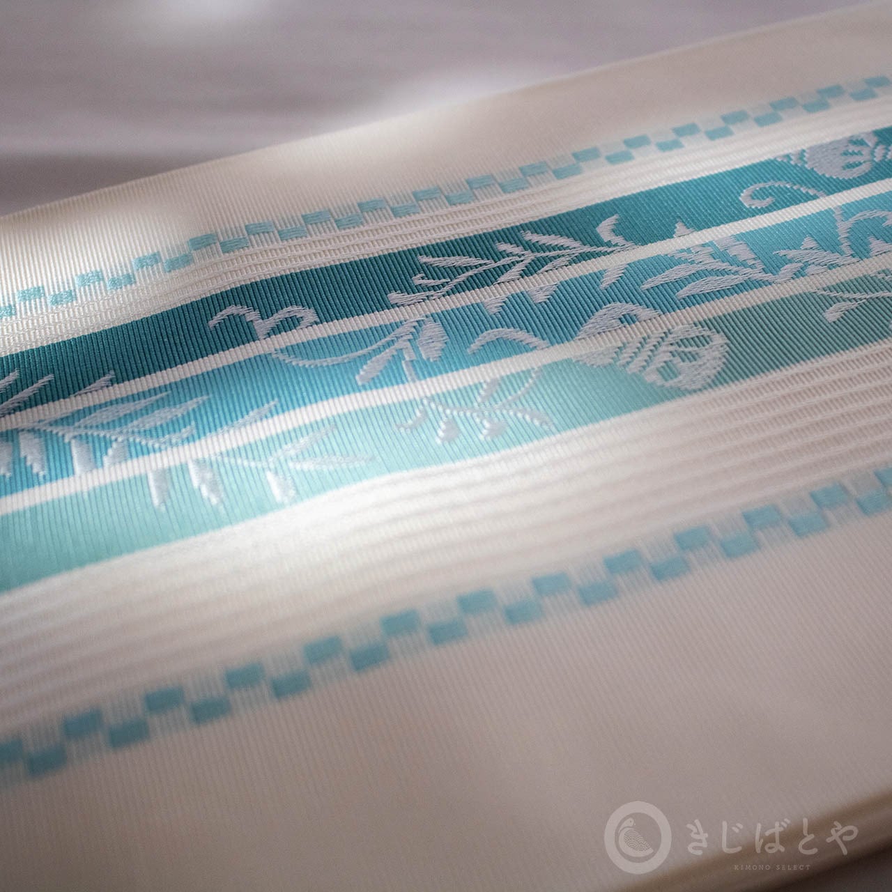 白地に爽やかな色みが美しい、正絹の博多織半幅帯です。