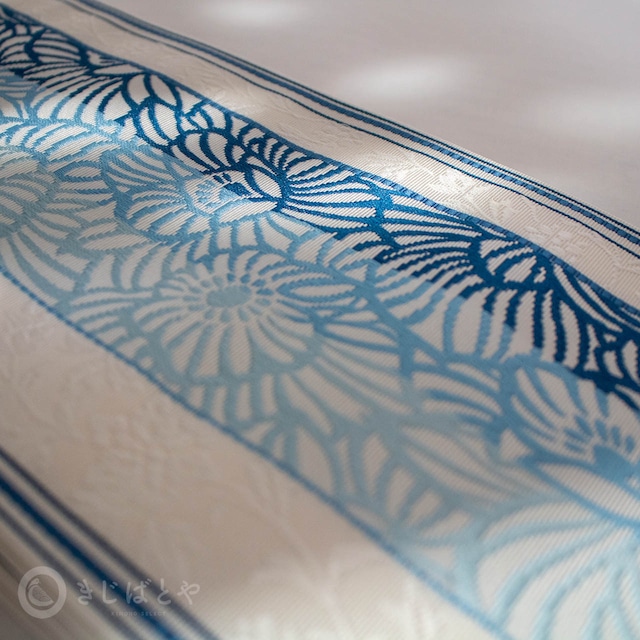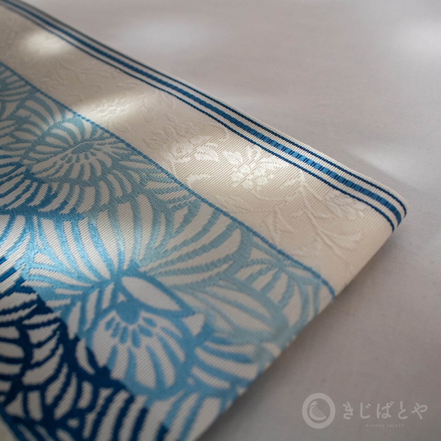 白地に透かしたような花の柄が美しい、正絹の博多織半幅帯です。