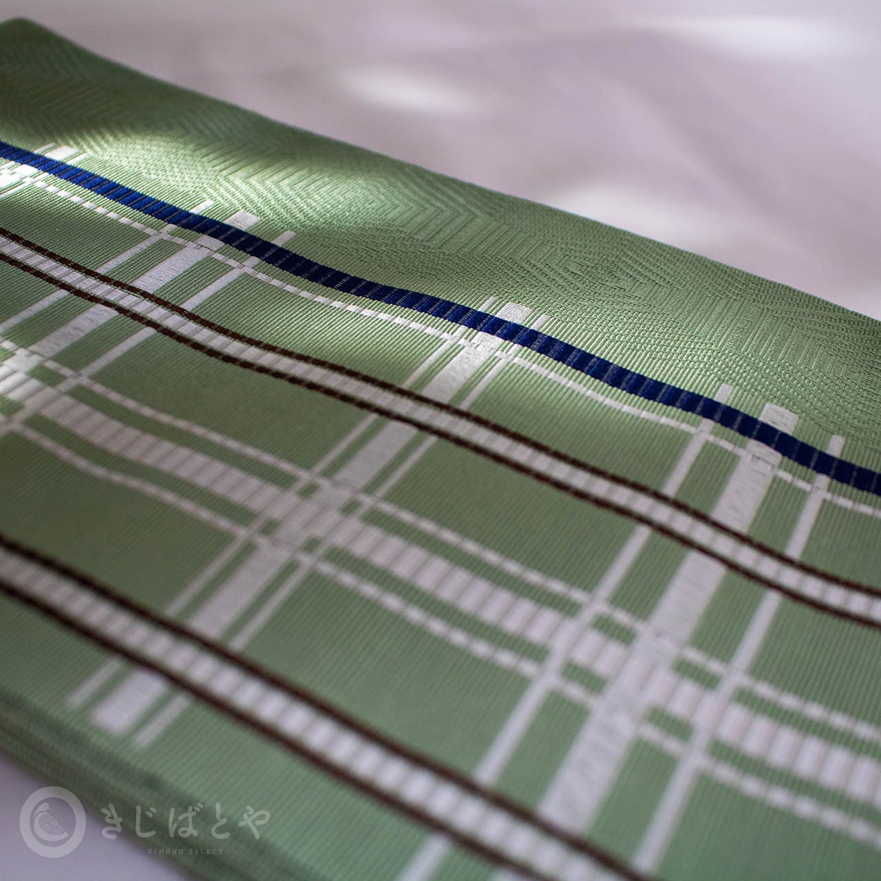 博多半幅帯 灰緑に格子