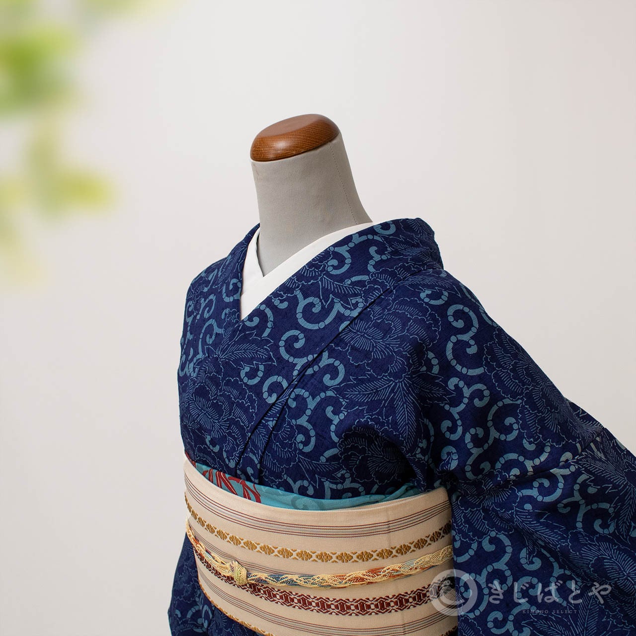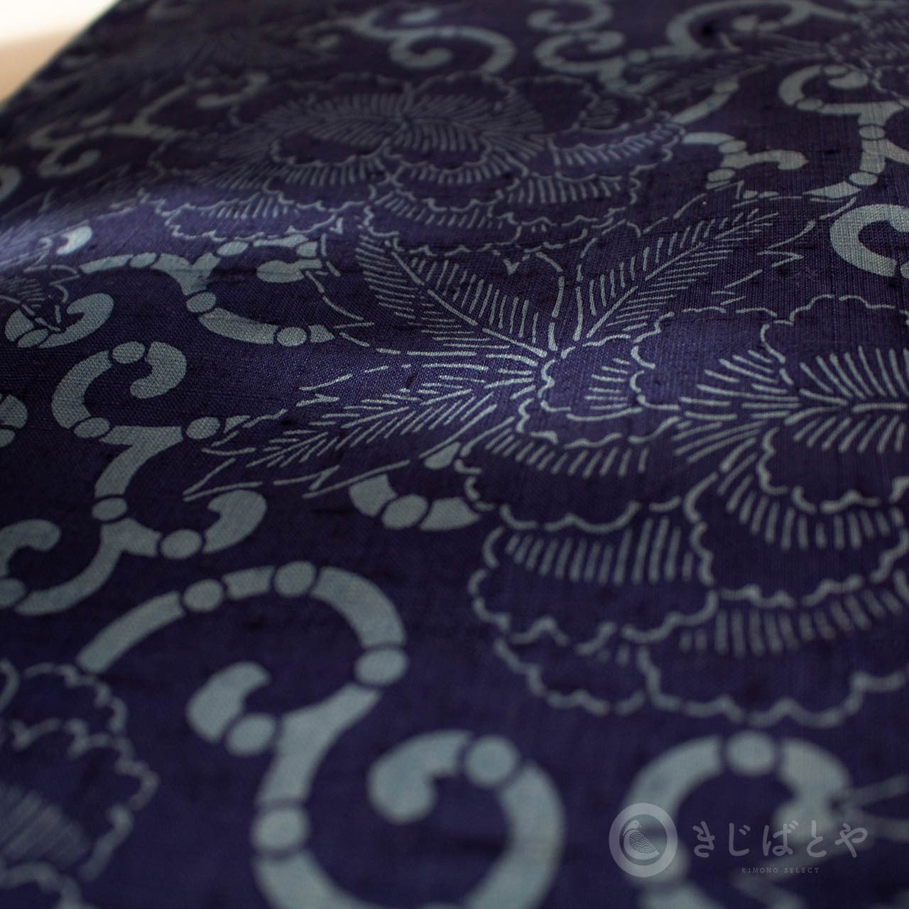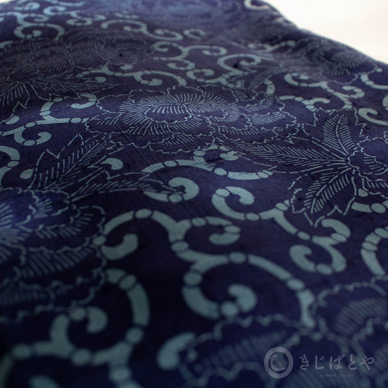 地は濃藍(こいあい:暗い青)で、淡く抜かれた色で唐花柄があしらわれています。