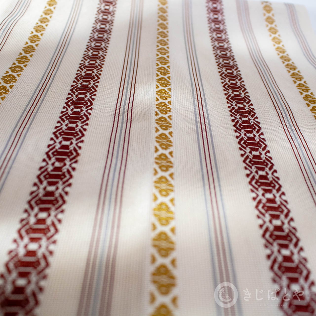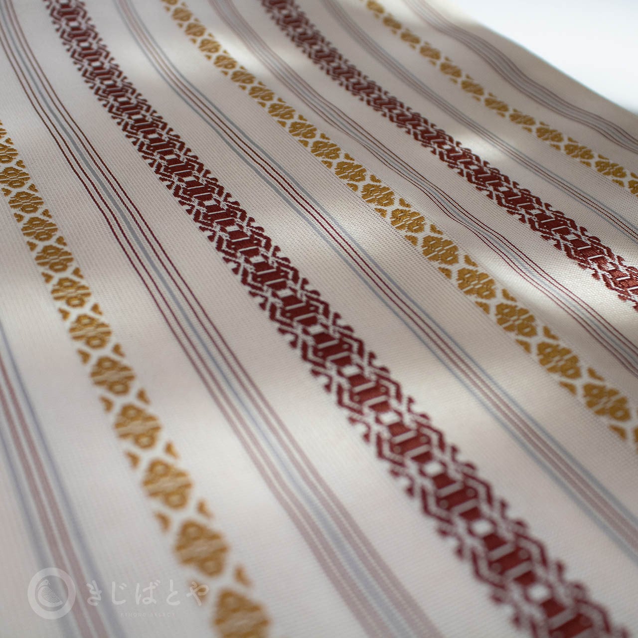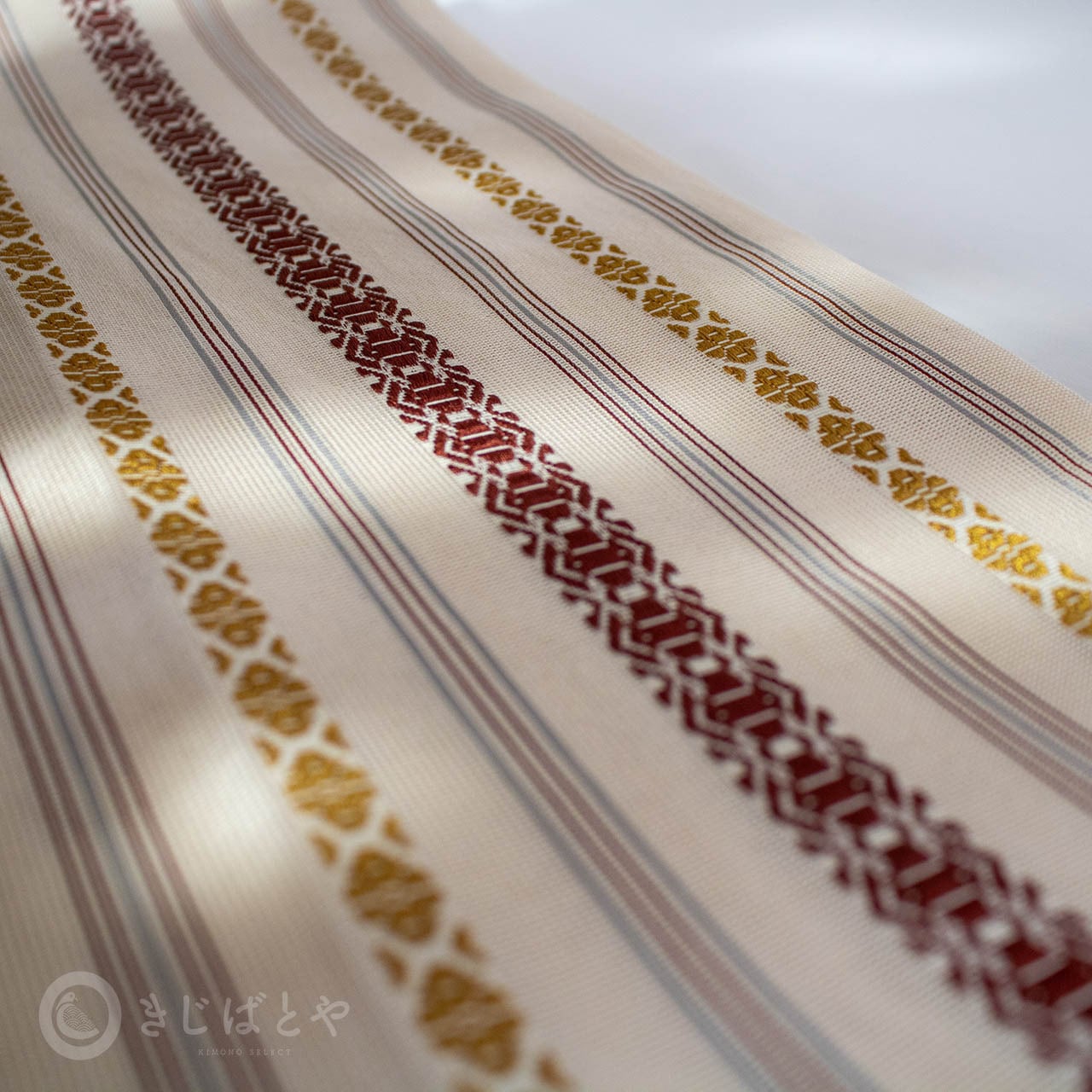 地は尾花色(おばないろ:橙みの白)が近いでしょうか。やわらかなクリーム色というと近いかもしれません。そこに蘇芳や黄金色、青袋鼠(せいたいねず:淡く渋い青)などで献上柄が織られており、とても涼しげで美しいです。