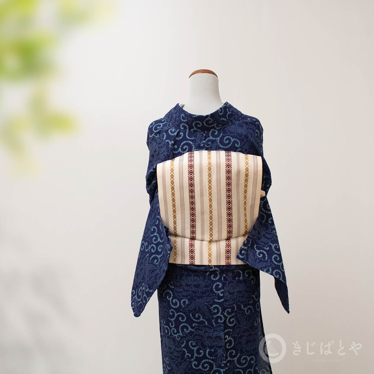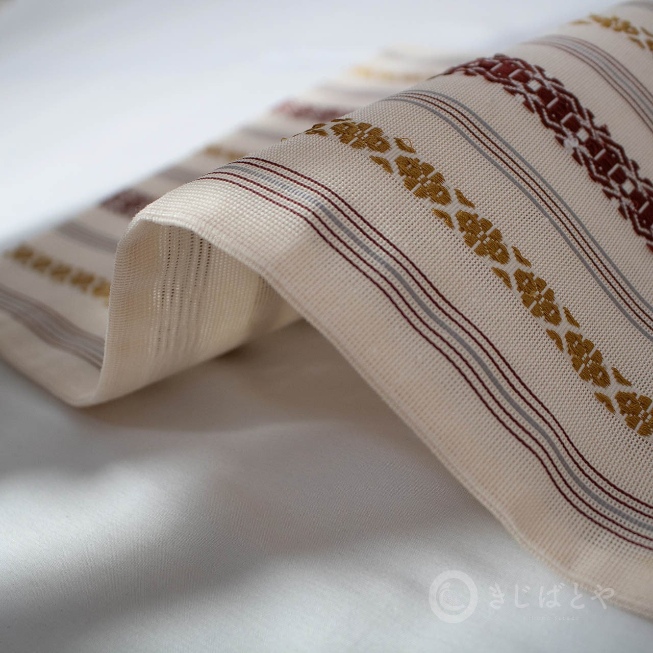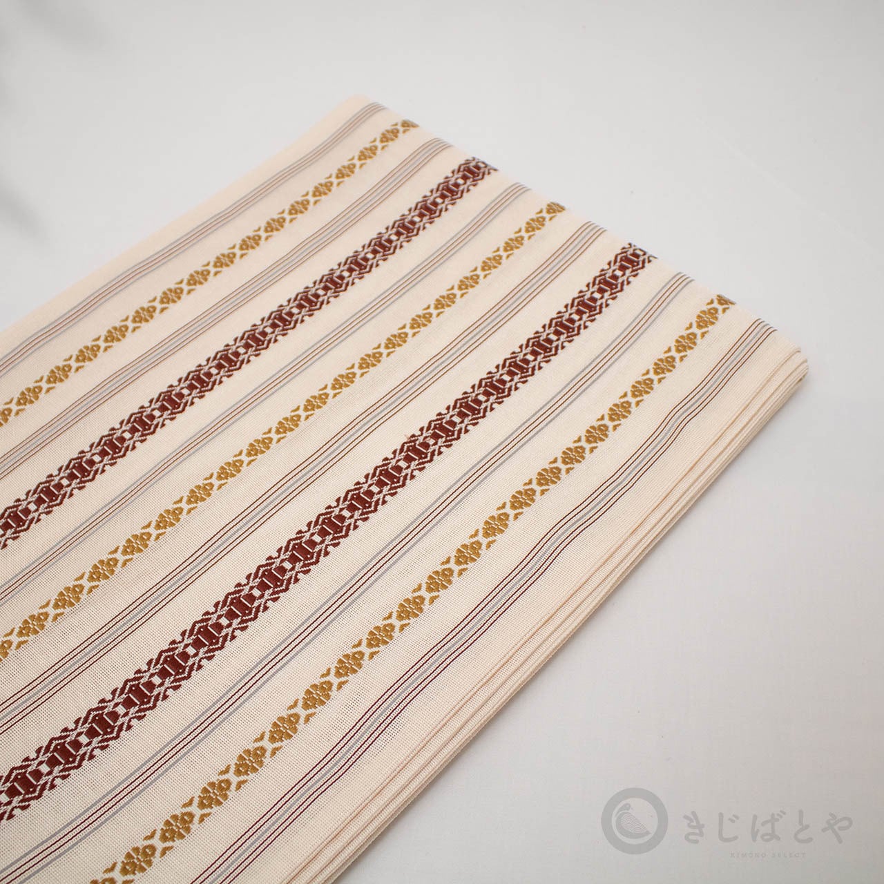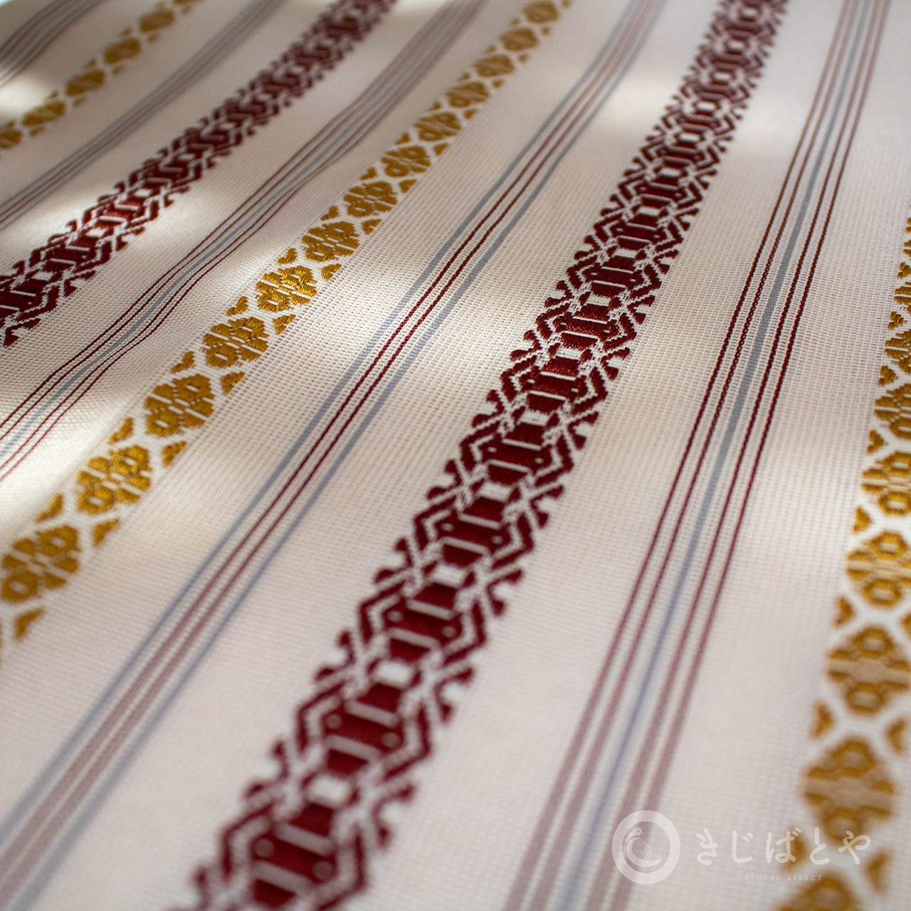 地は尾花色(おばないろ:橙みの白)が近いでしょうか。やわらかなクリーム色というと近いかもしれません。そこに蘇芳や黄金色、青袋鼠(せいたいねず:淡く渋い青)などで献上柄が織られており、とても涼しげで美しいです。