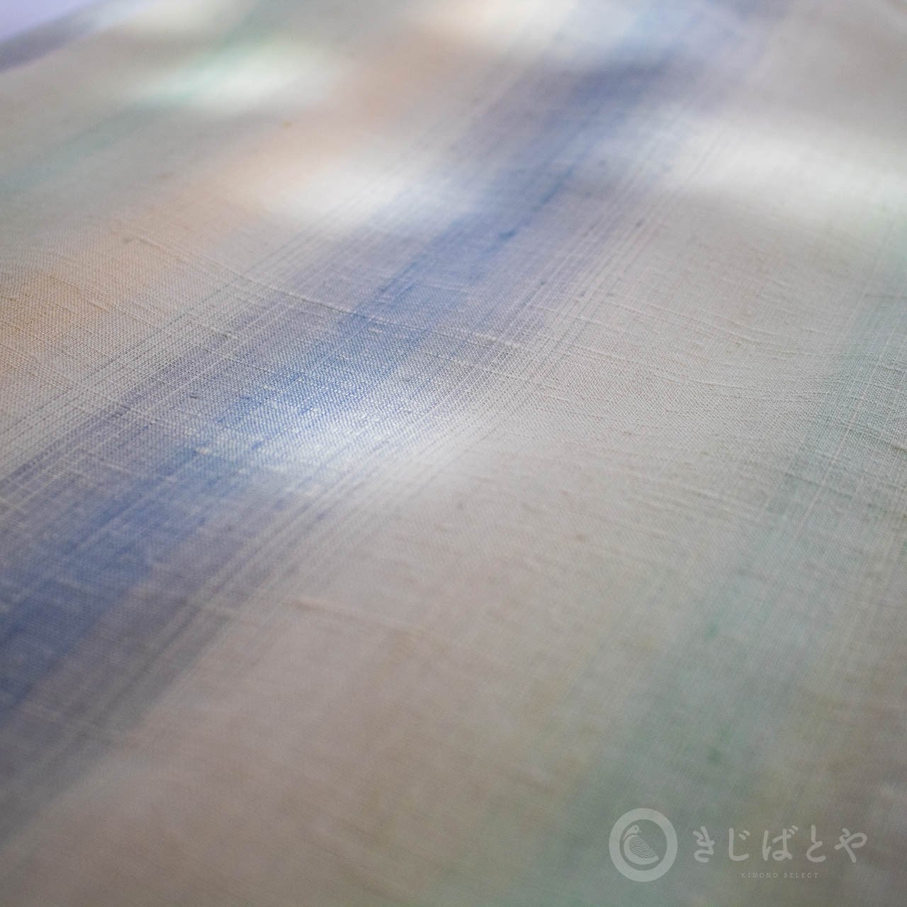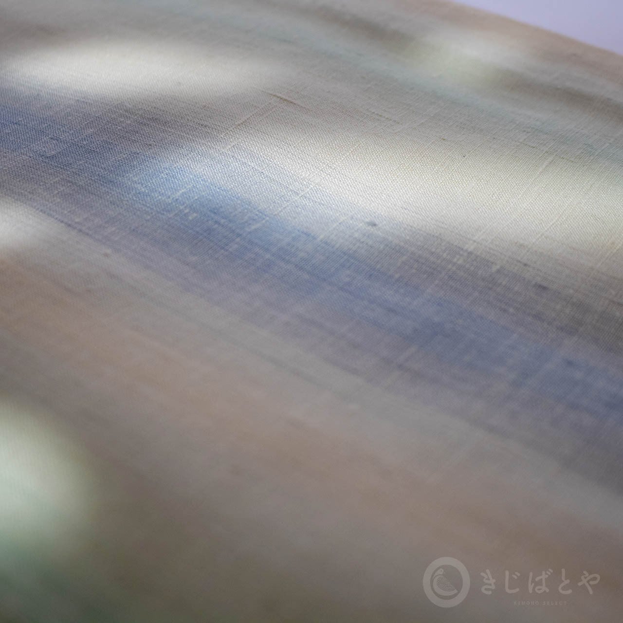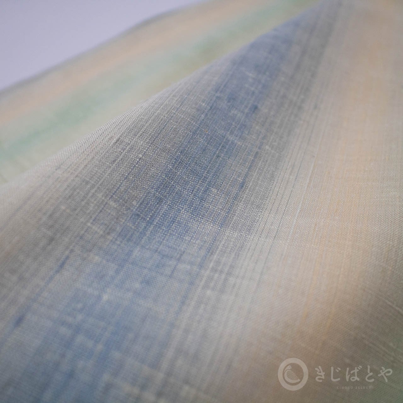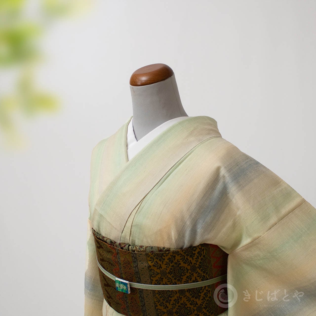 地は淡い麹色(こうじいろ:淡く渋い橙)で、「淡いたまご色」と呼ぶ方が多いかもしれません。そこに青(青と呼ぶのが一番近い印象です)や薄浅葱(うすあさぎ:明るい青緑)、薄鼠(うすねず:明るい灰)の縞がかすれたように入り、ふしぎな透明感と奥ゆきを感じる色柄です。