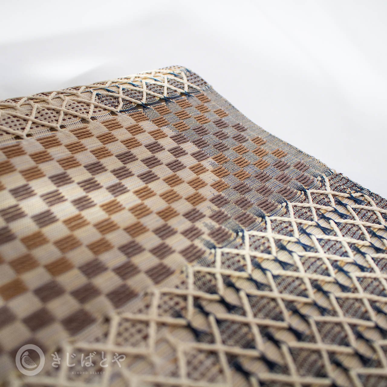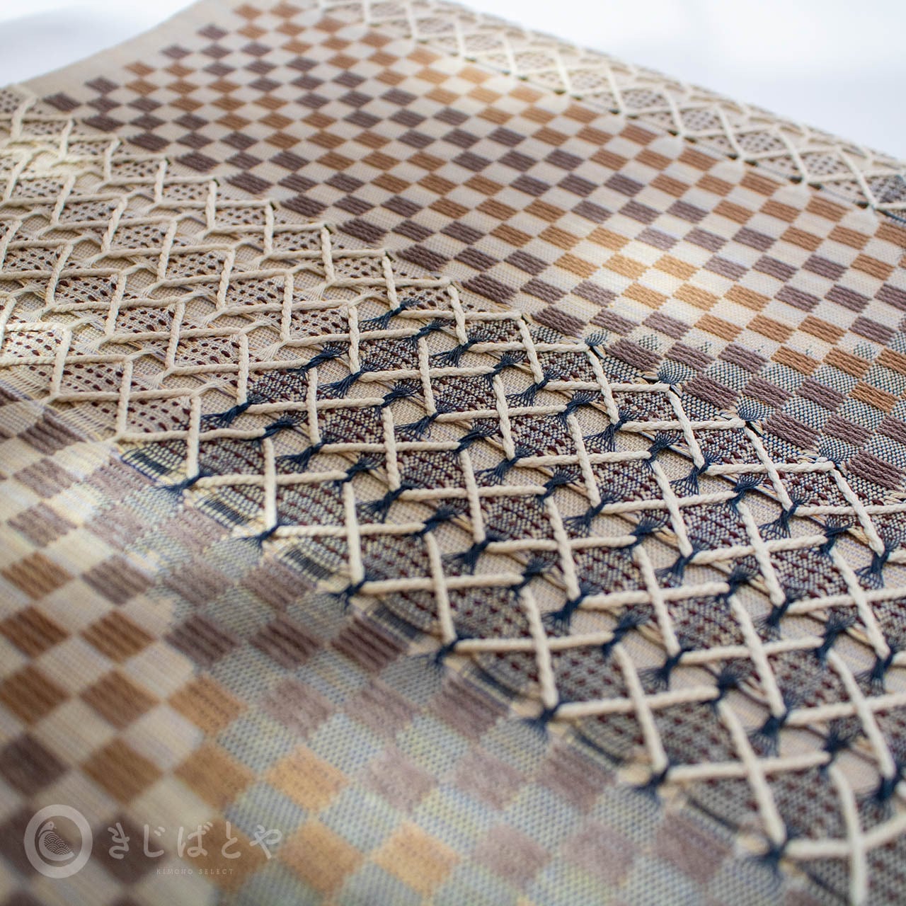 地は蕎麦切色(そばきりいろ:橙みの明るい灰)で、鳩羽鼠(はとばねず:紅紫みの灰)、藍、朽葉色(くちばいろ:深く渋い橙)、藍鼠(あいねず:青みの暗い灰)・・・などなどで柄が織られており、とても美しいです。