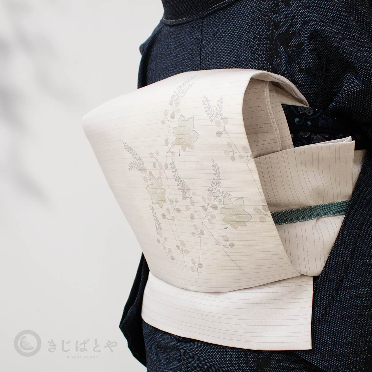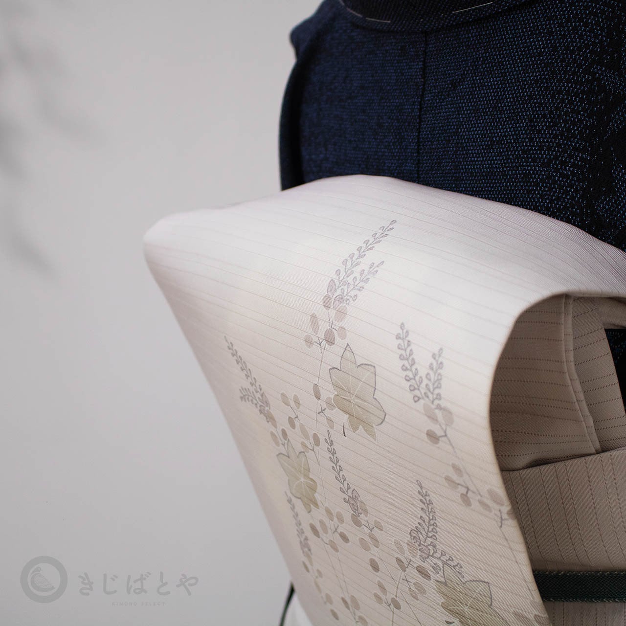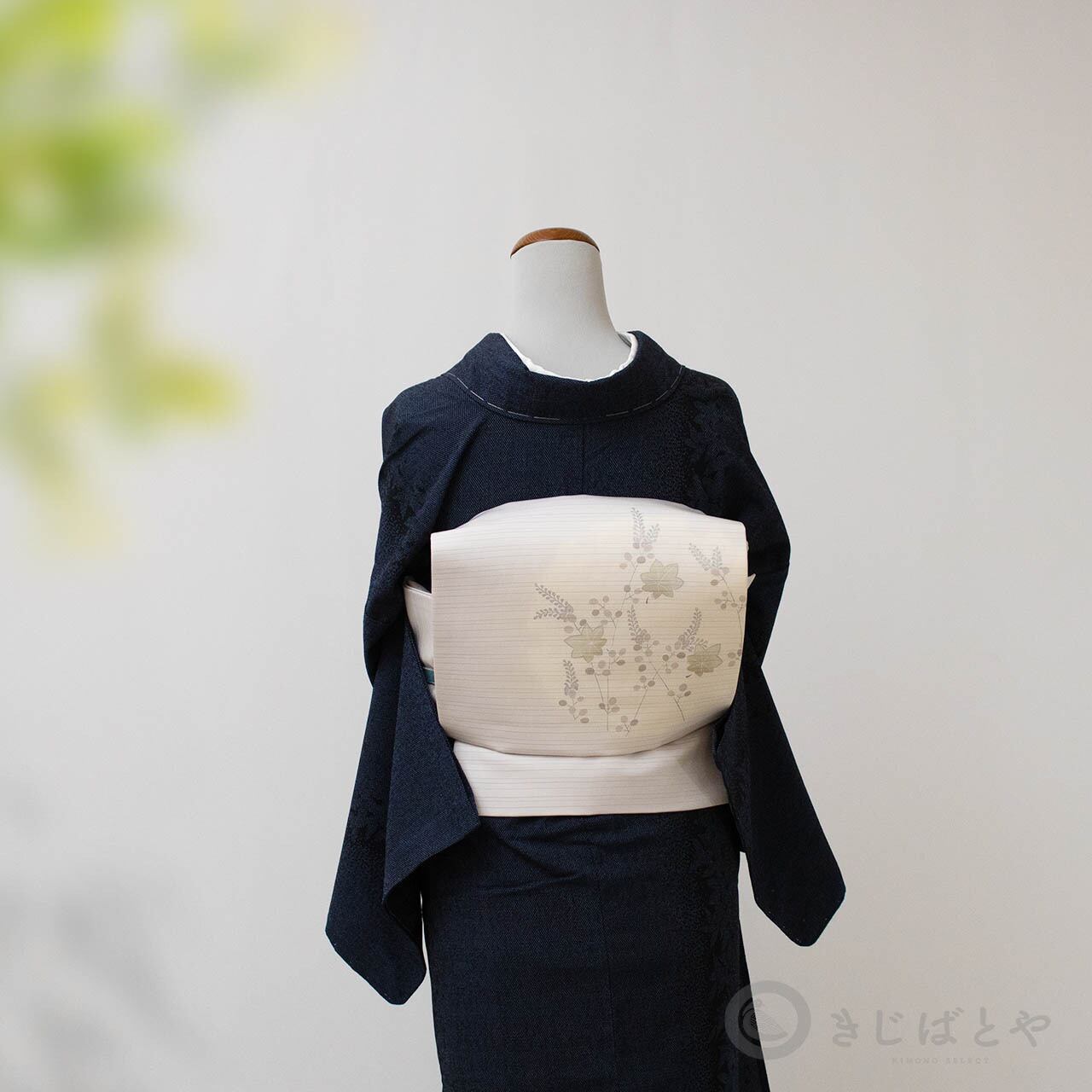 淡い色みで季節の花々があしらわれており、その抑えた色みがほどよく、夏の帯らしく涼しげな印象になっています。