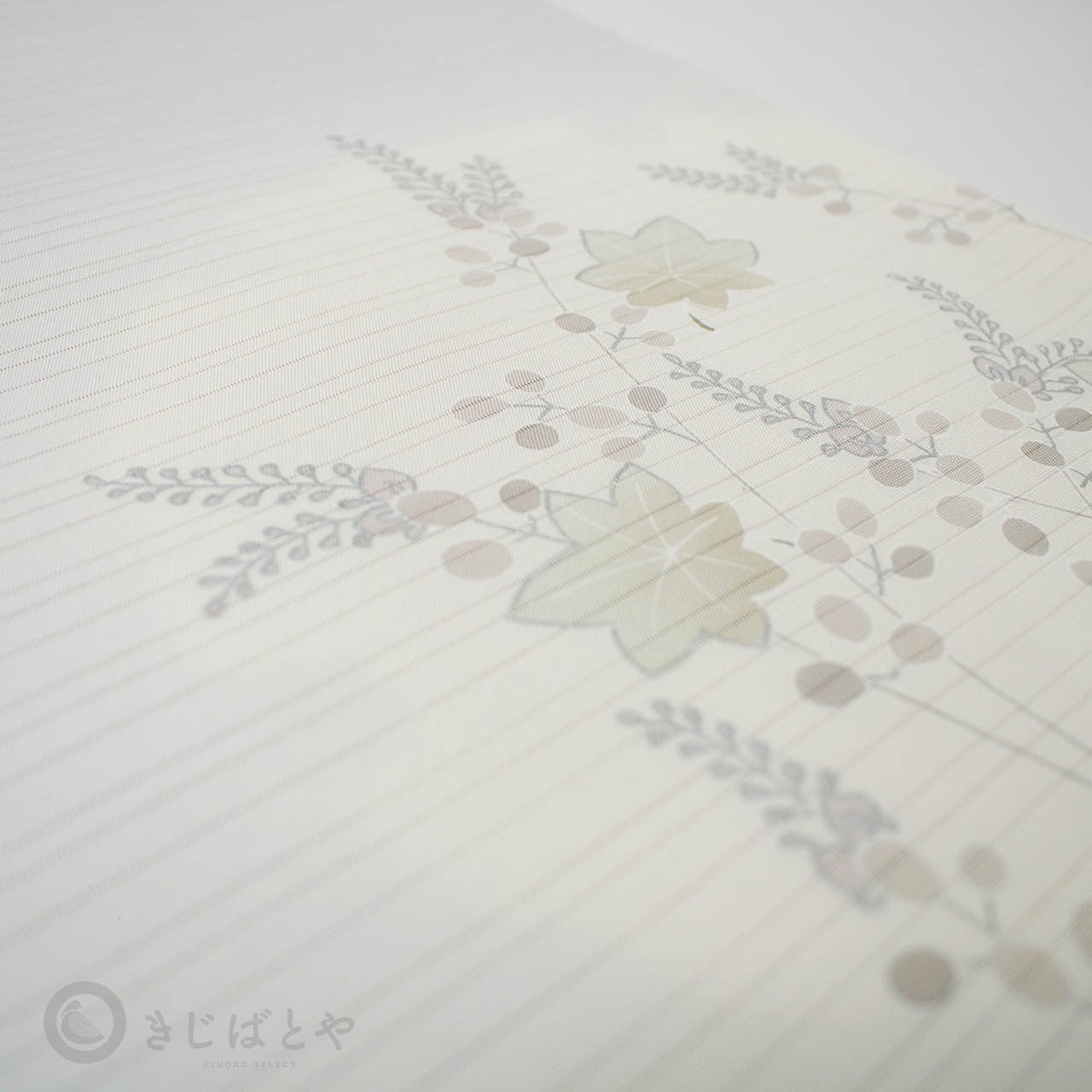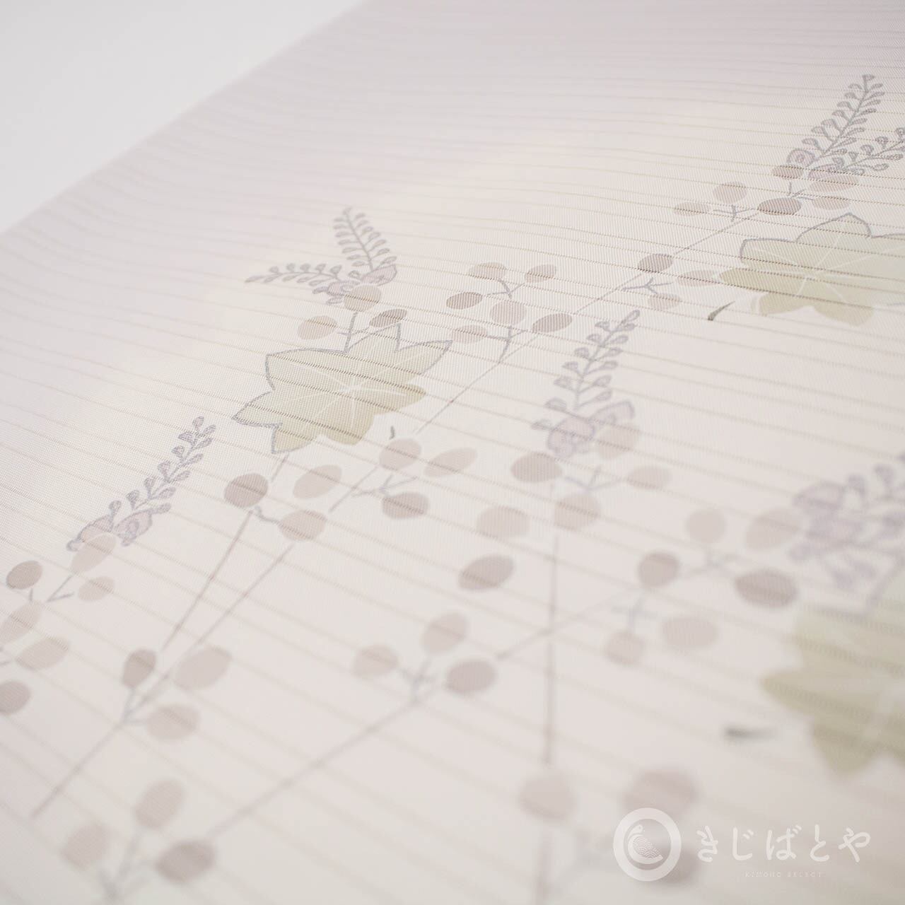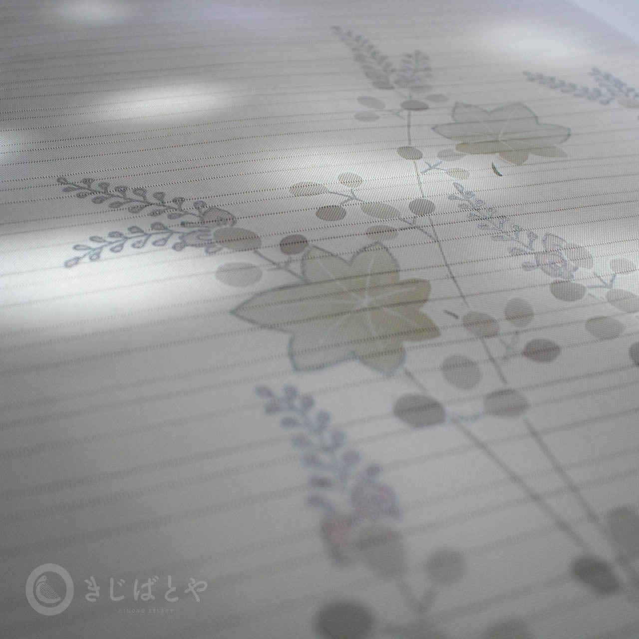 淡い色みで季節の花々があしらわれており、その抑えた色みがほどよく、夏の帯らしく涼しげな印象になっています。