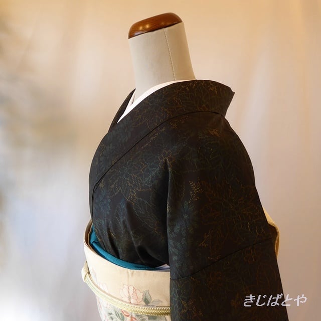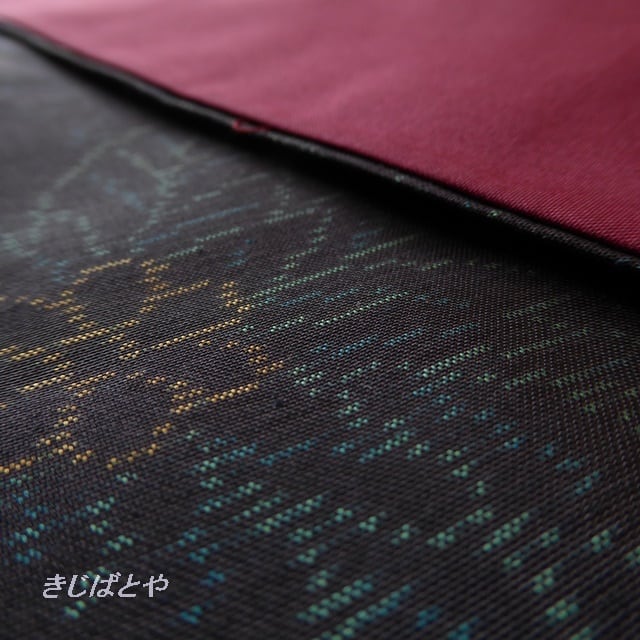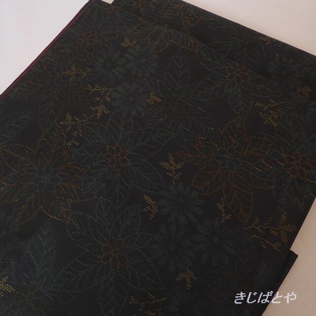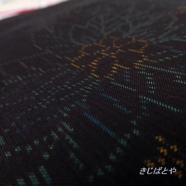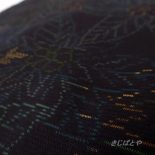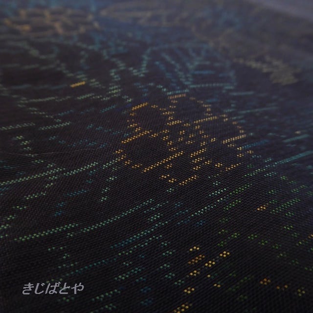 地色は深い黒で、そこに常葉緑、セルリアンブルー、ターコイズ、ピーコックグリーン、青磁、橙・・などの色で織られた花の柄が、美しく浮かび上がります。