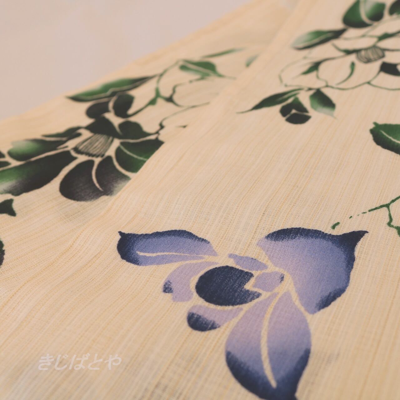 白地に椿の柄が美しい、綿麻の浴衣です。