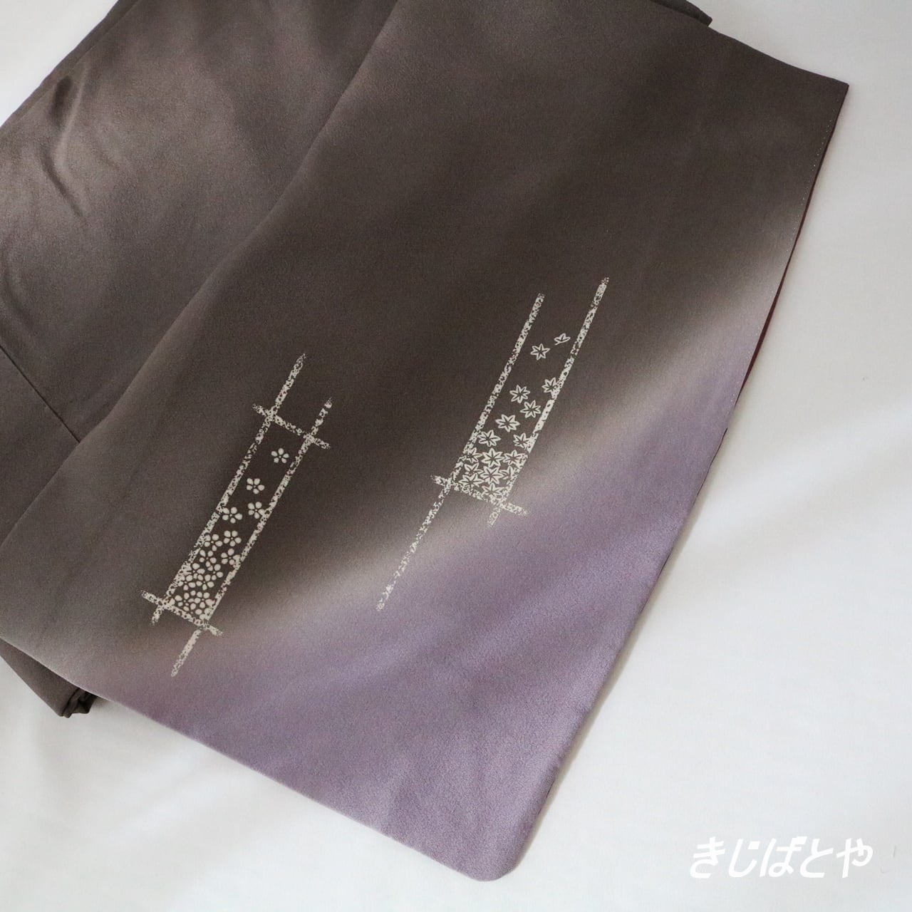 袖先と裾には貴族鼠(きぞくねず:紫みの灰)へのぼかしが入っており、地味になりすぎず、上品にほんの少しの彩りを加えられた付け下げです。