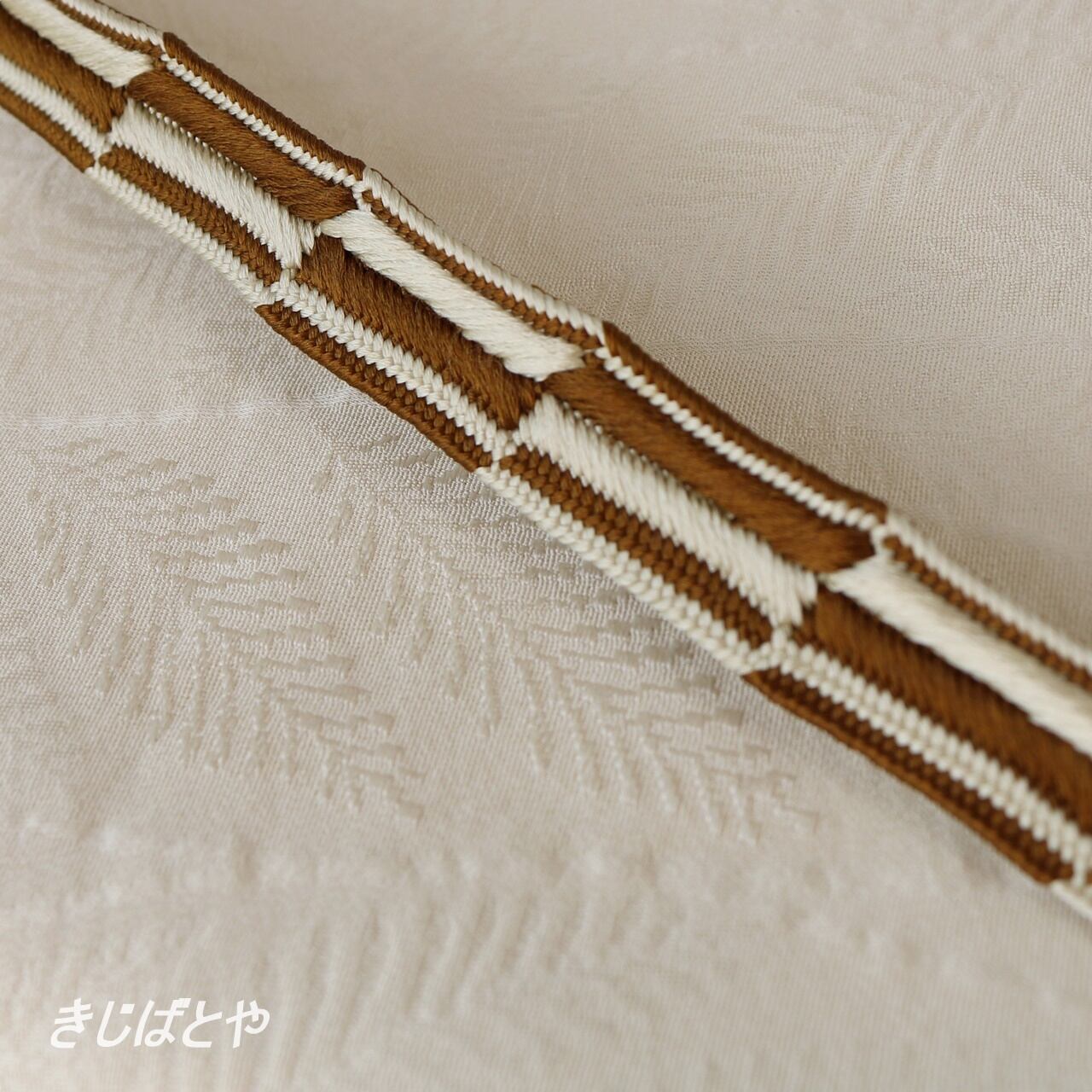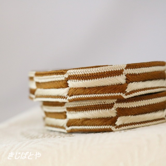 色はやわらかな白と昔唐茶で、どこか動物の毛並みをおもわせるような質感です。ハラコの細いベルトを思わせるような、不思議な質感です。
