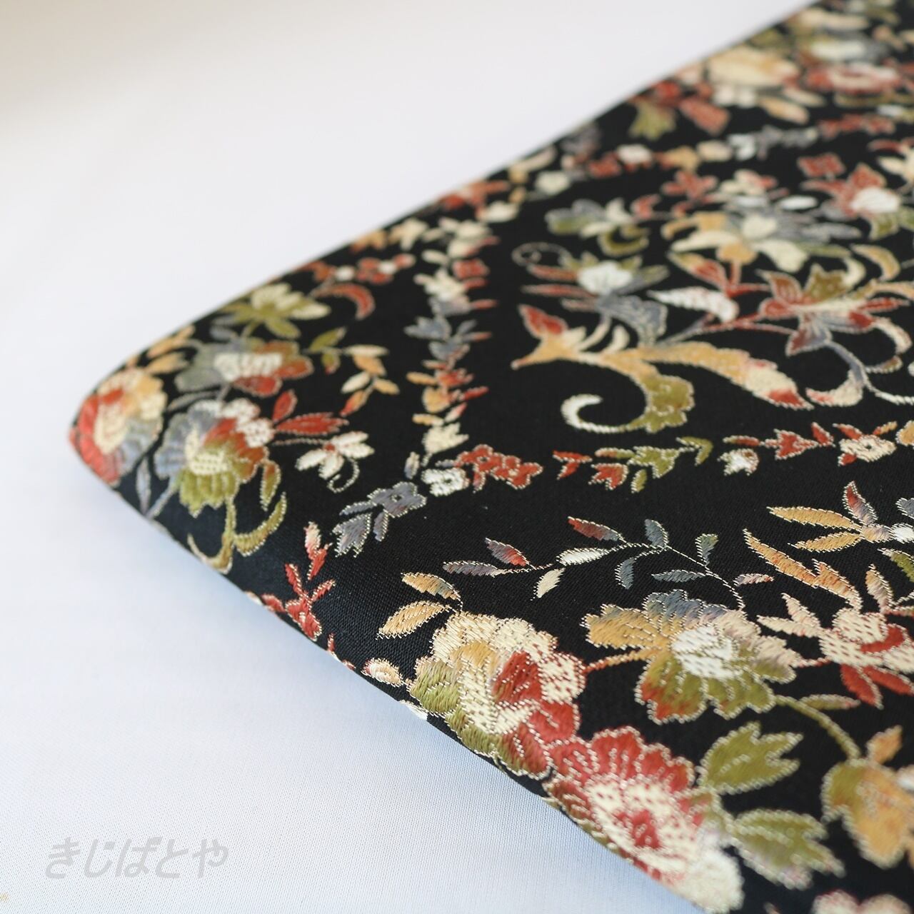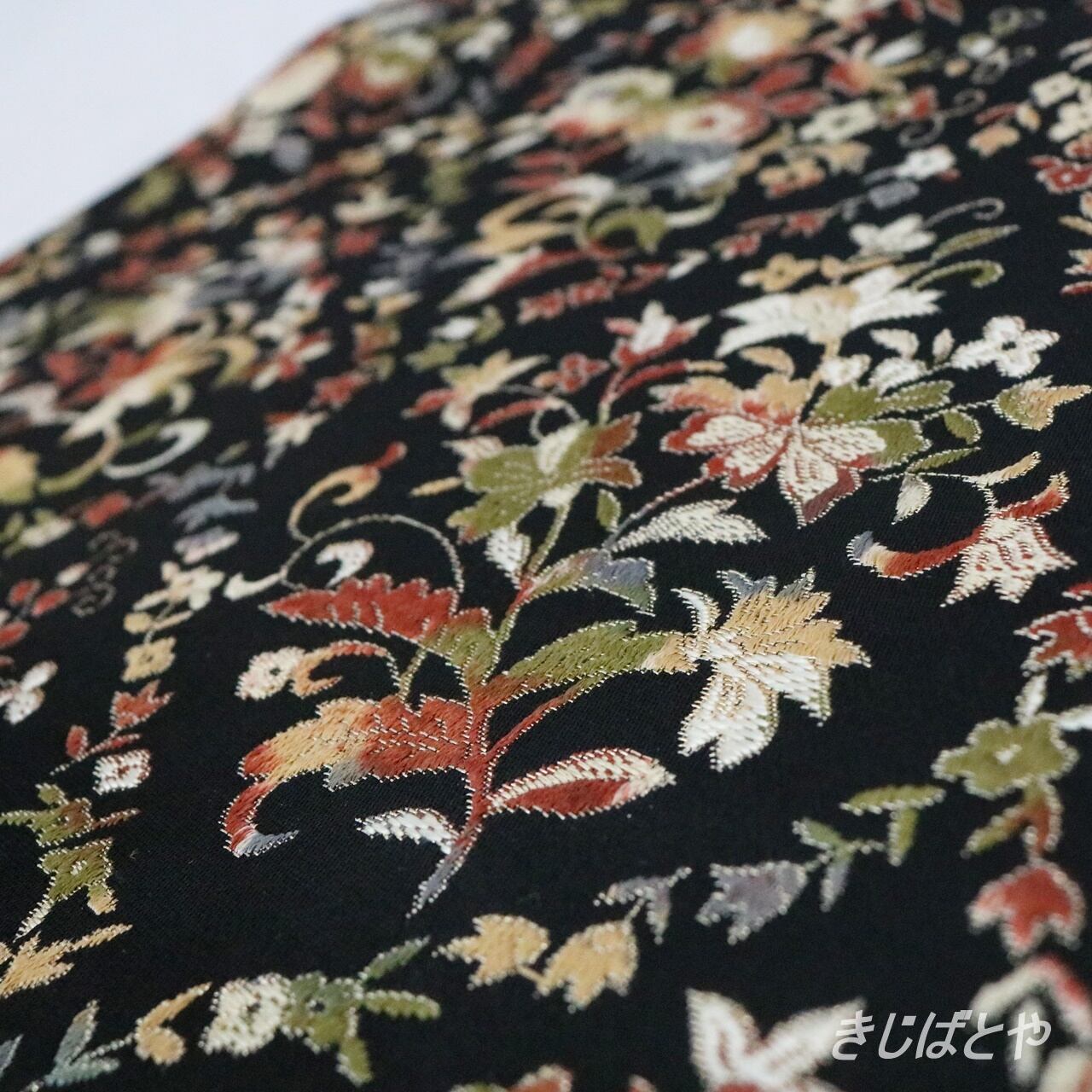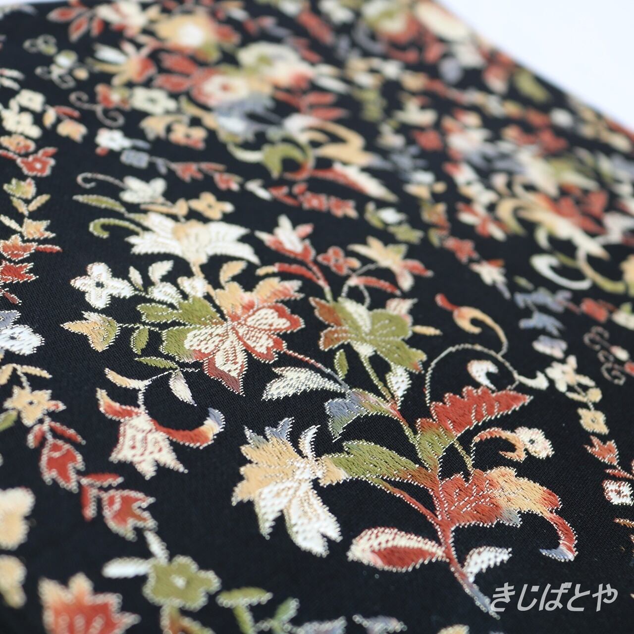 地は深い深い漆黒で、抑えた色みで柄が織られています。