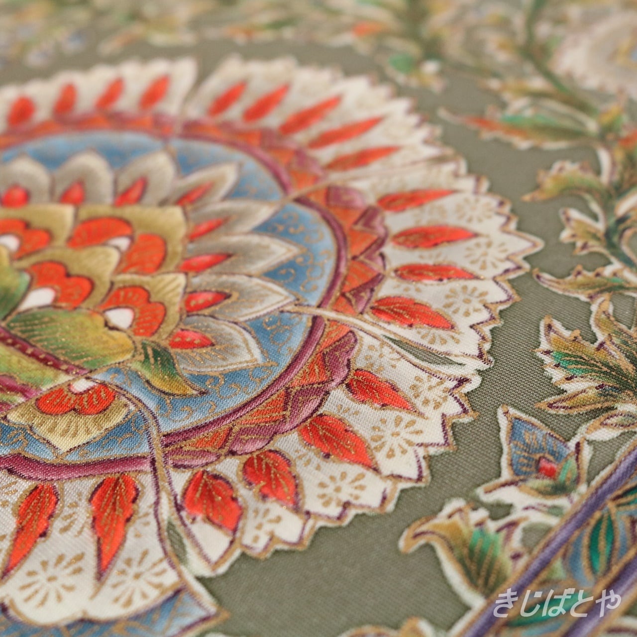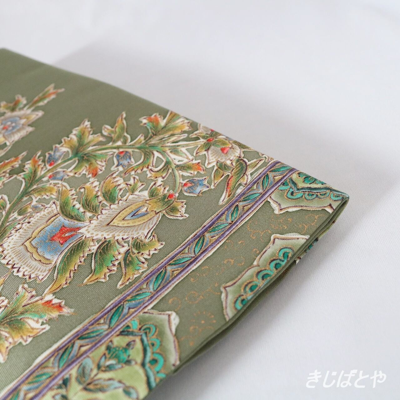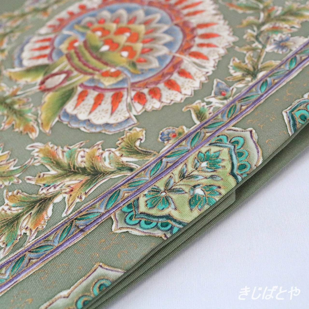 正絹塩瀬 岩井茶に更紗柄のなごや