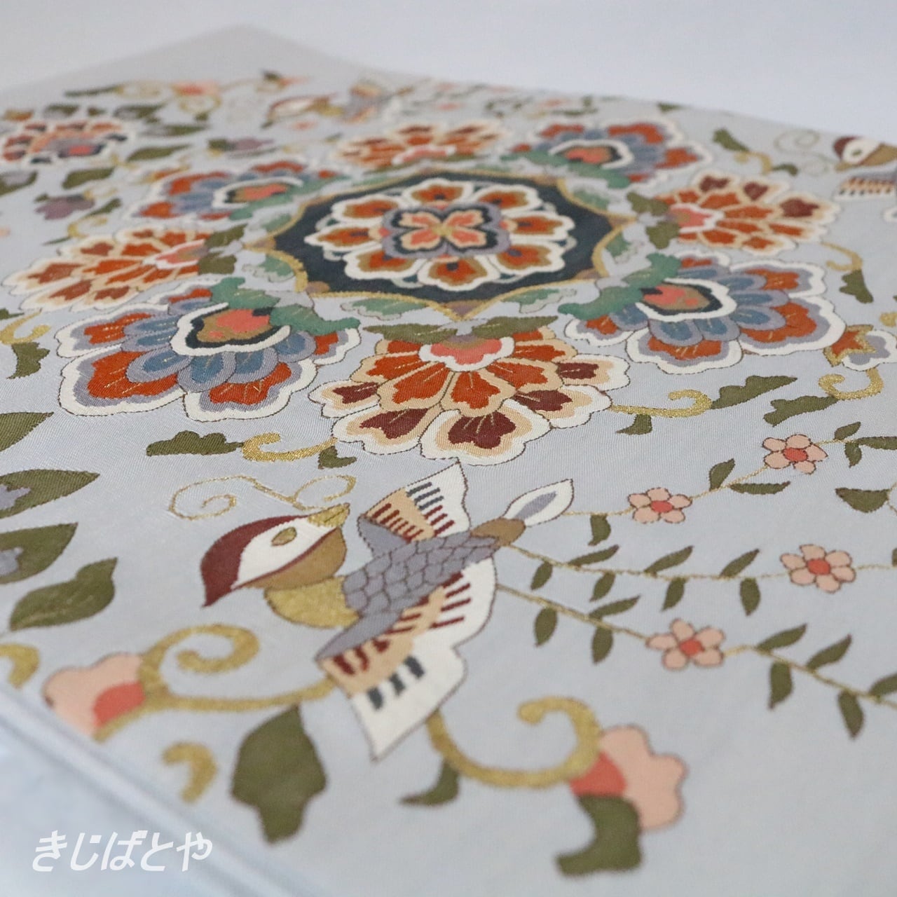 淡い色に花鳥の柄が美しい、正絹の袋帯です。