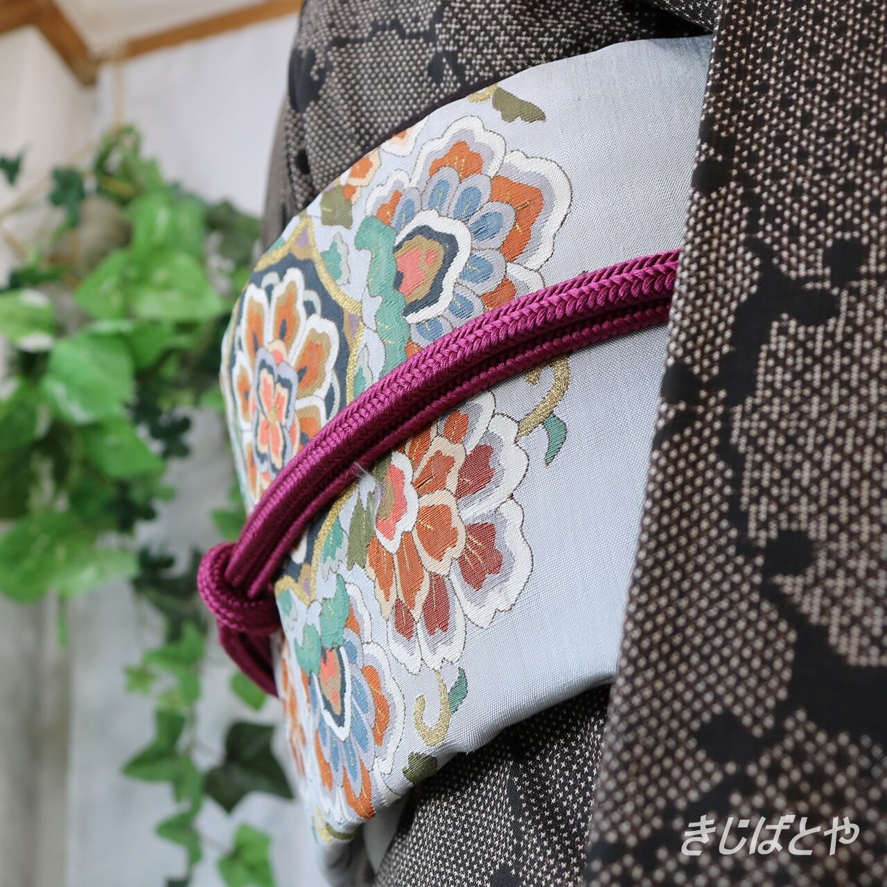 淡い地に折られた花鳥がとても美しくかわいらしいです。柄の大きさがほどよく、柄のある着物ともうまく調和してくれます。たくさんの色がつかわれているため、小物とも合わせやすく、かなり重宝しそうな帯です。