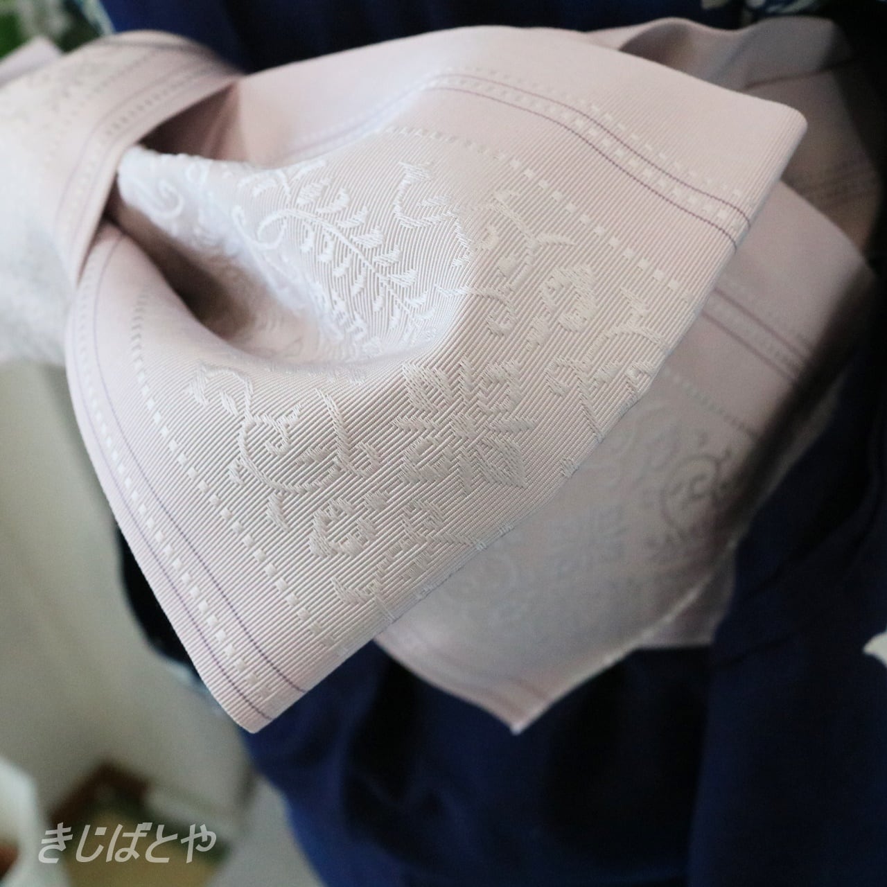 地は薄桜(うすざくら:紅みの白)で、ごくごく淡い桜色・・・というと近いでしょうか。そこに、光のあたり具合や着る人のうごきによって白で織られた織り柄が美しく浮かび上がります。