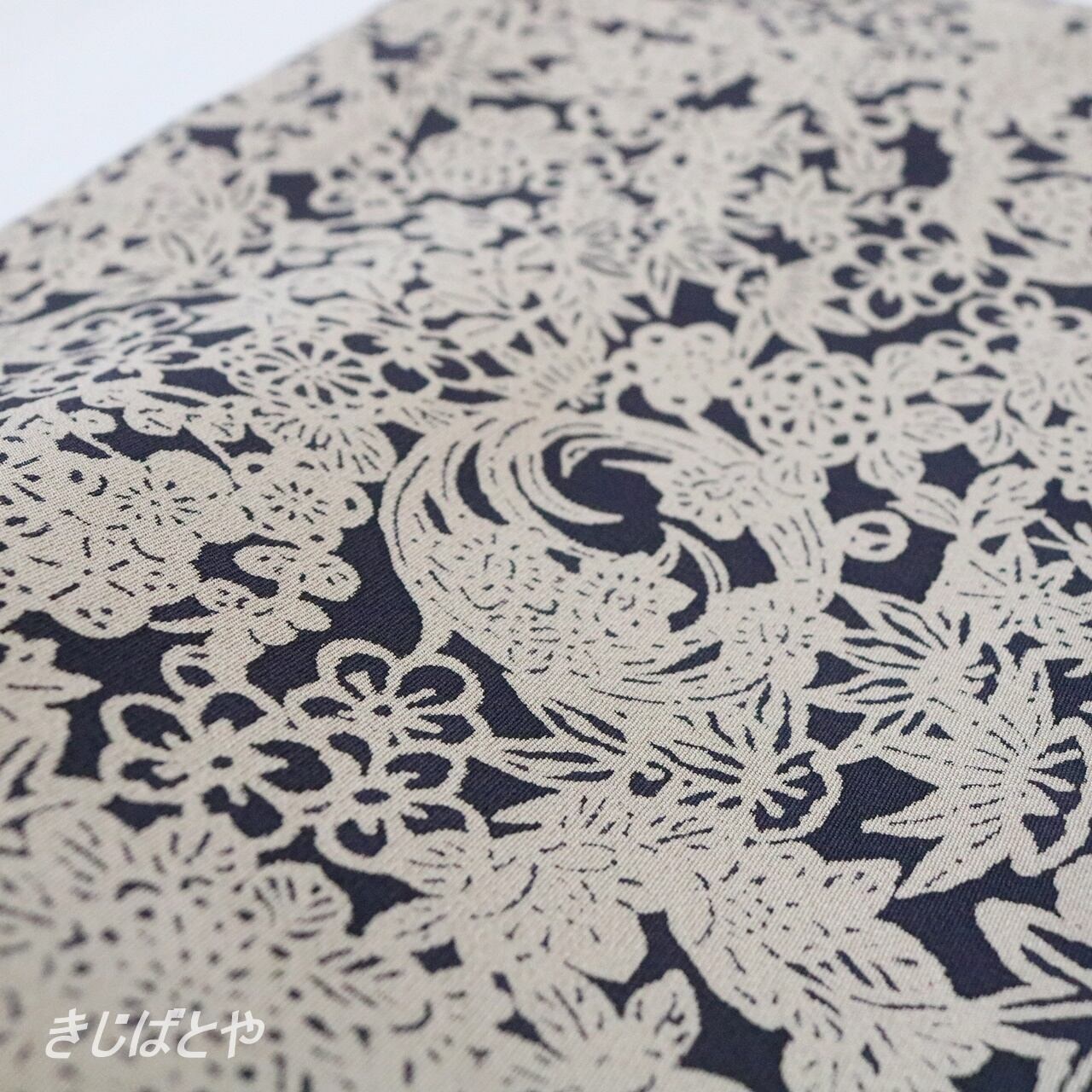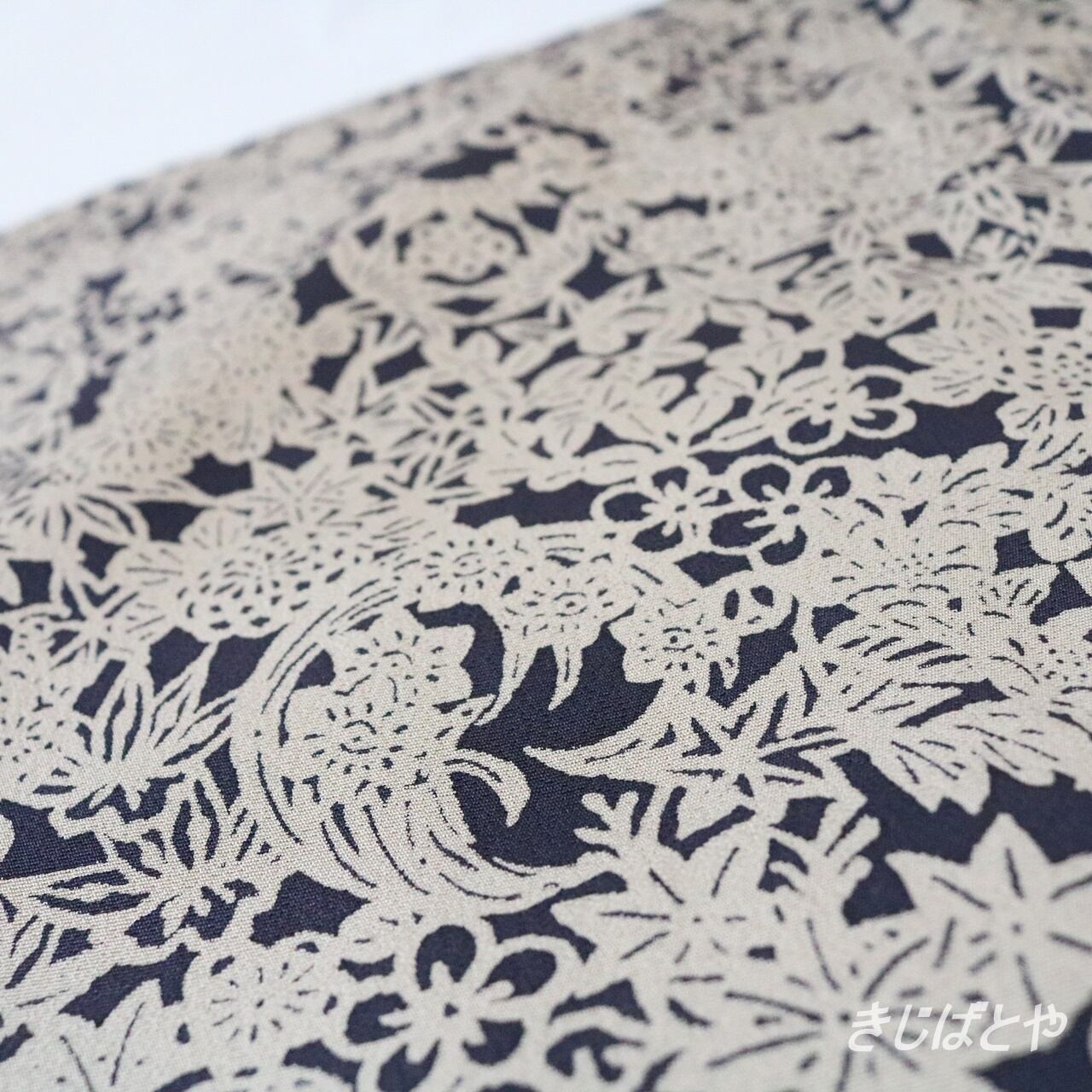黒地に銀煤竹(ぎんすすたけ:橙みの灰)で梅、楓、竹、桔梗、萩・・・などなどの季節の花々が染められており、とても美しいです。