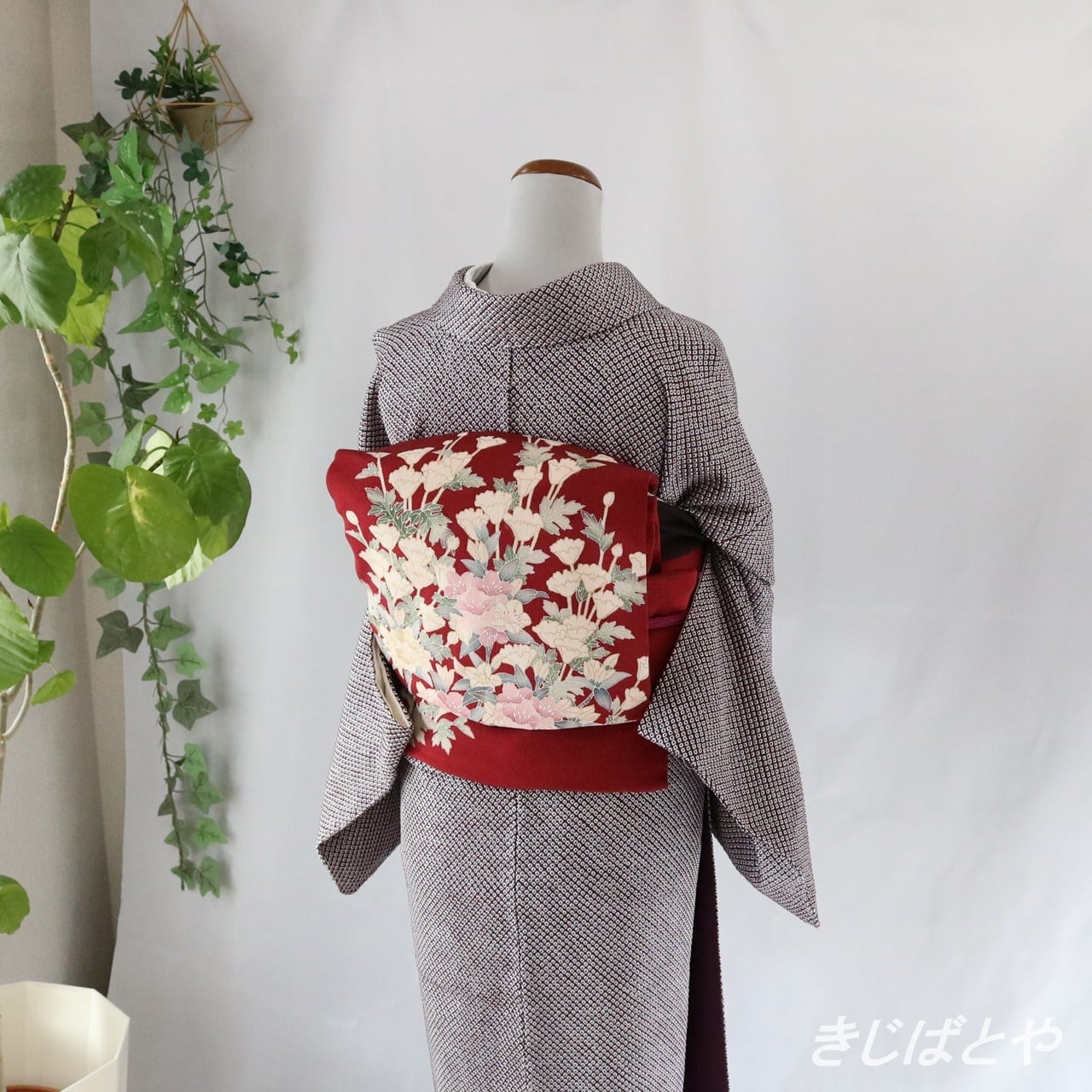 地は二人静(ふたりしずか:深く渋い紅紫)で、渋みのある深い深い紫です。室内で少し離れるとチョコレート色に見えるくらいの深さと渋さで、明るいところで見ると紫が出てくる感じです。