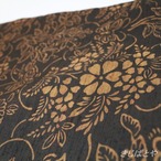 地は暗鳶色(あんとびいろ:赤みの黒)で、深い深い焦げ茶というと近いでしょうか。そこに琥珀色で、透かし模様のように柄が織られており、なんとも美しく、着る人の肌を白く美しく見せてくれる色みです。