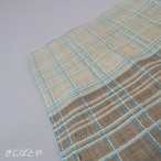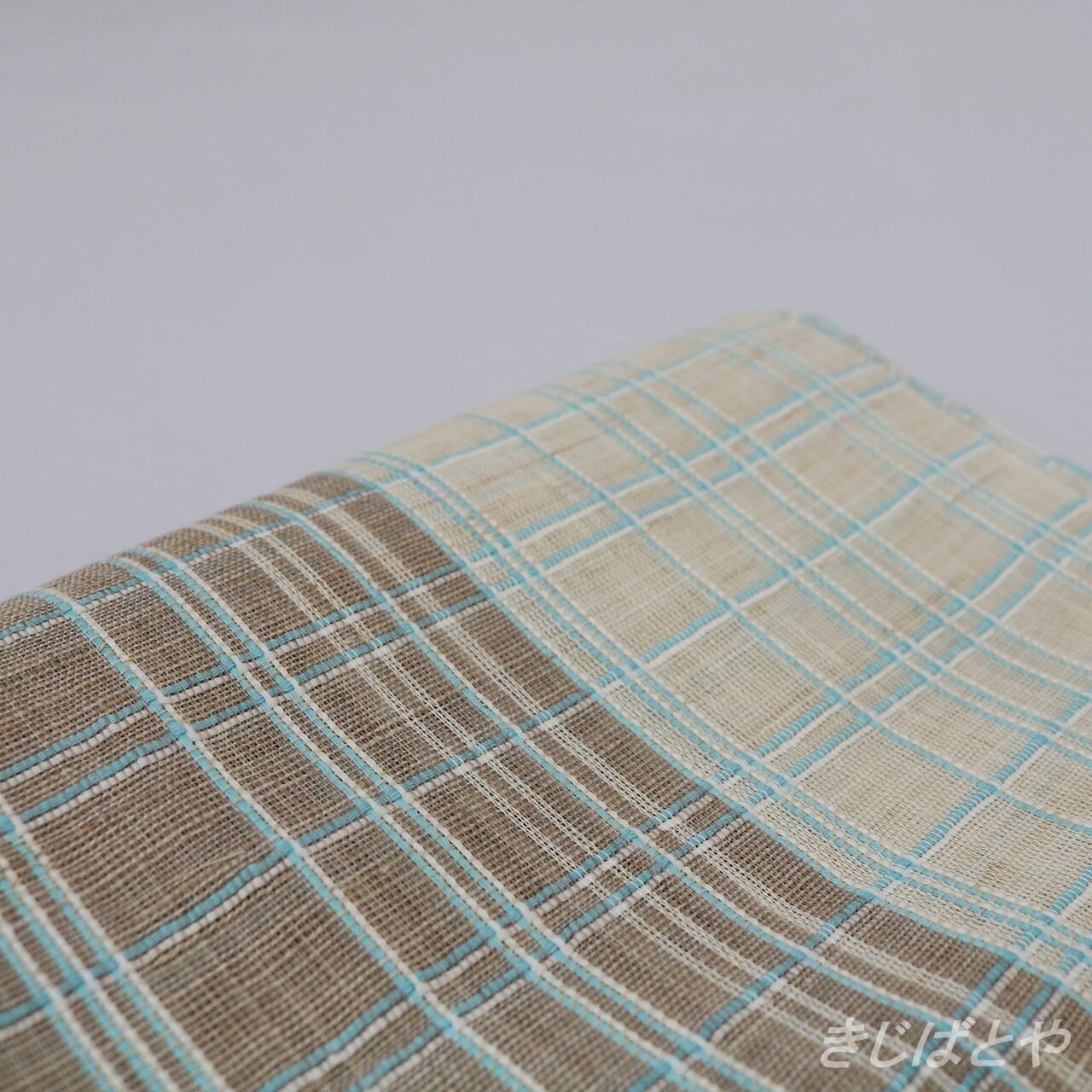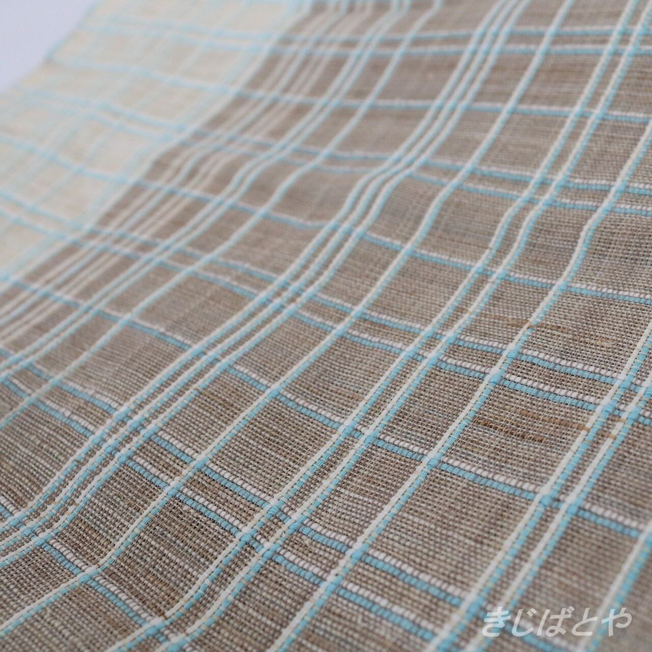 地は砥粉色と光悦茶で、その上に水浅葱で格子が織られています。