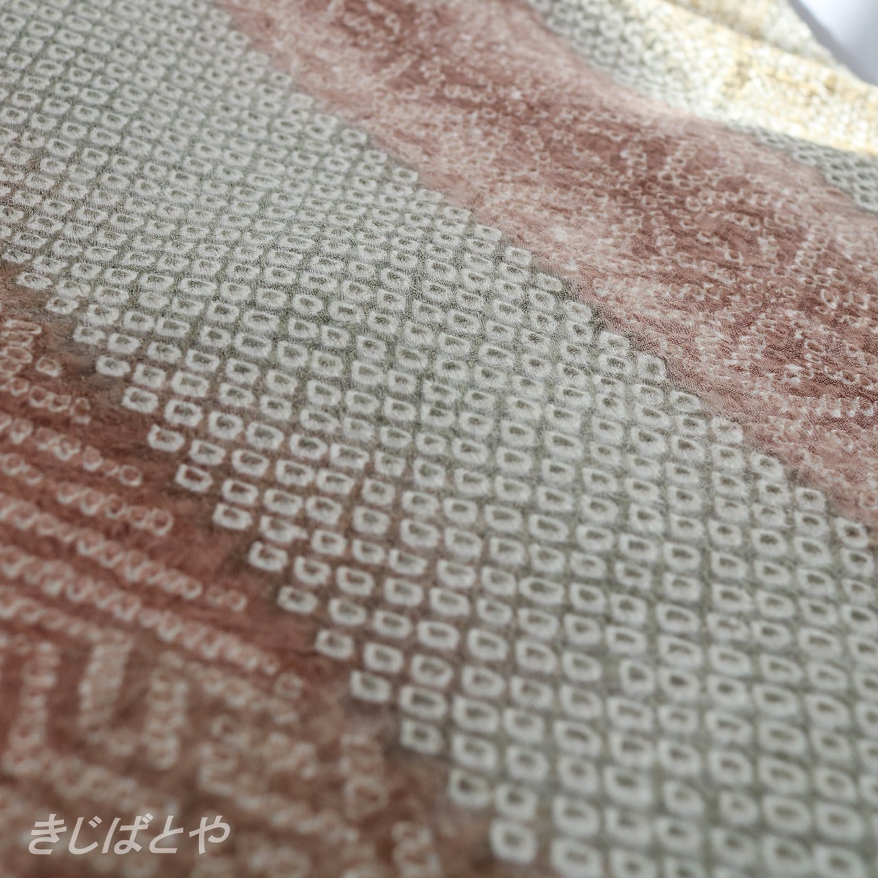 唐金色(からかねいろ:明るく渋い橙)、紅鳶色(とびいろ:深く渋い赤)、小豆鼠(あずきねず:紅赤みの灰)、利休鼠(りきゅうねず:緑みの灰)の縞が絞りによってやわらかな陰影となり、なんとも優しく美しい色みになっています。