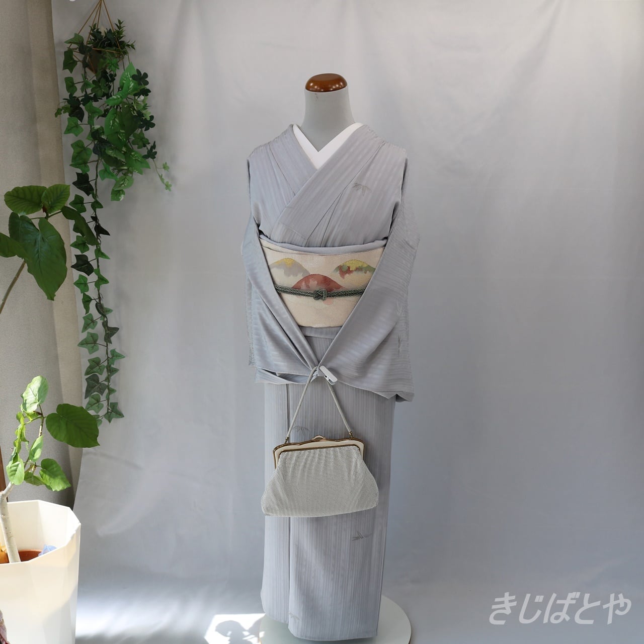 地模様の竹縞が美しい縦の陰影をつくりだし、飛び柄であしらわれた竹の葉がほどよくアクセントになり、とても上品です。