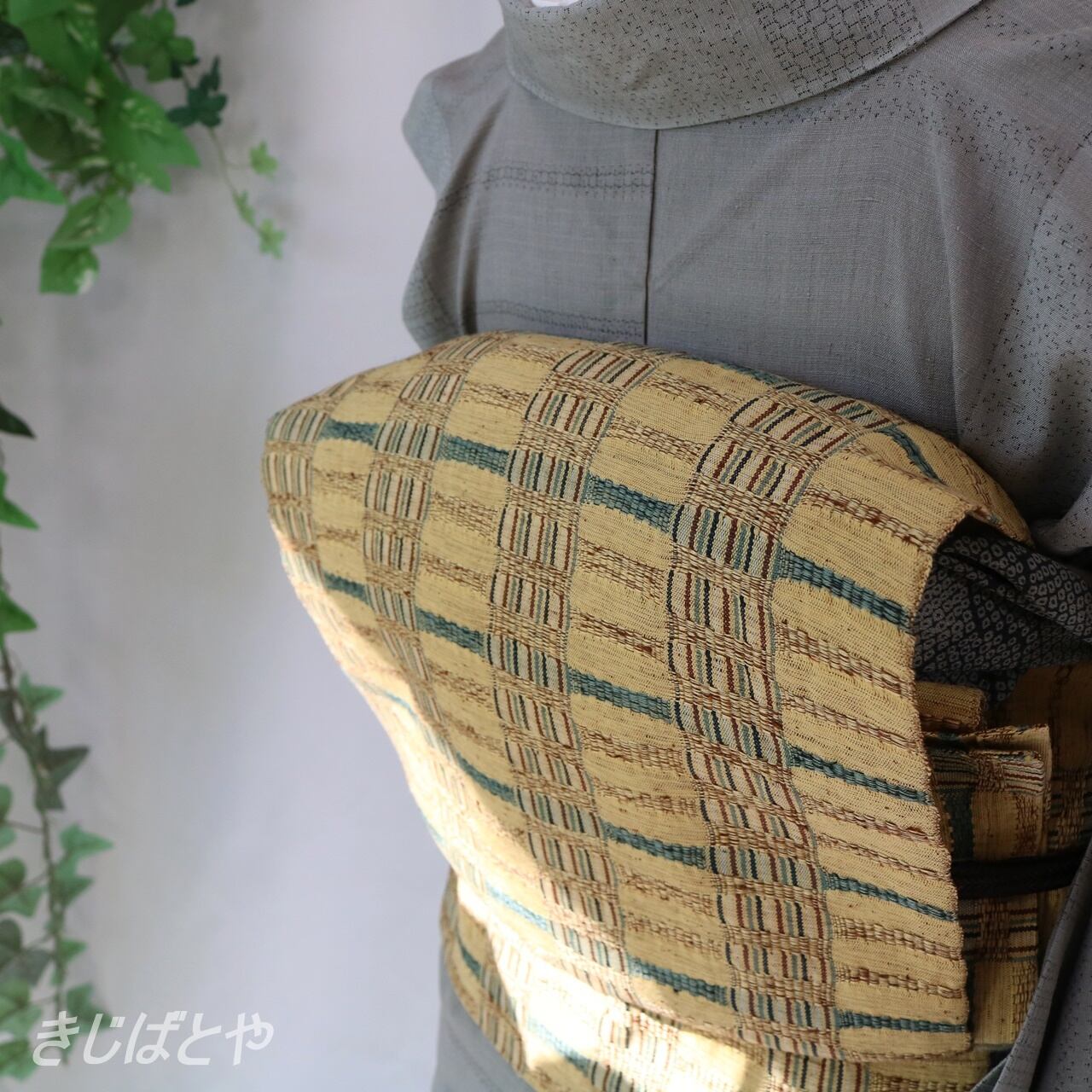 なんとも不思議な魅力の帯で、平置きにしているときよりも締めるとぐっと表情が出る素敵な帯です。藍の紬、淡い色の着物とも好相性で、かなり活躍してくれそうです。