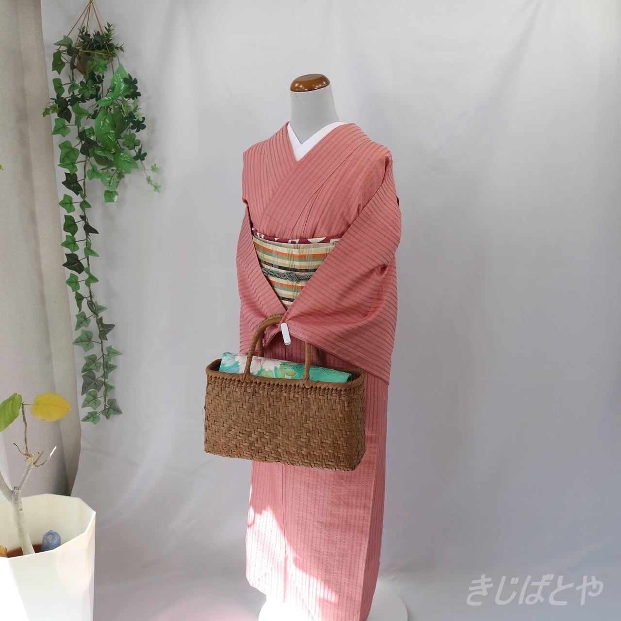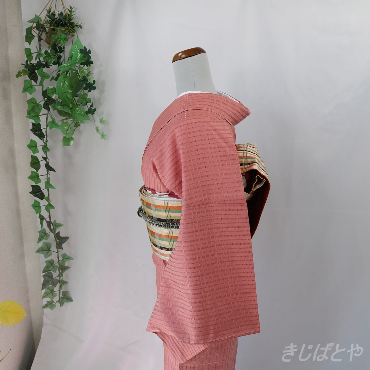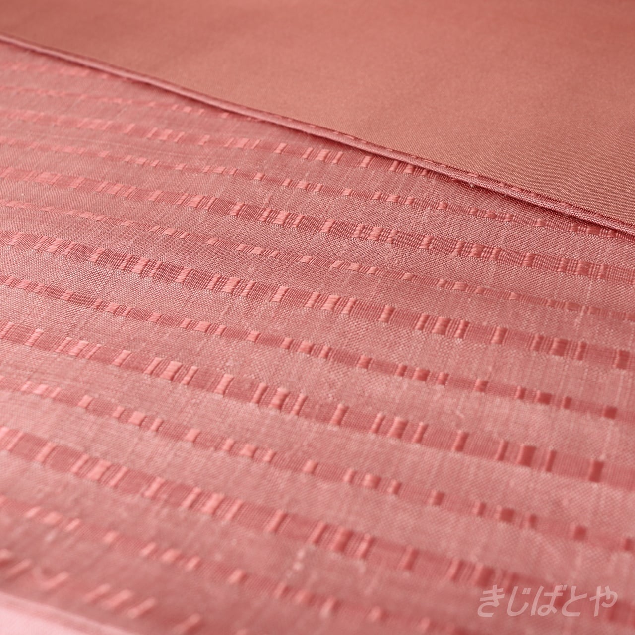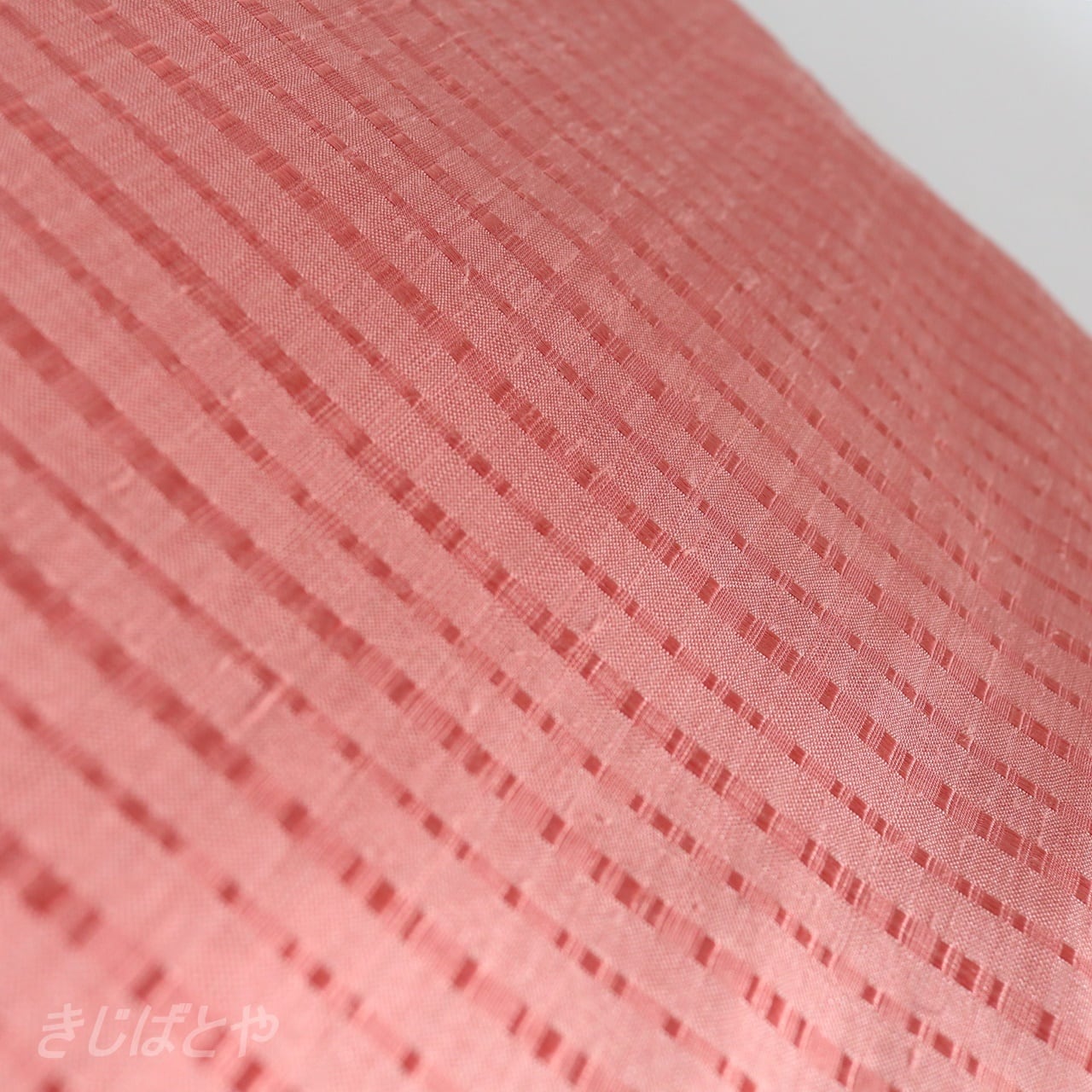 一重梅(ひとえうめ:明るい紅赤)に長春色(ちょうしゅんいろ:明るく渋い紅赤)の織りが入っています。ピンクとオレンジの中間くらいの色を少し褪せさせた感じ・・・というと近いでしょうか。
