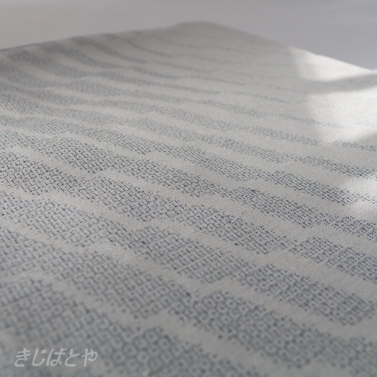 地は薄鼠(うすねず:明るい灰)で、そこに藍鼠(あいねず:青みの暗い灰)で柄が織られており、なんともいえない優しくやわらかな表情のお着物です。