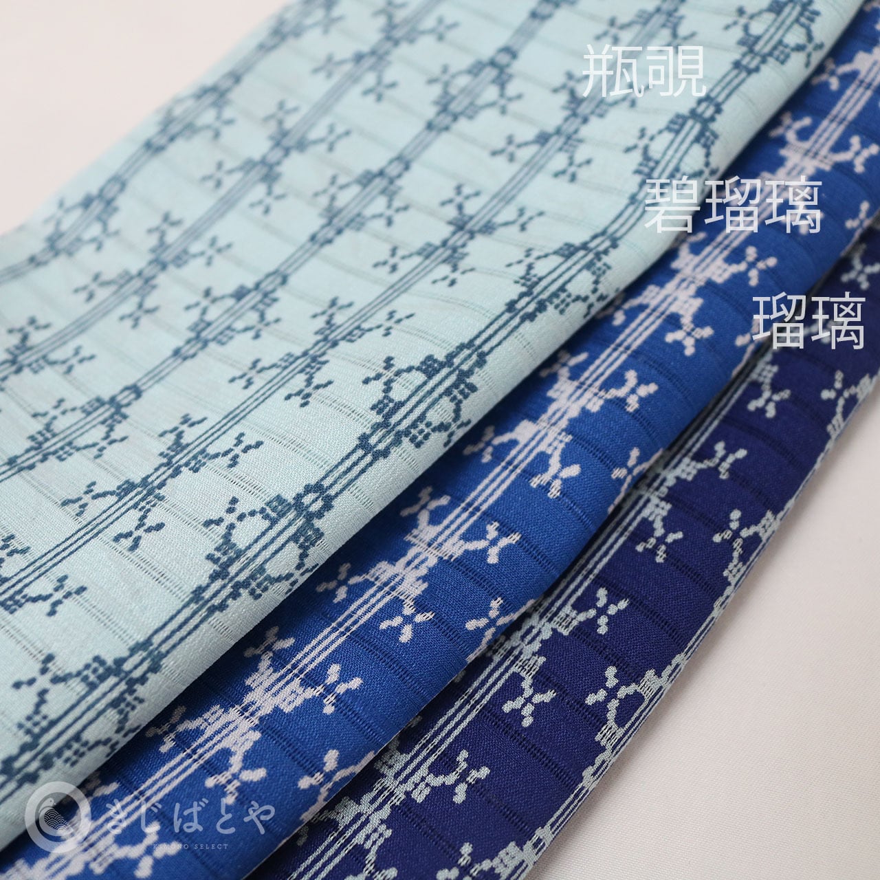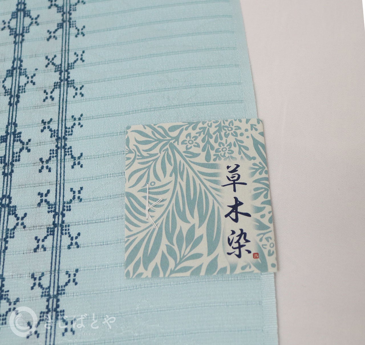 地は瓶覗(かめのぞき:淡い青)で、「瓶を覗く程度に短く染めた」という、藍の中であかるい色です。