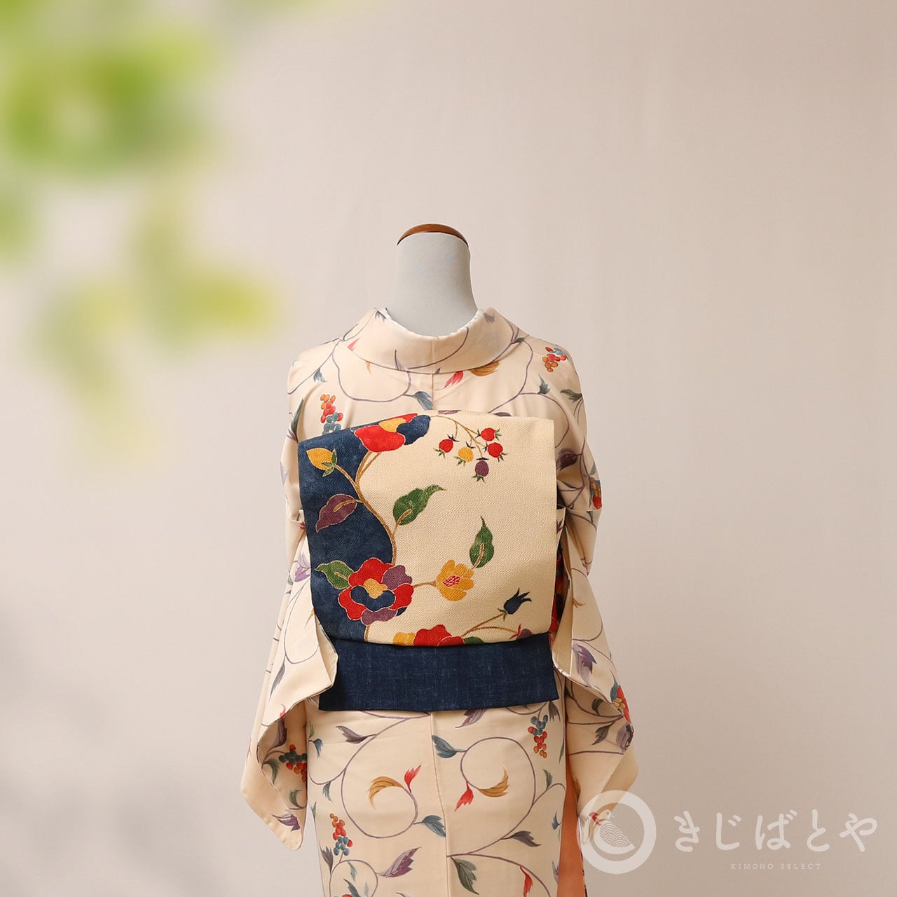 地はやわらかな白地と濃紺で、椿の柄があしらわれています。