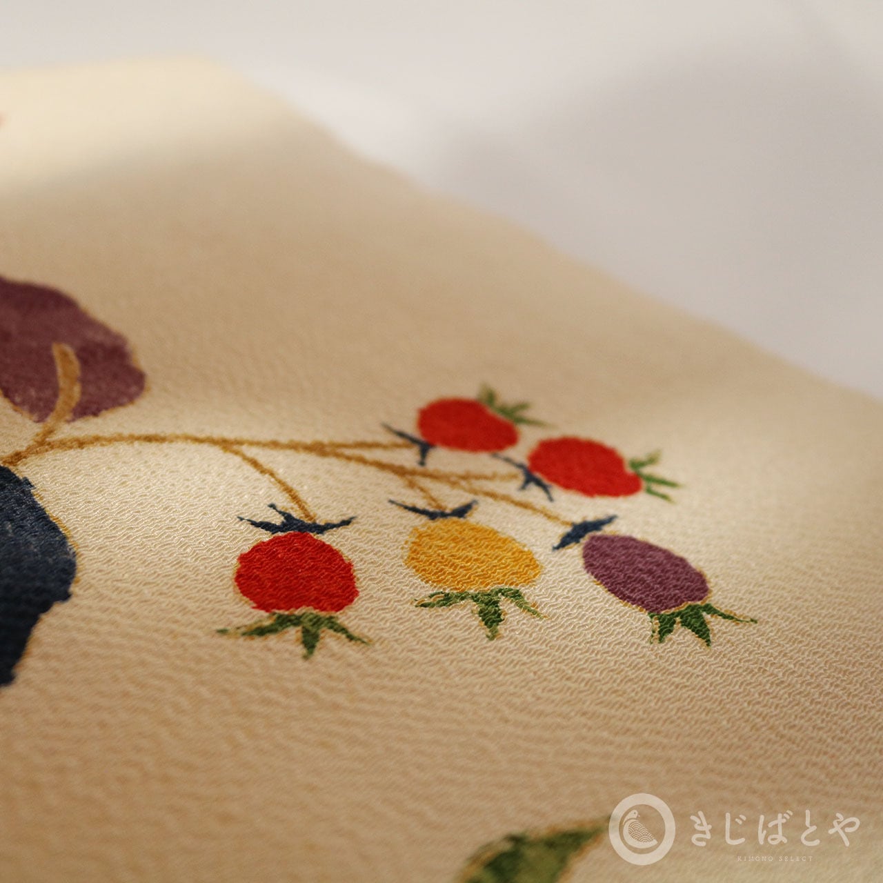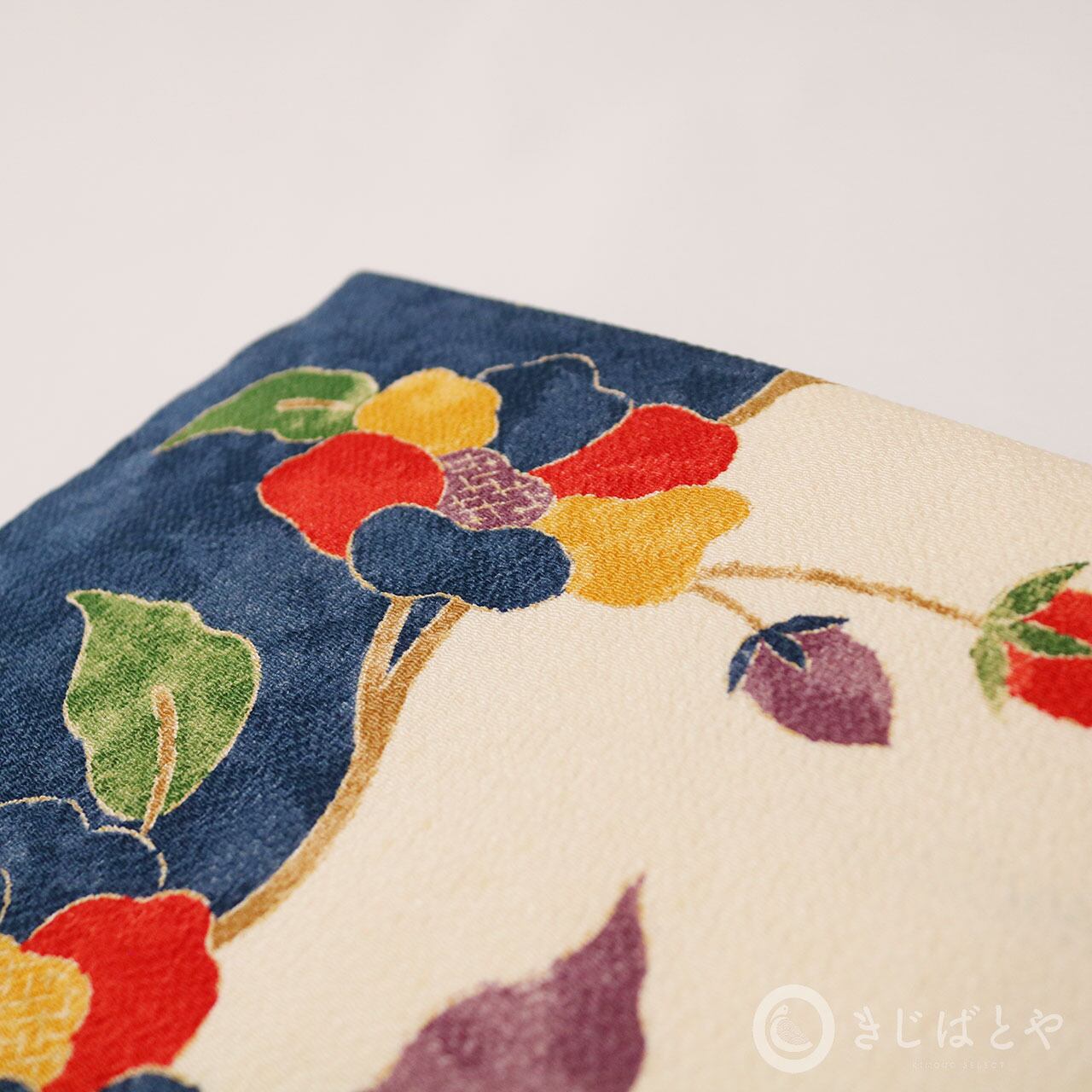 つかわれている色が深く落ち着いているため、かわいすぎず、また柄ゆきの大きさも絶妙で、着物に合わせやすくなっています。