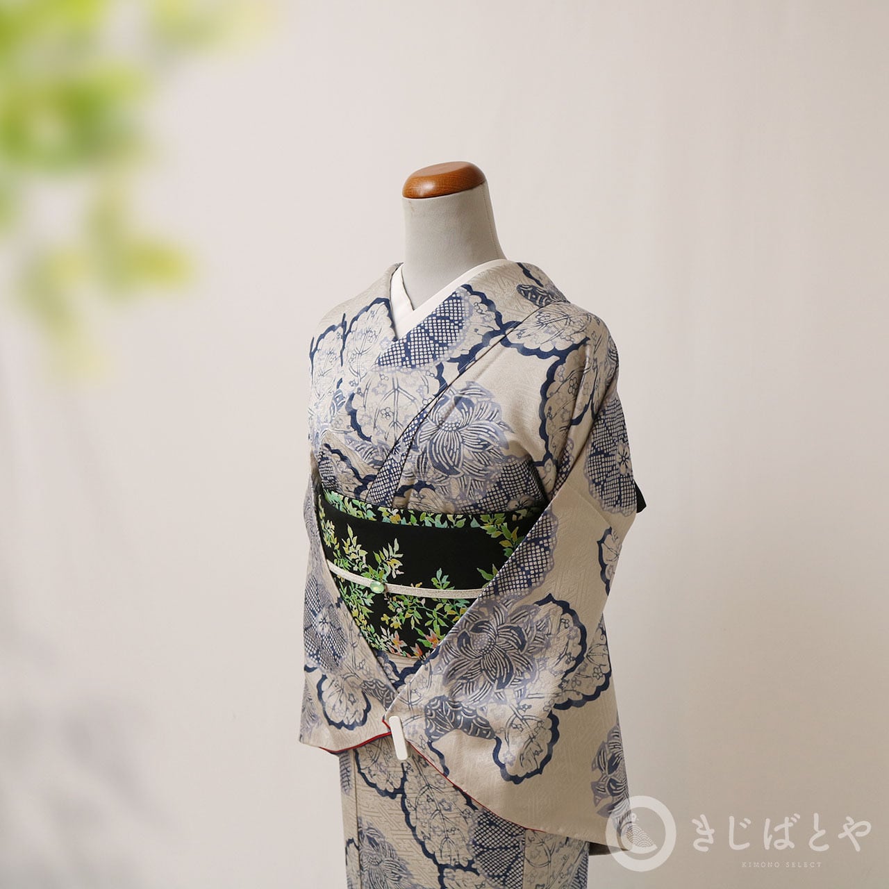 地は紗綾型が織られており、光のあたり具合によりやわらかに浮かび上がり、複雑な陰影となってとても美しいです。
