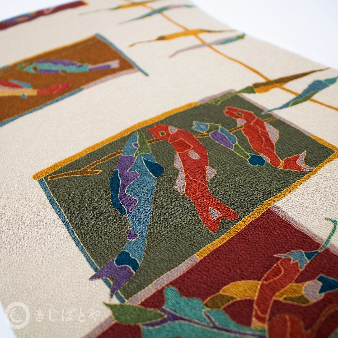 地は亜麻色(あまいろ:橙みの明るい灰)で、やわらかであたたかみのある淡いベージュ・・・というと近いでしょうか。そこに、吊るされたとうがらしと魚の柄があしらわれています。