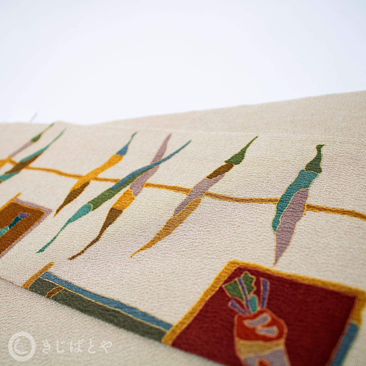 正絹ちりめん 亜麻色にとうがらしと魚のなごや