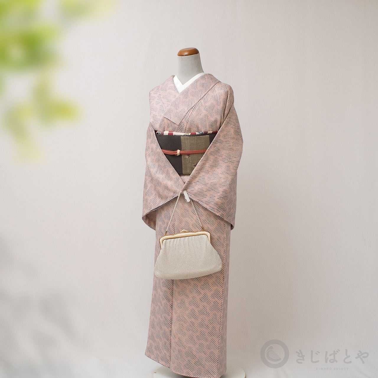 地は浅紅(あさべに:明るい紅)で、鳩羽鼠(はとばねず:紅紫みの灰)で三盛亀甲が染められています。全体にほどこされた絞りのために全体が紗をかけたように淡く霞み、なんともいえないやわらかな表情になっています。